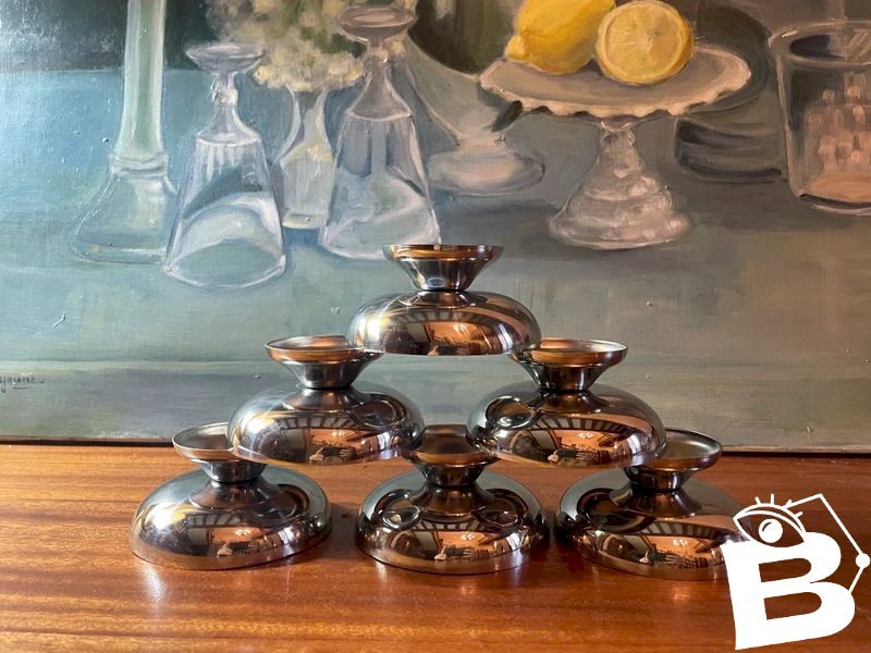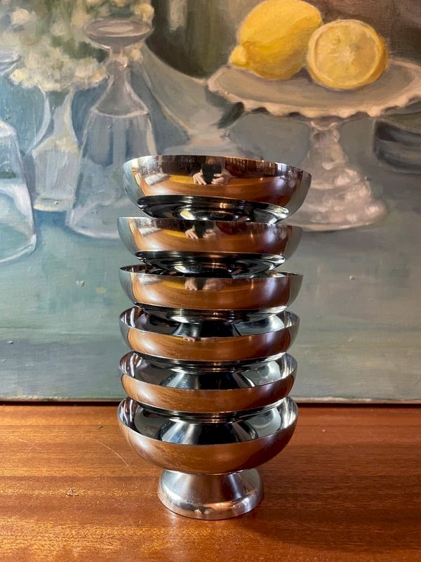 Coupes à glaces ou desserts en inox vintage Quelques traces d’utilisation à l’intérieur Très bon état Diamètre 9cm, hauteur 4,5cm