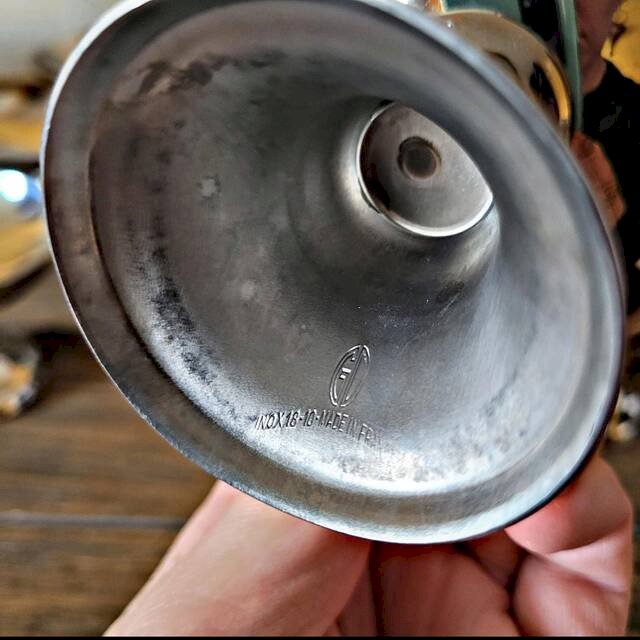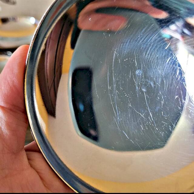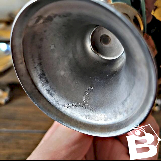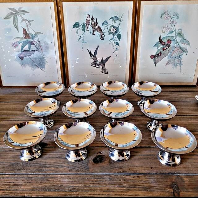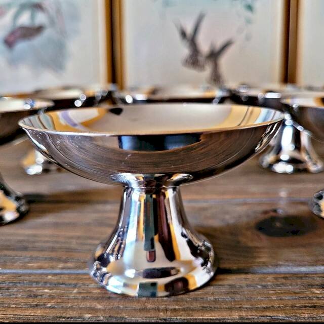 Signées Guy Degrenne, inox 18/10 fabriqué en France.Coupe ronde basse, pied “cône”.Elles ont été utilisées et présentent donc des marques de couvert (voir les photos).Elles n’en sont pas moins magnifiques et seront élégantes sur votre table !? Diamètre 9, 2 cm et hauteur 5, 9 - 6 cm environ.Poids des 12 coupes: environ 1300 gr.