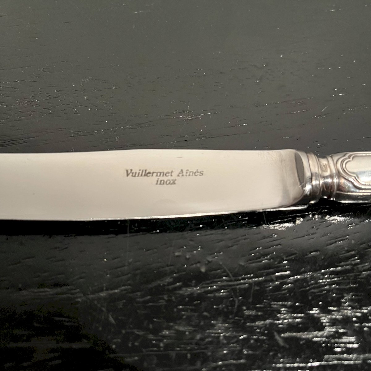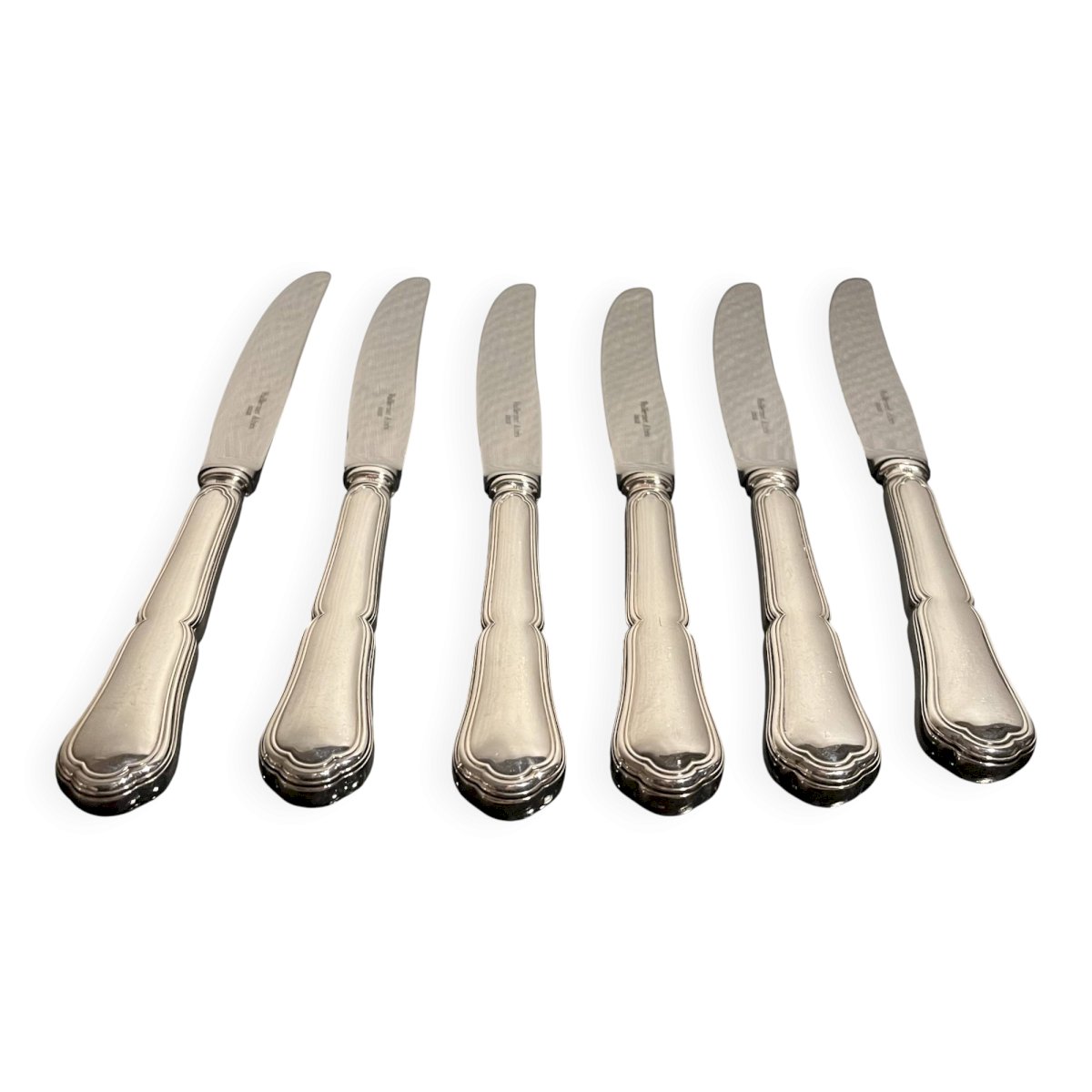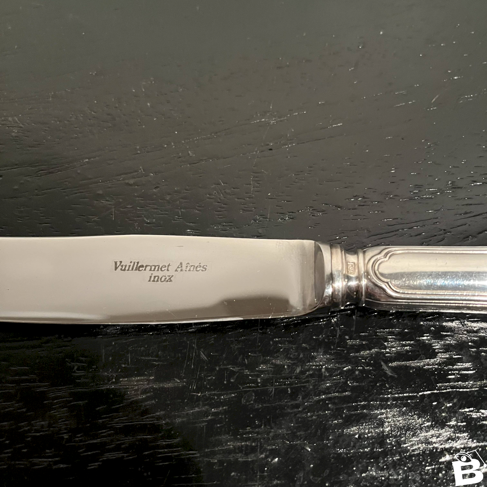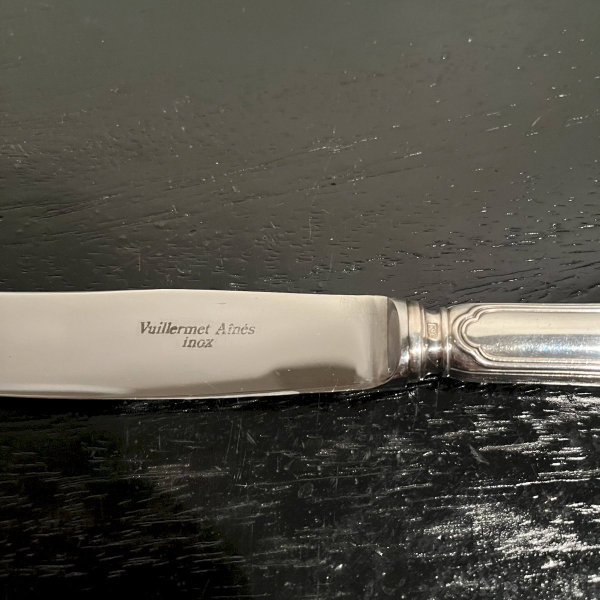 Lot de 6 couteaux en métal argenté et lame en inox gravé Vueillermet Ainés.Longueur: 26 cm - Lame: 14 cm.
