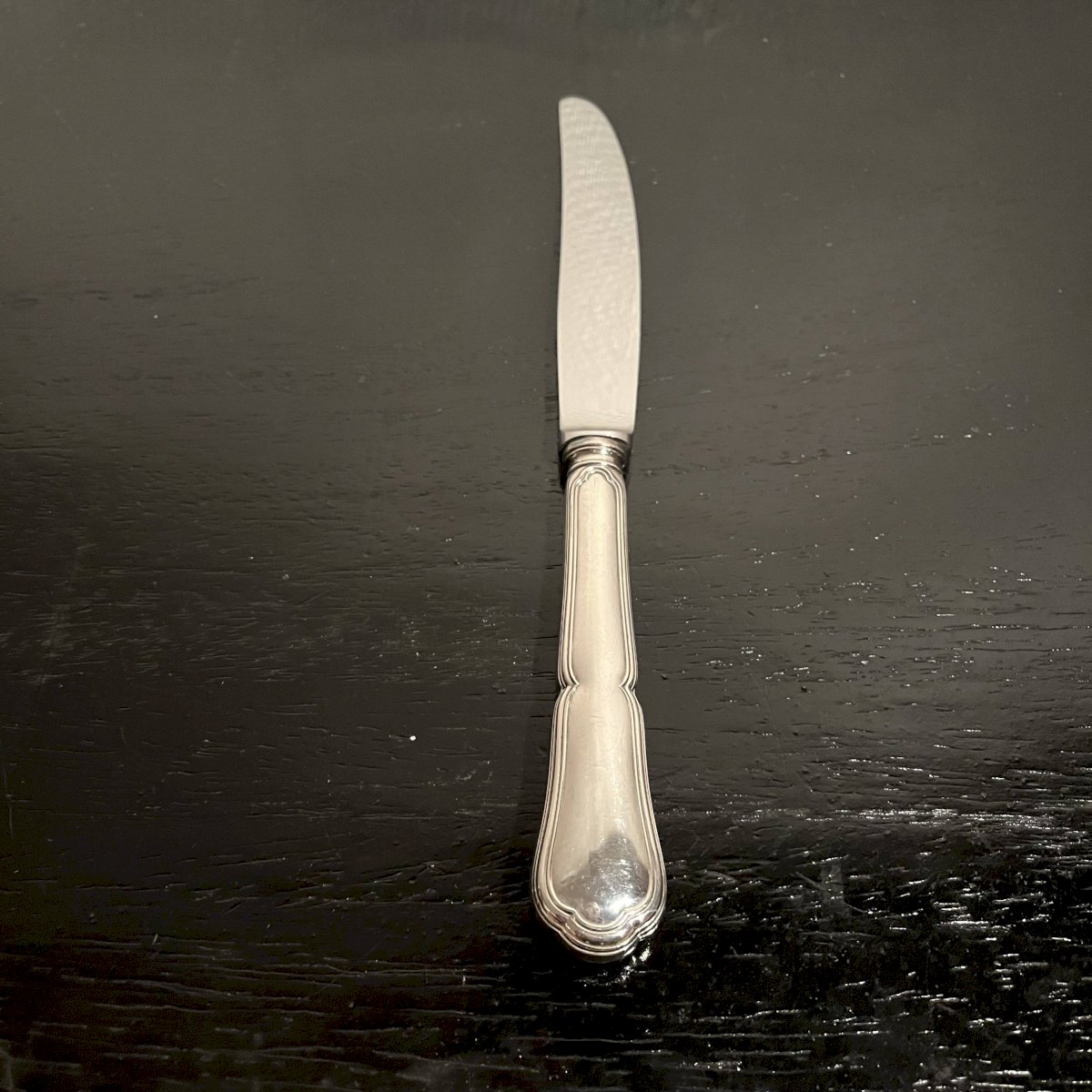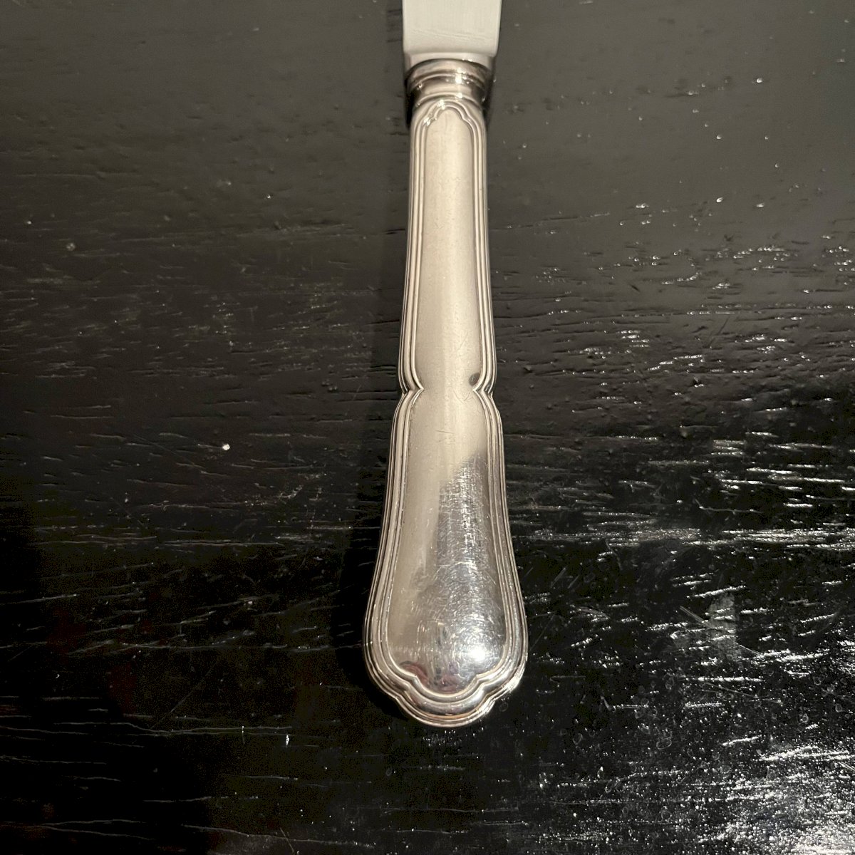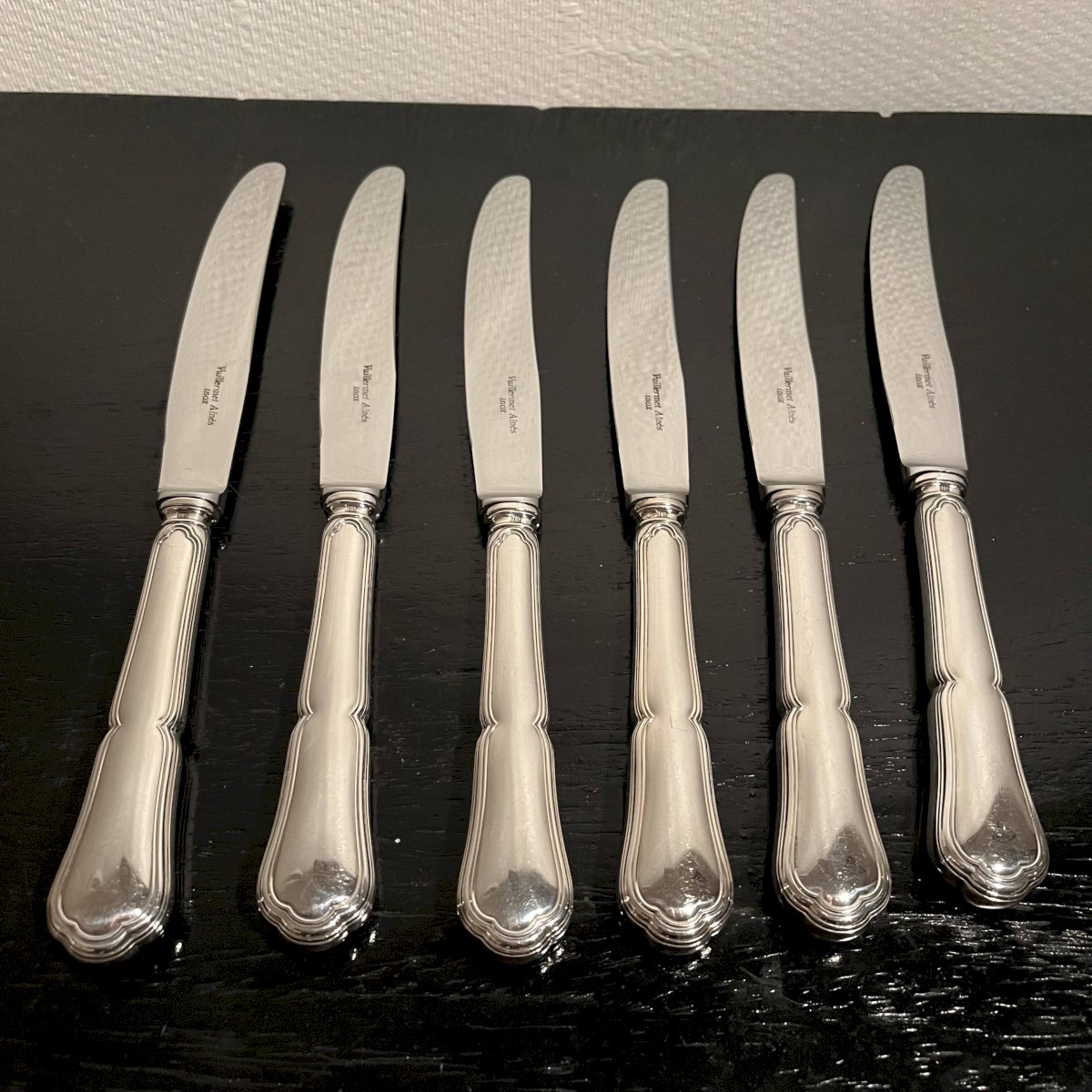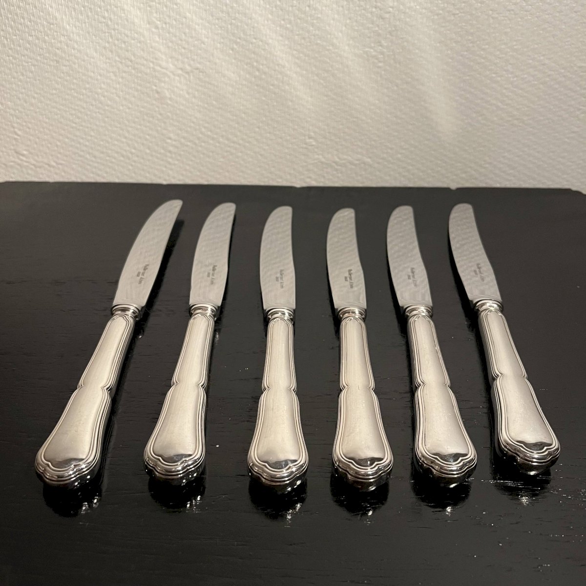 Lot de 6 couteaux en métal argenté et lame en inox gravé Vueillermet Ainés.Longueur: 26 cm - Lame: 14 cm.
