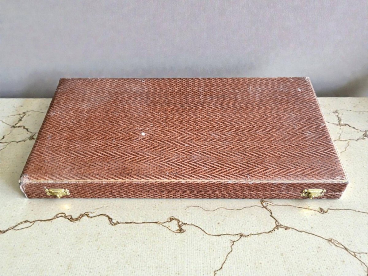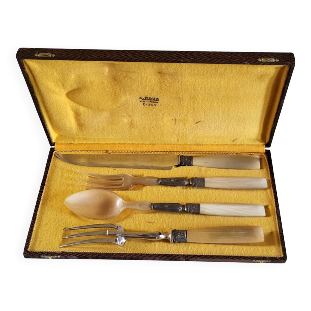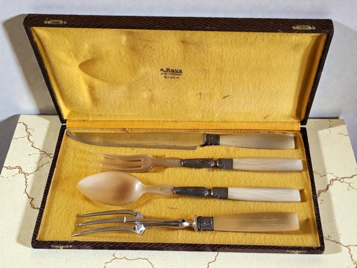 Couverts de service, à gigot et à salade.Manche en bakélite / Lame acier inoxydable et Acier forgé.Le tout dans son étui d'origine.En bon état / Emballage soigné et livraison rapide.Dimensions boite H.3, 5 Dim.