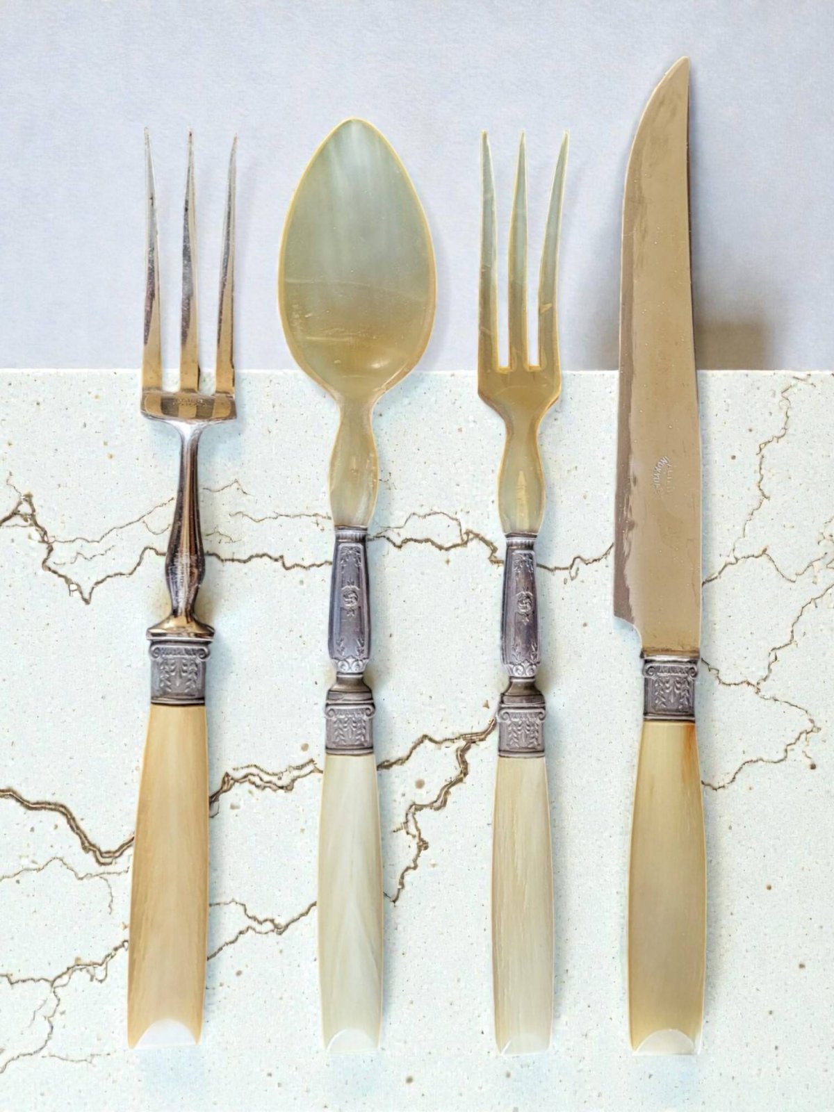 -ANCIEN COUVERT A SALADE MANCHES ARGENT Fourré Fourchette & Cuilleron en CORNE D