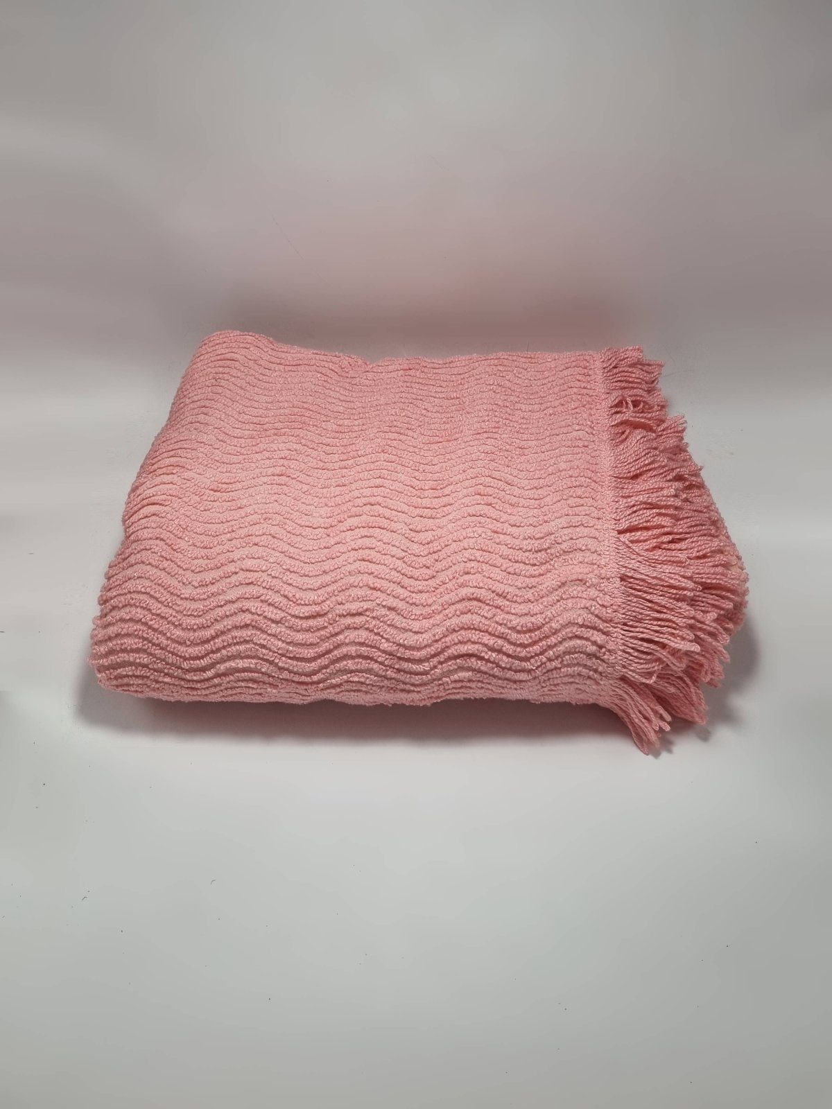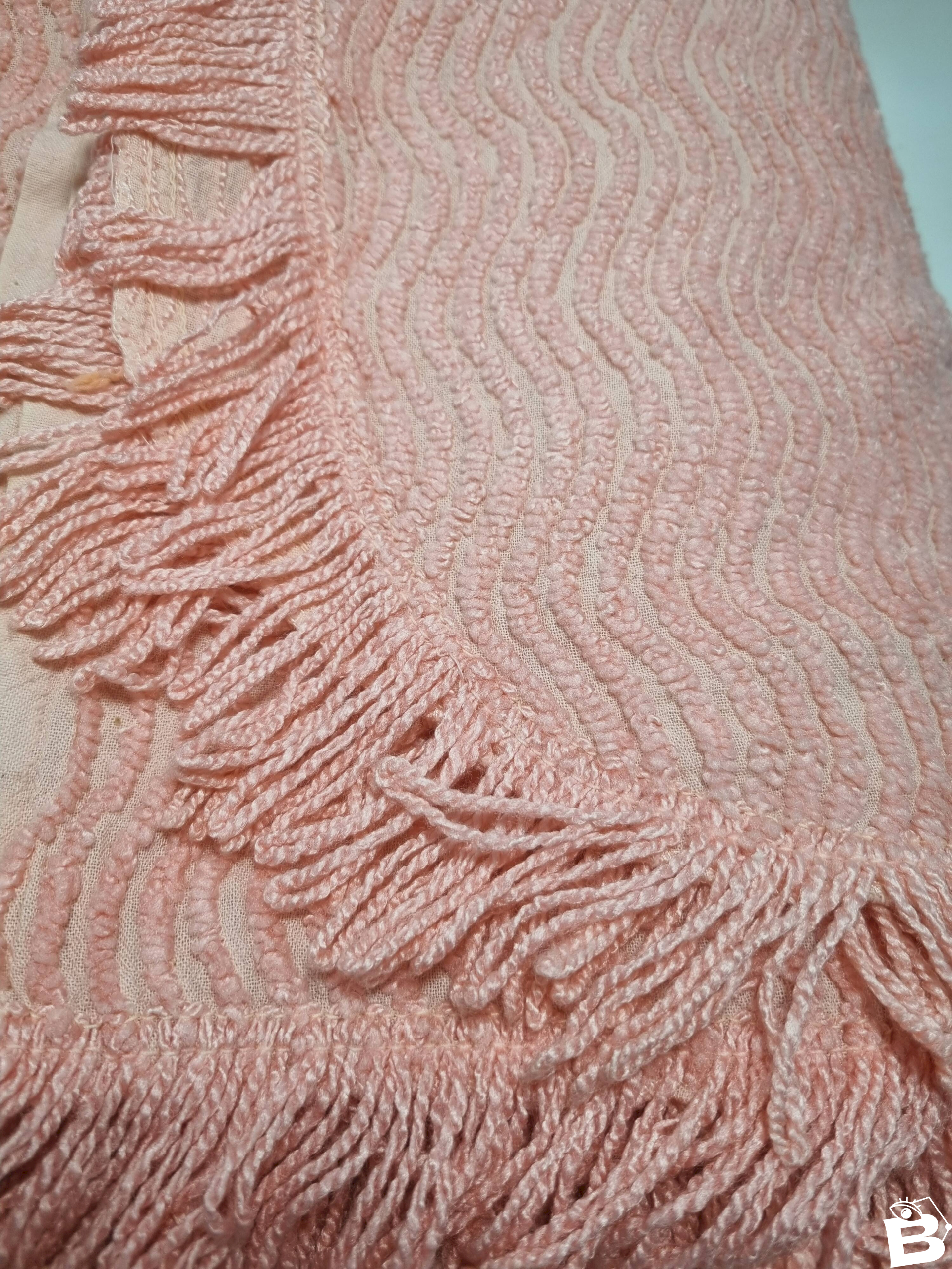 Plaid ou couvre-lit chenille vintage rose, « made in England », un classique des années 50/70, parfait pour une chambre de petite fille.Il a deux angles droits et deux arrondis (voir photo.) et des franges sur trois côtés.Dimensions: 150 X 240 cm (hors franges)Poids: environ 1 kg.