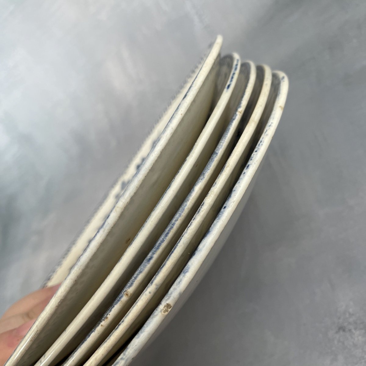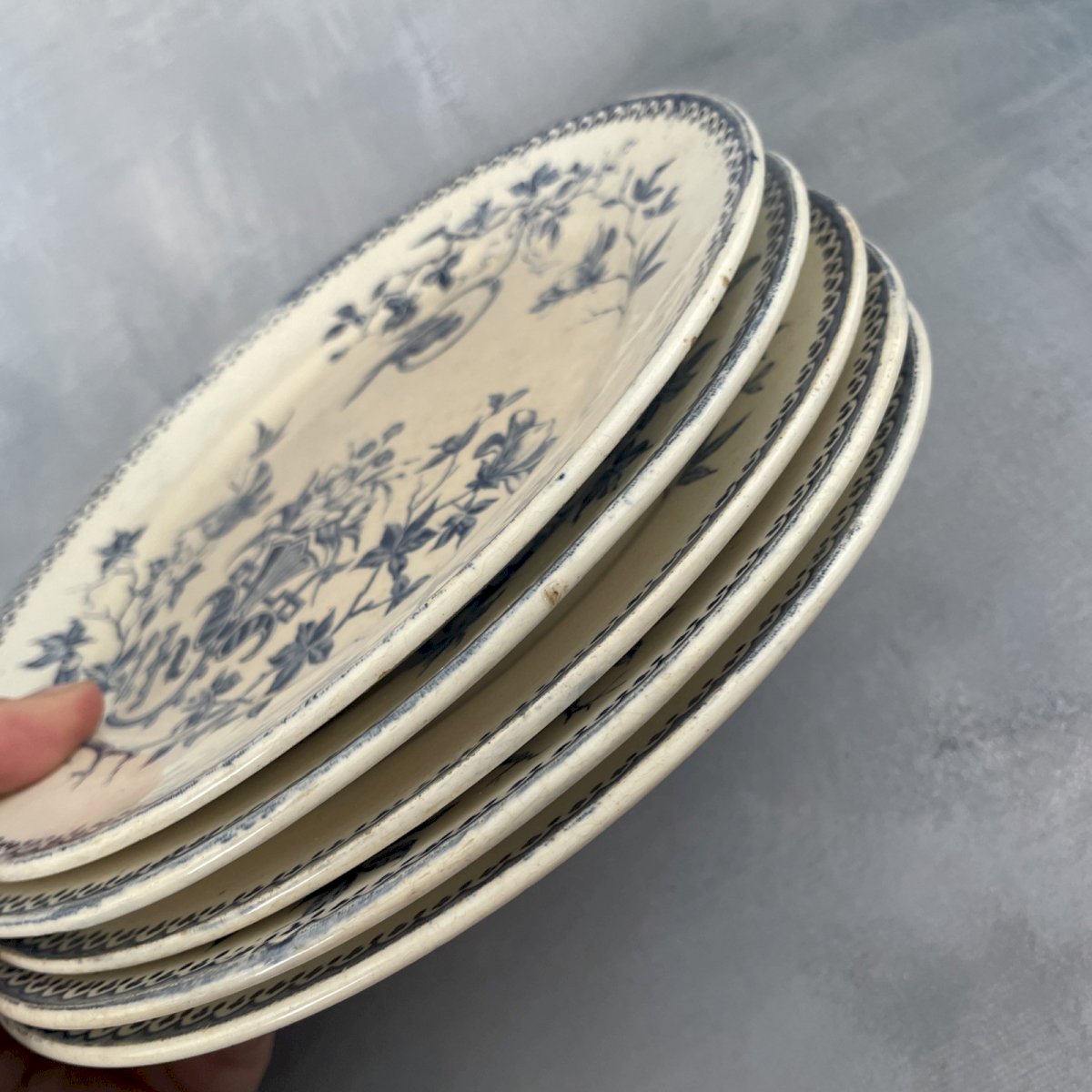 CREIL ET MONTEREAU lot 5 petites assiettes à dessert terre de fer décor PERRUCHE ~20.5cm Diamètre ~ 20.5 cm Poids total ~ 1.6 kg Globalement en très bel état, traces du temps, belle patine, présences de taches, rayures et quelques egrenures, voir photos. Pensez à grouper vos achats pour réduire les frais de port ! Pays d'origine:France