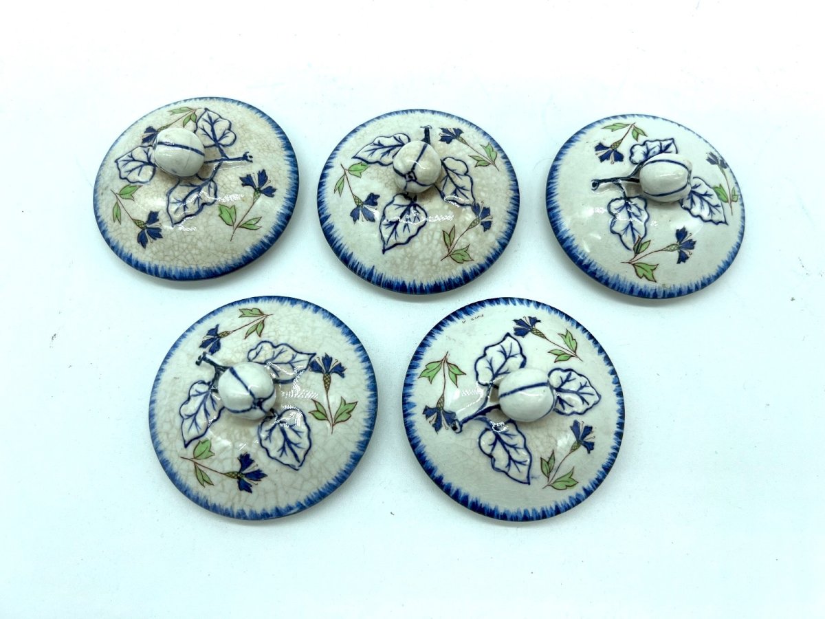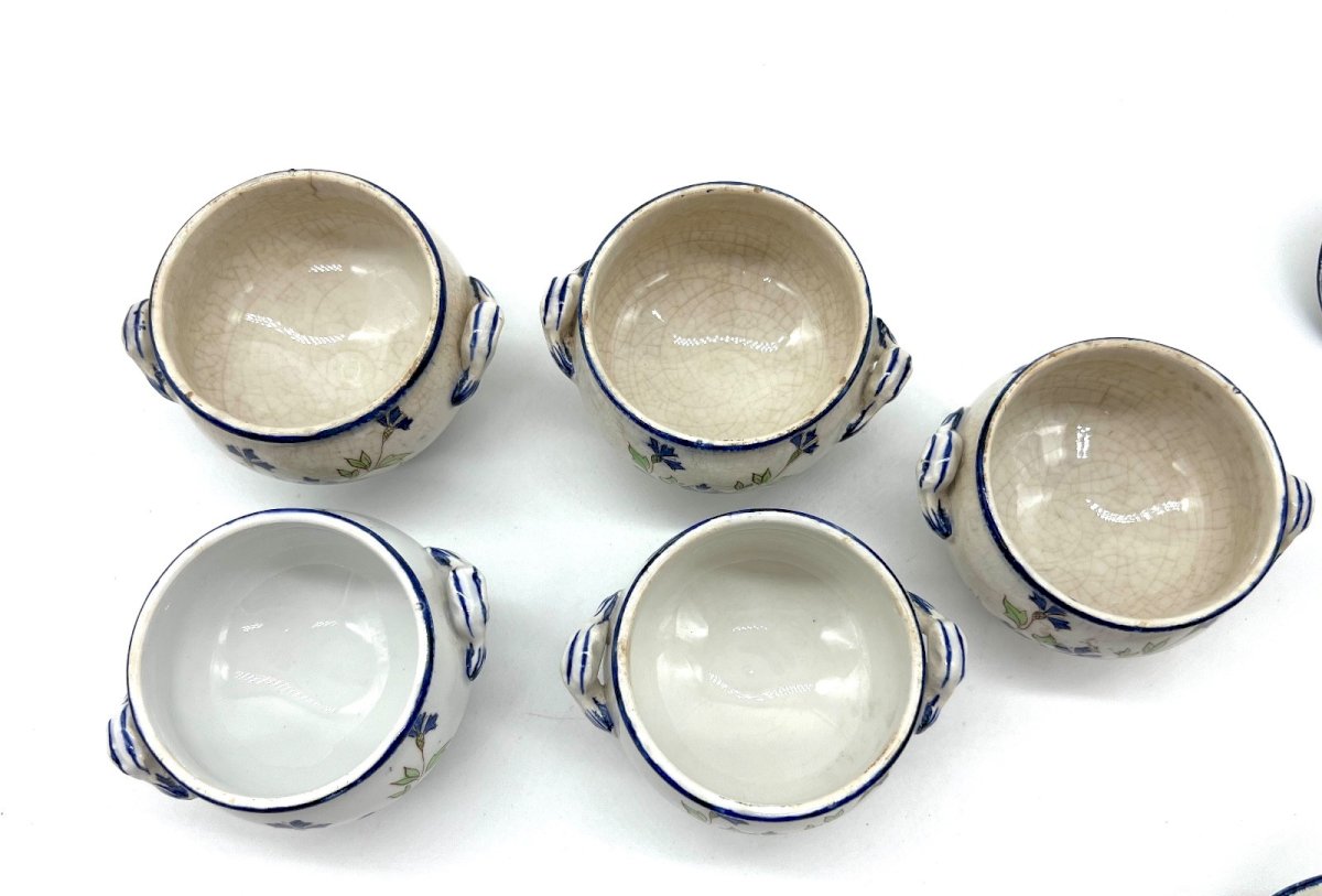 Ensemble de 5 pots de crème – Creil & Montereau – Service Barbeau / Labrador – XIXᵉ siècle Ces cinq petits pots de crème en faïence fine portent la signature élégante et reconnaissable des faïenceries de Creil & Montereau . Leur décor de bleuets bleus et feuillages verts , typique du Service Barbeau, évoque une douceur champêtre et l’art de vivre français du XIXᵉ siècle. Chaque pot possède son couvercle d’origine, et l’ensemble forme une composition harmonieuse, idéale pour une collection, une cuisine “French country” ou une mise en scène décorative raffinée. Caractéristiques Manufacture : Creil & Montereau Modèle : Service Barbeau – Labrador Époque : Fin XIXe siècle Faïence fine décorée de bleuets Ensemble complet : 5 pots + 5 couvercles Dimensions Hauteur : 7 cm (2.75 in) Diamètre : 6 cm (2.36 in) État Très bon état général, avec une patine naturelle (craquelures d’émail). ➝ Un petit éclat discret sur l’un des pots (montré en photo). Marque au revers “Creil & Montereau – Labrador – Service Barbeau – Sans Plomb” Envoi très soigné , parfaitement protégé. Type:Pot de crème / Pot à dessert Pays d'origine:France Décor:Fleurs / Bleuets