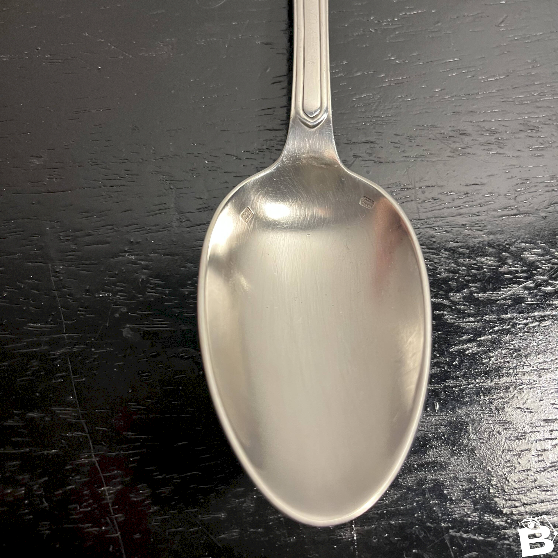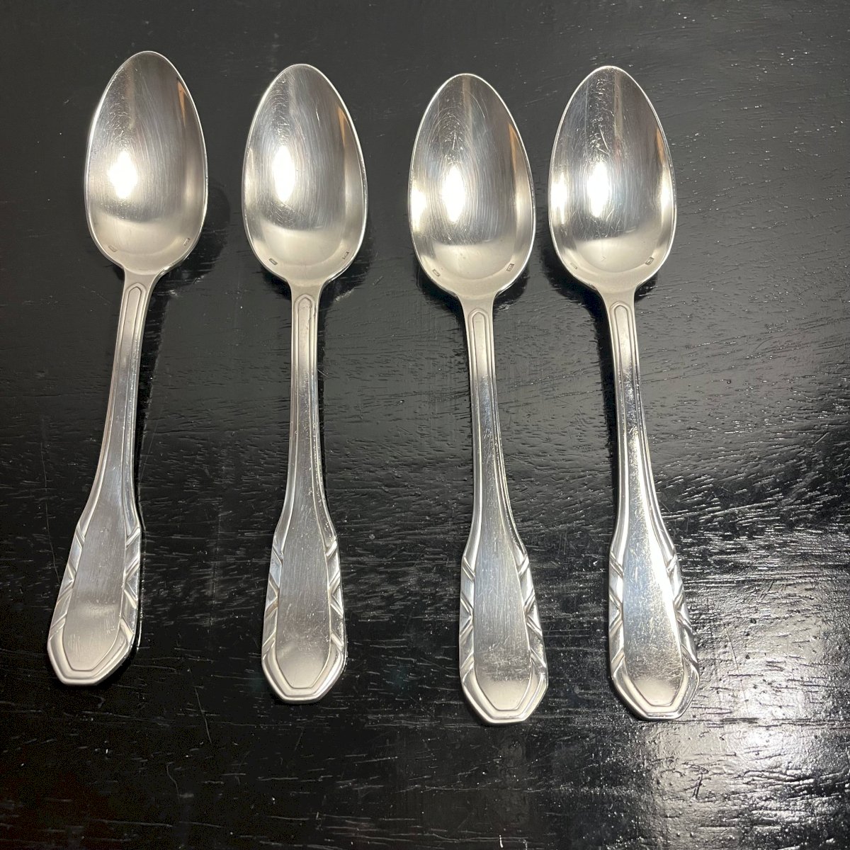 Lot de 4 cuillère à soupe en métal argenté dans l'esprit Art Déco.Longueur: 21 cm.Fourchettes et petites cuillères assorties.N'hésitez pas à regrouper vos achats pour économiser sur vos frais d'expédition.