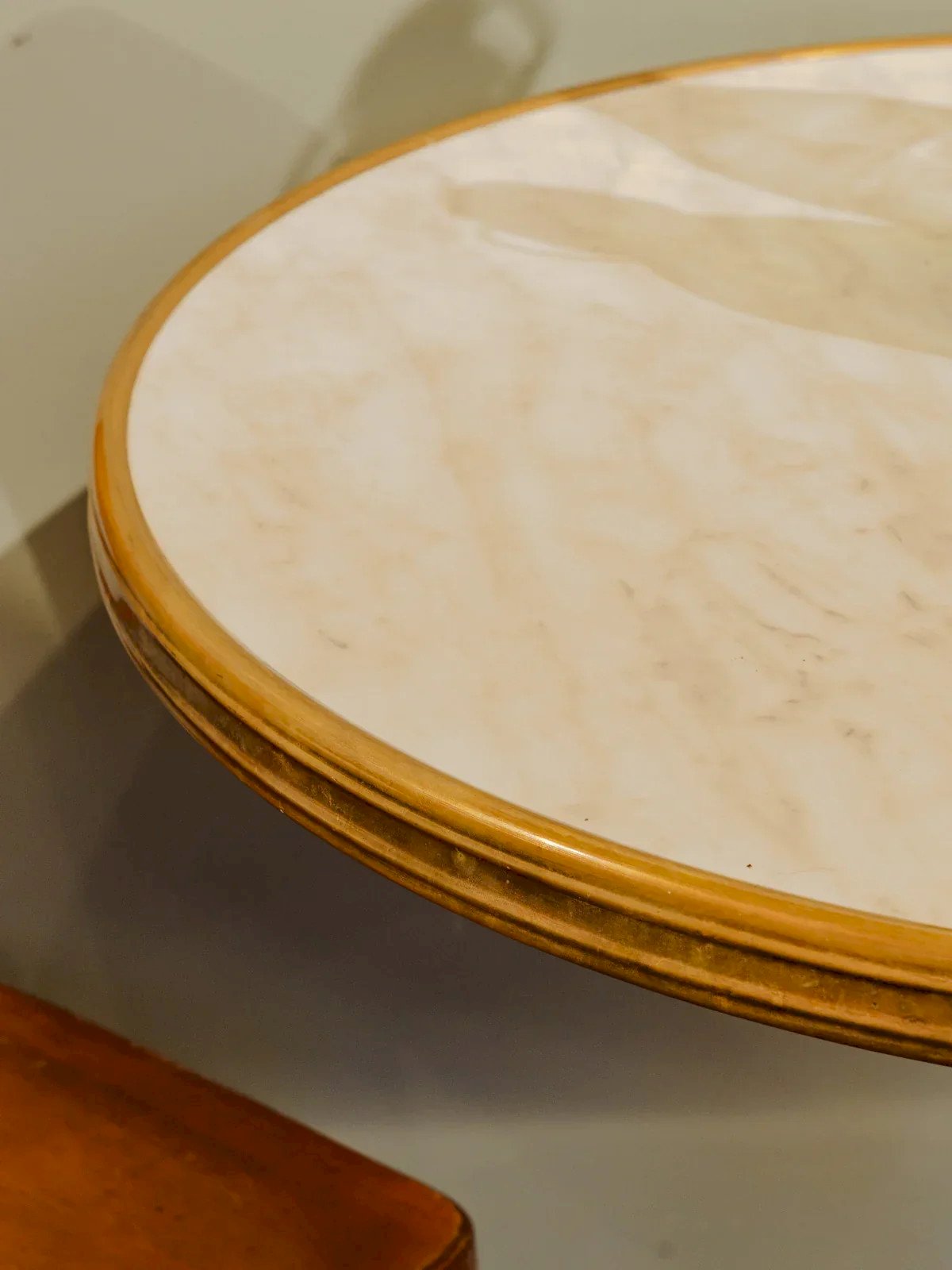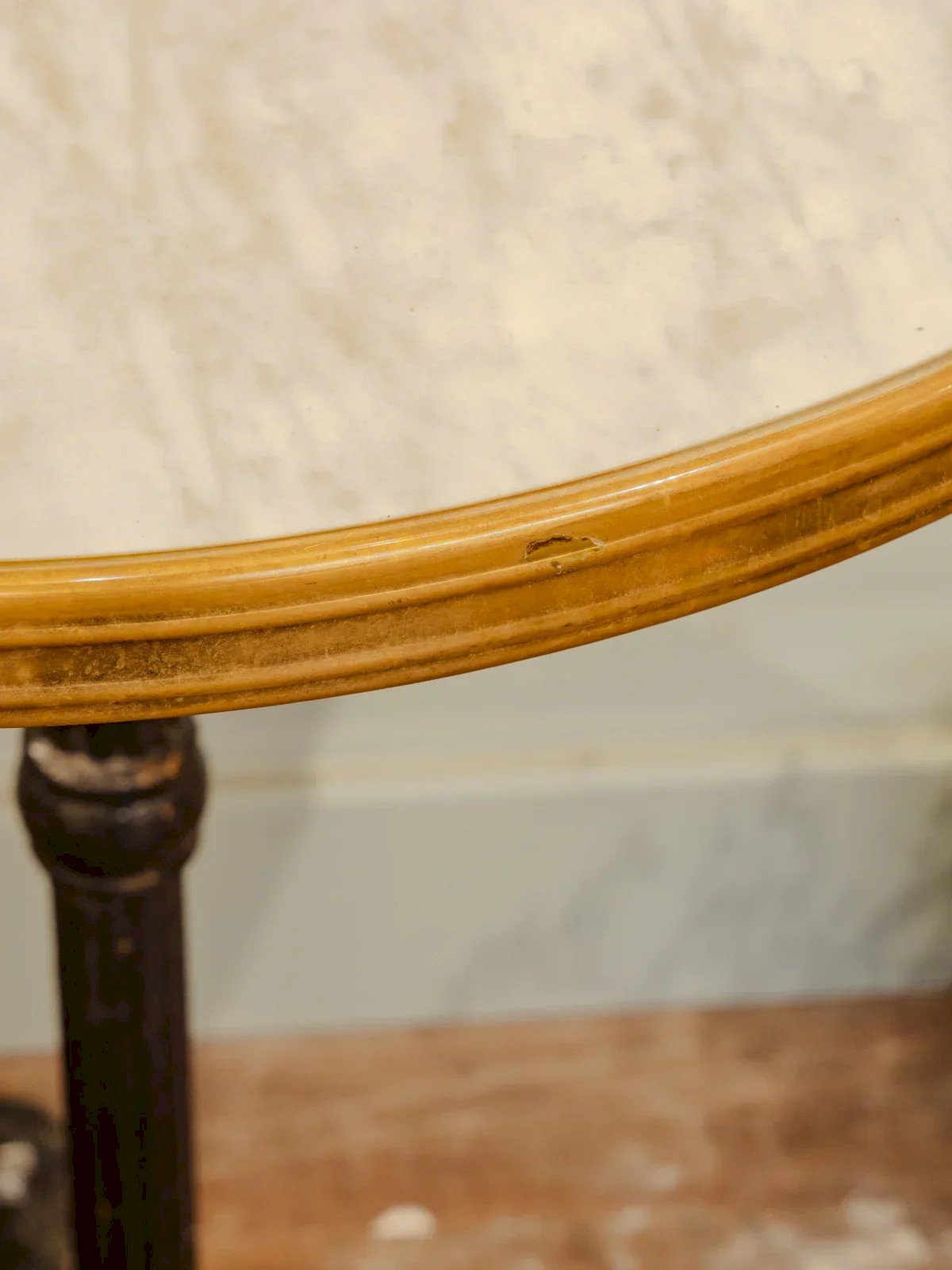 Invitez une atmosphère parisienne à votre intérieur avec cette table de bistrot au plateau en stratifié moulé effet marbre, reposant sur des pieds en métal noir et soulignée d'un cerclage en laiton doré. Son format pensé pour accueillir confortablement deux à quatre convives, en fait une pièce idéale pour un coin café ou un petit repas convivial. L'association marbre-métal apporte une élégance sobre et une belle présence sculpturale dans tout espace. Quelques traces d'usage qui participent à son charme. Hauteur : 73 cm Diamètre : 60 cm État:Occasion: Objet ayant été utilisé. Objet présentant quelques marques d'usure superficielle, ...Occasion: Objet ayant été utilisé. Objet présentant quelques marques d'usure superficielle, entièrement opérationnel et fonctionnant correctement. Il peut s'agir d'un modèle de démonstration ou d'un objet retourné en magasin après une courte période d'utilisation. les éventuelles imperfections. Marque:Debongout Type:Produit chiné Matériau:Métal, Laiton Style:Campagne Personnalisé:Tables à manger