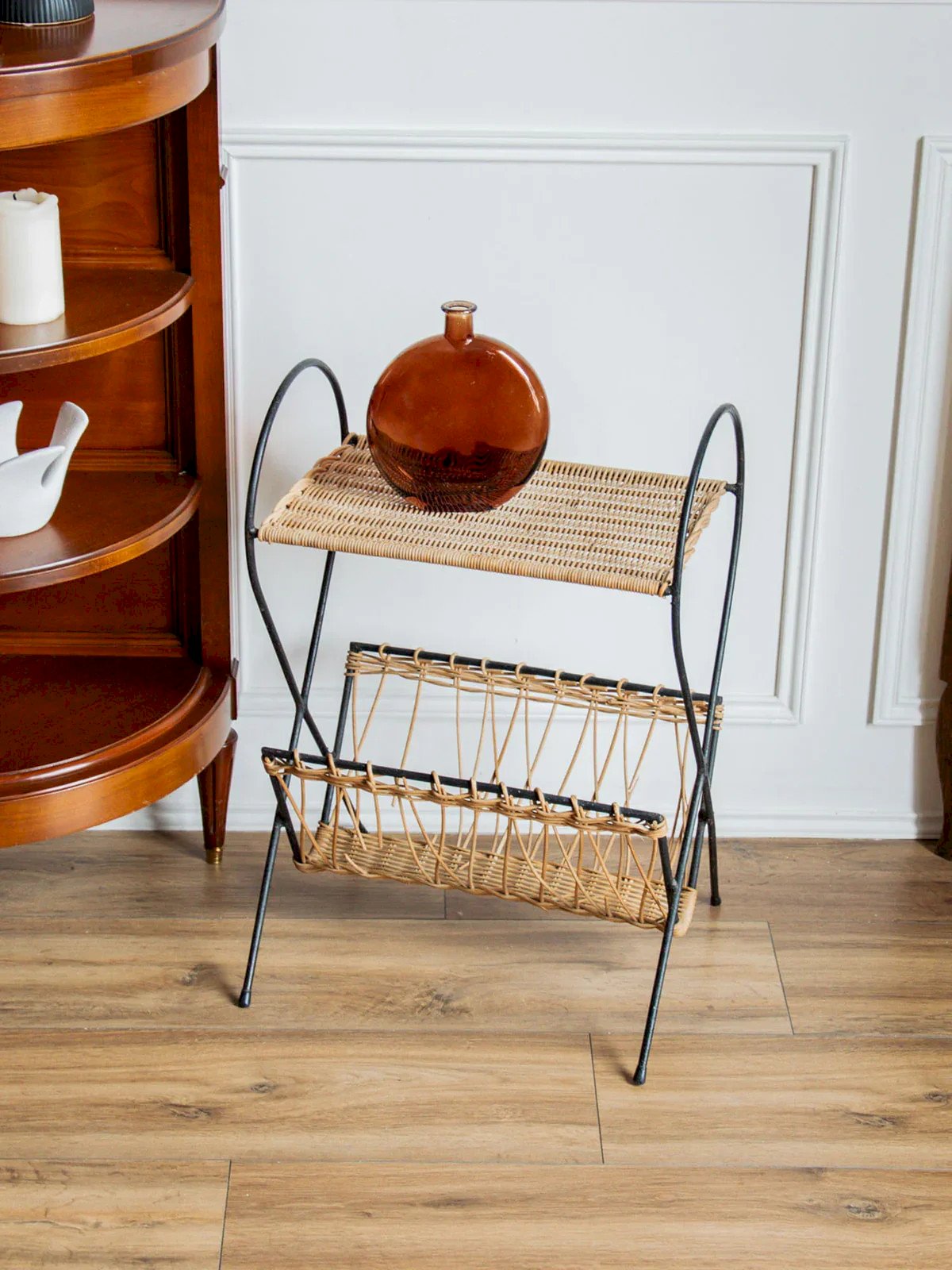 Ce porte-revues en osier et métal noir joue la double fonction de rangement et de petite table d’appoint. On l’aime pour son look à la fois graphique et naturel, parfait pour glisser quelques magazines ou poser une tasse à côté du canapé. Une belle façon d’apporter une touche de charme et de légèreté à son salon, tout en gardant un espace bien organisé. Longueur : 39 cm Hauteur : 58 cm Profondeur : 24,5 cm Petite histoire du porte-revues Le terme "porte-revues" apparaît au début du XXe siècle, lorsque journaux et magazines deviennent courants dans les foyers. Ce meuble, souvent en bois ou en métal, est conçu pour organiser et exposer les publications imprimées. D'abord présent dans les salons et salles d'attente, il incarne l'ordre et l'accès à la culture. Aujourd'hui, le porte-revues s'adapte à tous les styles d'intérieur, offrant une touche décorative bien pratique. État:Occasion: Objet ayant été utilisé. Objet présentant quelques marques d'usure superficielle, ...Occasion: Objet ayant été utilisé. Objet présentant quelques marques d'usure superficielle, entièrement opérationnel et fonctionnant correctement. Il peut s'agir d'un modèle de démonstration ou d'un objet retourné en magasin après une courte période d'utilisation. les éventuelles imperfections. Marque:Debongout Type:Produit chiné Matériau:Métal, Osier Style:Campagne