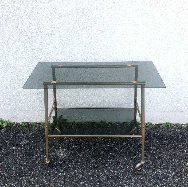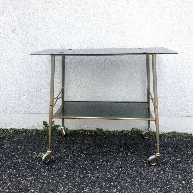 Cette superbe desserte vintage des années 60, véritable icône du style Mid-Century, se distingue par sa structure aérienne en métal combinée à ses plateaux en verre fumé qui apportent une profondeur visuelle.