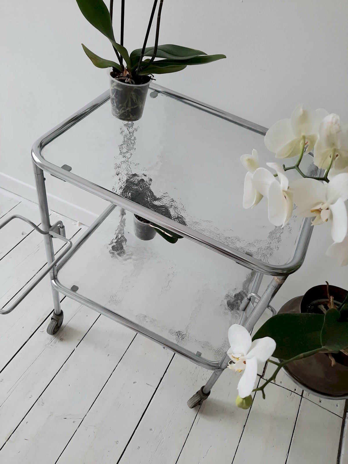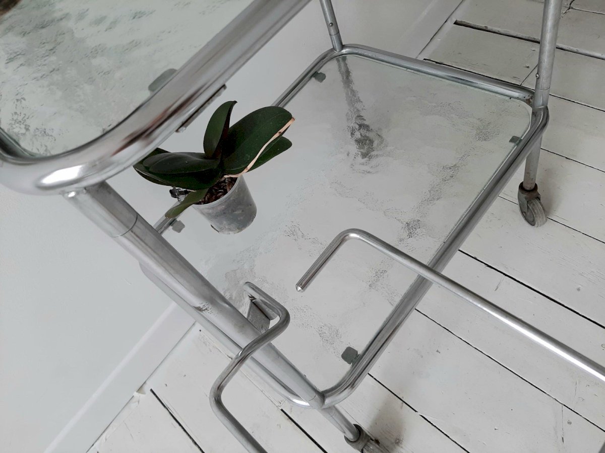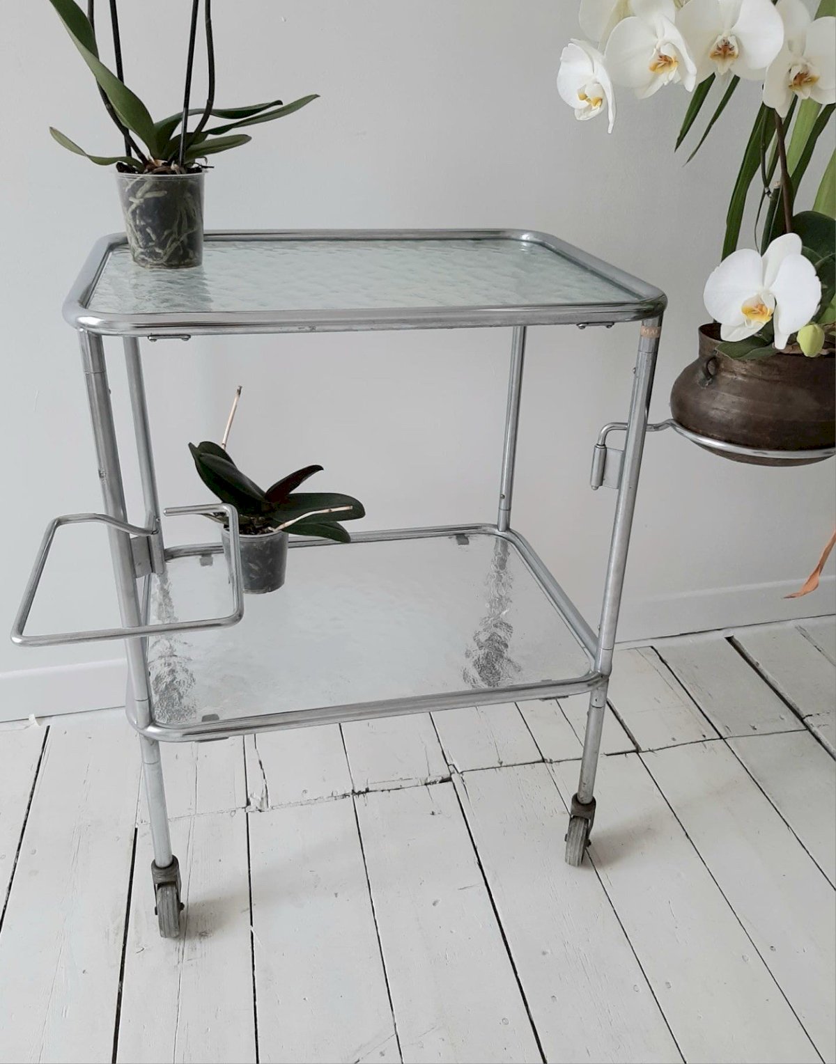 Merci de m’écrire si vous souhaitez me faire une offre. Desserte vintage, bar, guéridon vintage Table roulante années 70. Dimensions 50x65xh83cm. Sur roulettes. A utiliser en guéridon, bout de canapé, porte plantes, console, etc. Structure en métal chromé, 2 plateaux en verre texturé. 2 rangements rectangulaires et ronds mobiles. Traces d’usage discrètes. Remise à mon domicile ou livraison possible via transporteur (ex 50€ vers Paris et région parisienne, me contacter pour d’autres destinations). Les délais de livraison de 2 à 4 jours sont imposés par et sont donc donnés à titre purement indicatif. ancien design meuble métier appoint Sous-type:Desserte Type:Table