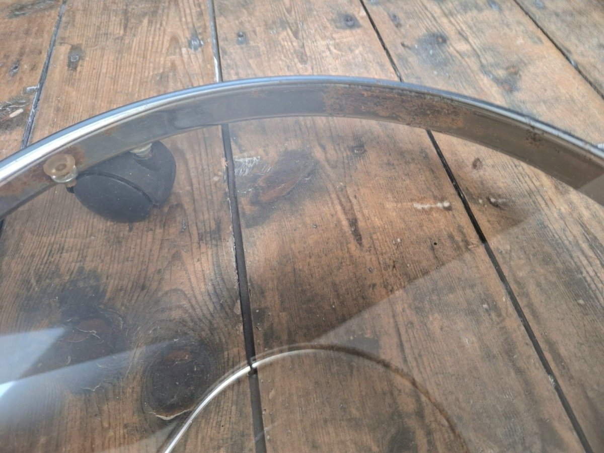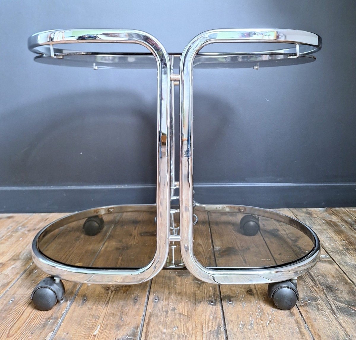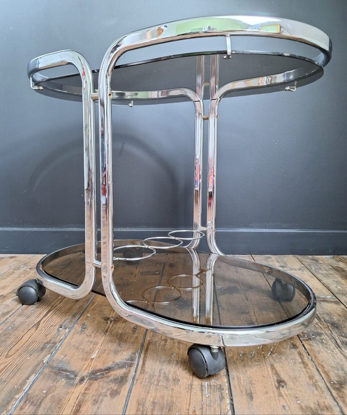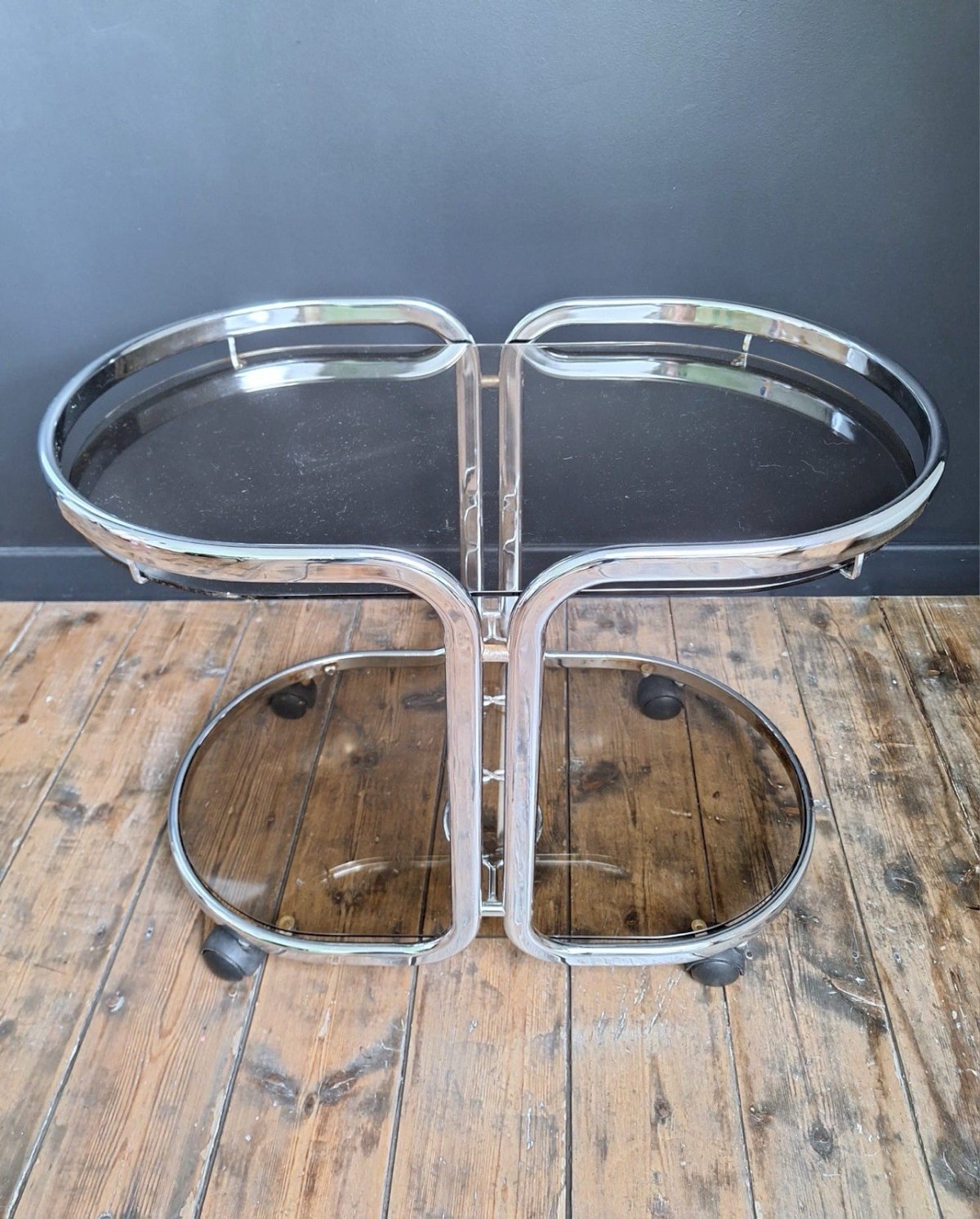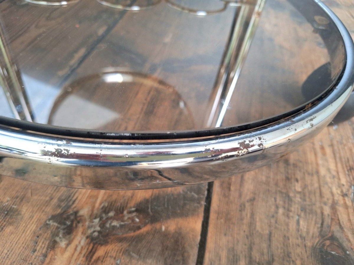 Merci de m’écrire si vous souhaitez me faire une offre. Desserte vintage, bar, guéridon vintage Table roulante années 70. Dimensions 75x44xh60cm. Sur roulettes. A utiliser en guéridon, bout de canapé, porte plantes, console, etc. Structure en métal chromé, 2 plateaux en verre fumé. Un rangement pour les bouteilles. Belles formes arrondies. Traces d’oxydation, essentiellement sur la partie basse, quelques éclats, coups et griffes. Remise à mon domicile ou livraison possible via transporteur (ex 50€ vers Paris et région parisienne, me contacter pour d’autres destinations). Les délais de livraison de 2 à 4 jours sont imposés par et sont donc donnés à titre purement indicatif. Space age design meuble appoint Sous-type:Desserte Type:Table