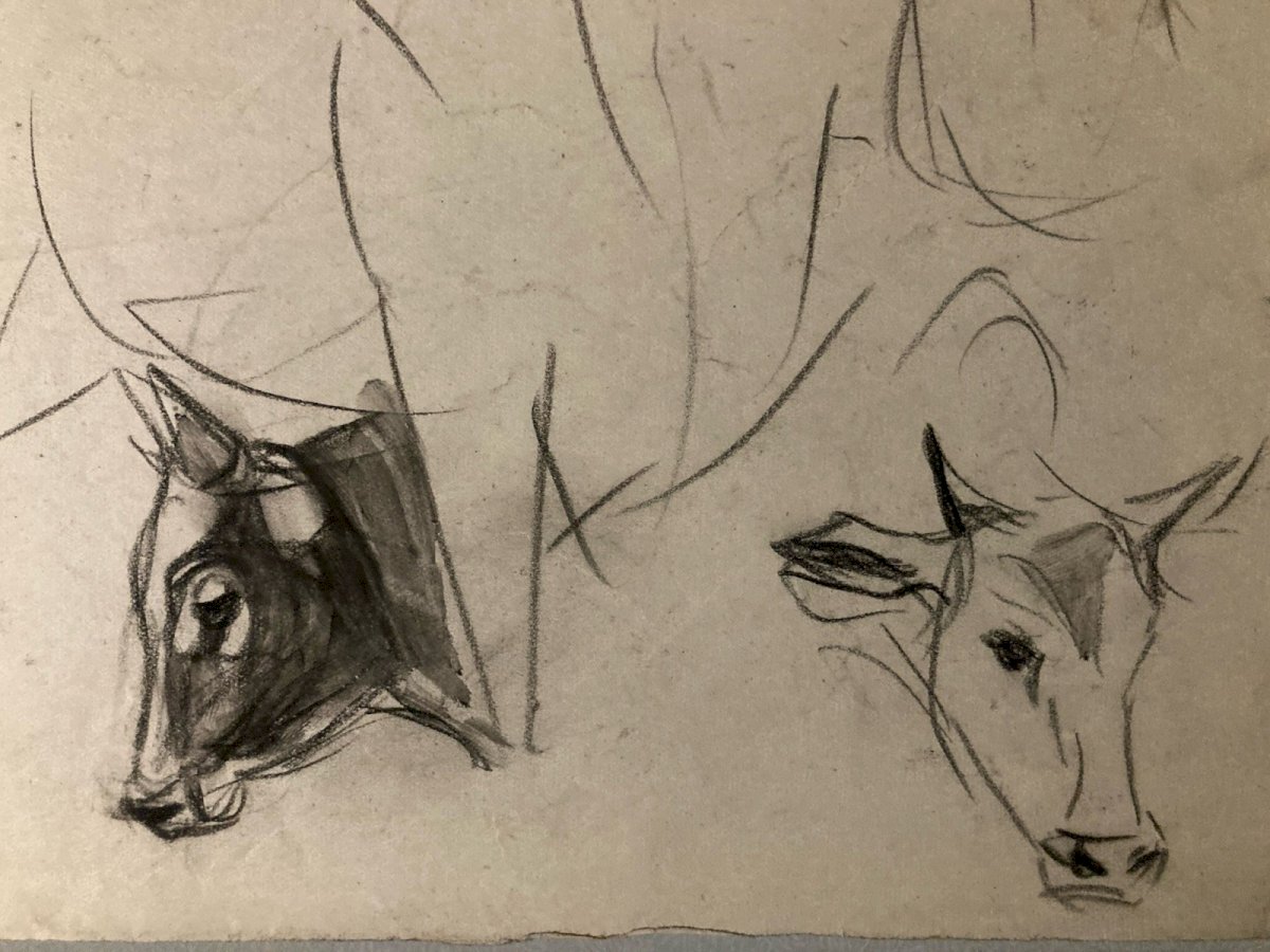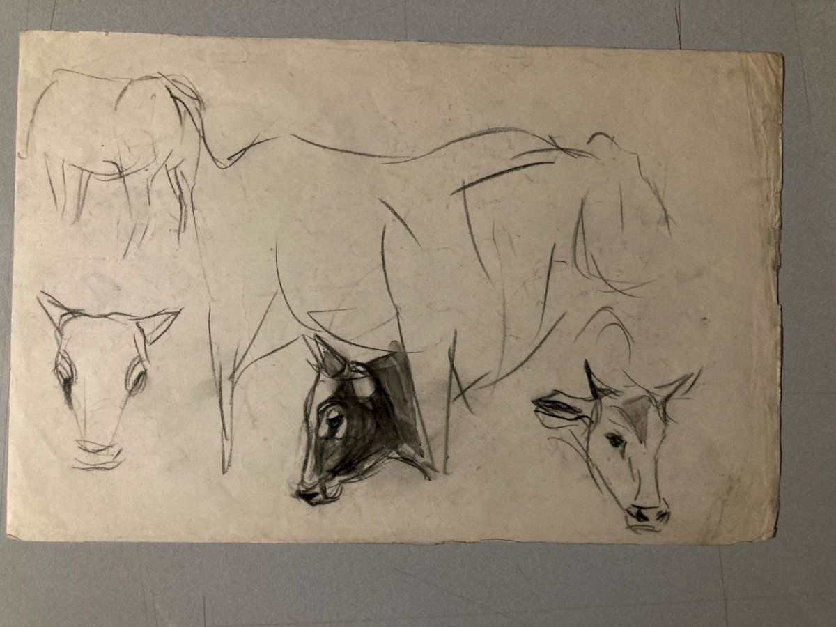 Dessin 1900 Crayon Vache École Américaine Animalier Animal Animaux Art