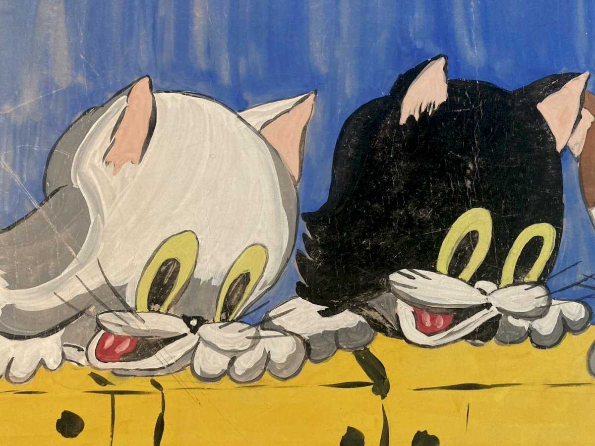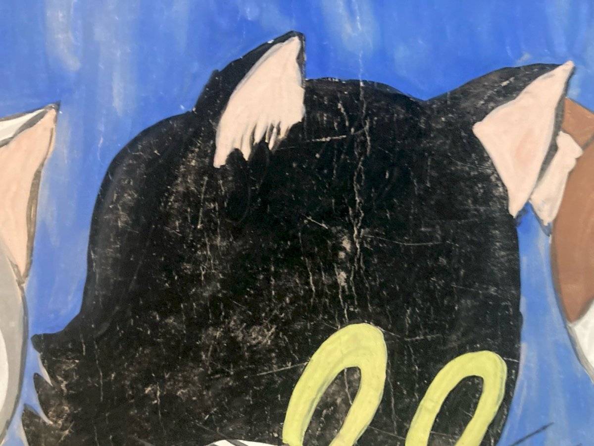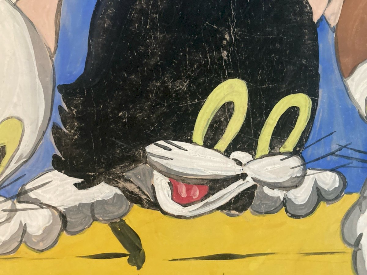 Dessin 1960 Peinture Papier Gouache Chat A Identifier Cartoon Enfant Ancien