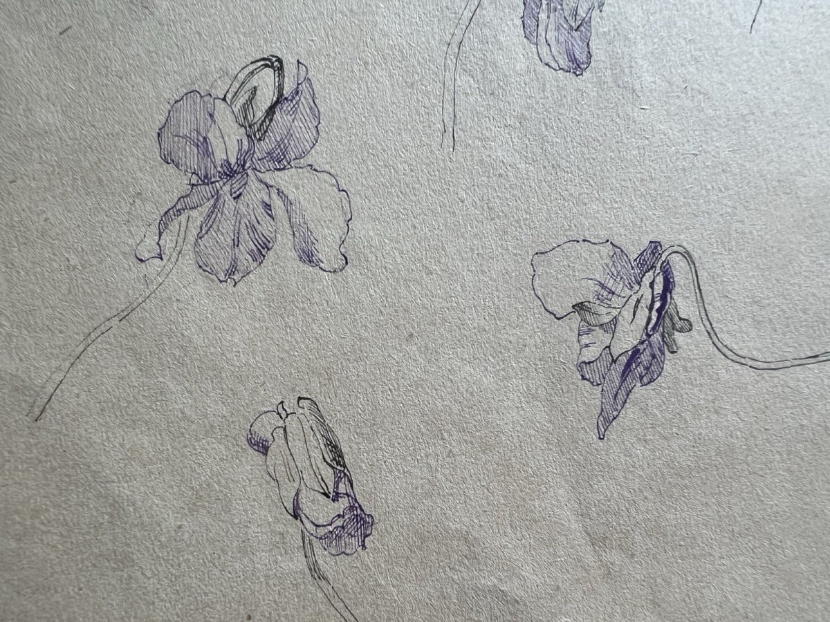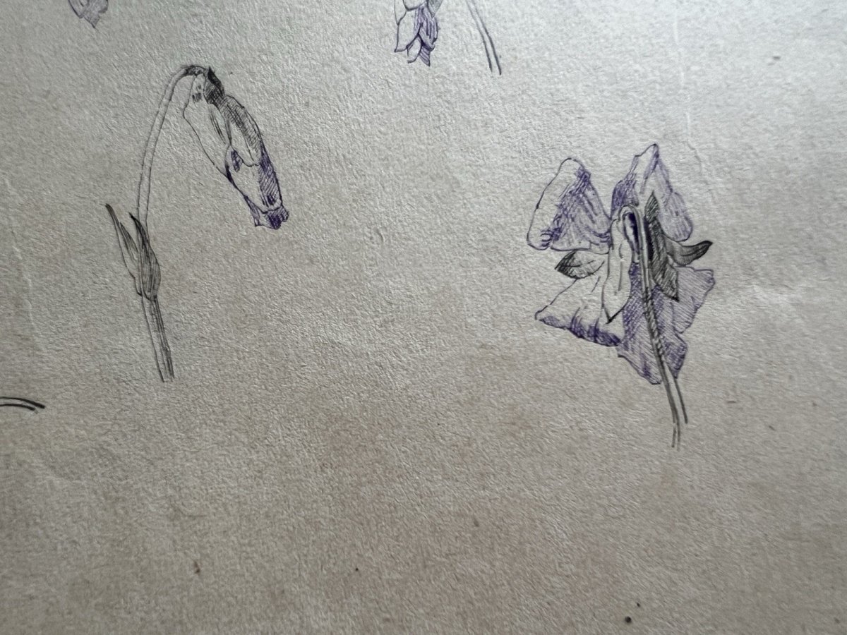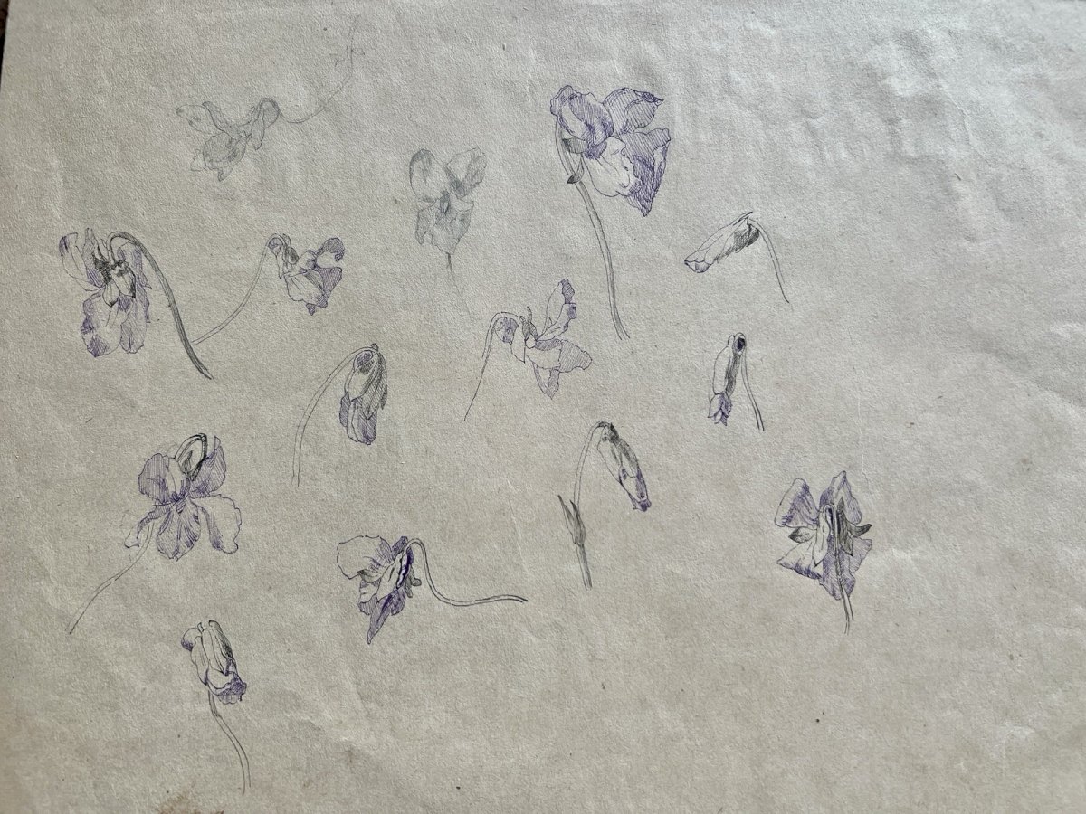 Cette étude sur les Iris, réalisée à la plume et à l'encre à la fin du XIXe siècle, capture toute la finesse et la structure complexe de la fleur avec une précision remarquable. Le trait, à la fois souple et assuré, détaille les nervures délicates des pétales et la verticalité des tiges, typique des recherches botaniques de cette époque. Les nuances de violet apportent une profondeur organique à l'ensemble, tandis que les légères usures du papier témoignent de son authenticité et de son passage à travers le temps. Cette œuvre sur papier présente des dimensions d'environ 32,5 cm sur 25 cm. Authenticité:Original Type:Dessin Période:XIXème et avant Matériau:Encre Genre:Etude Thème:Floral