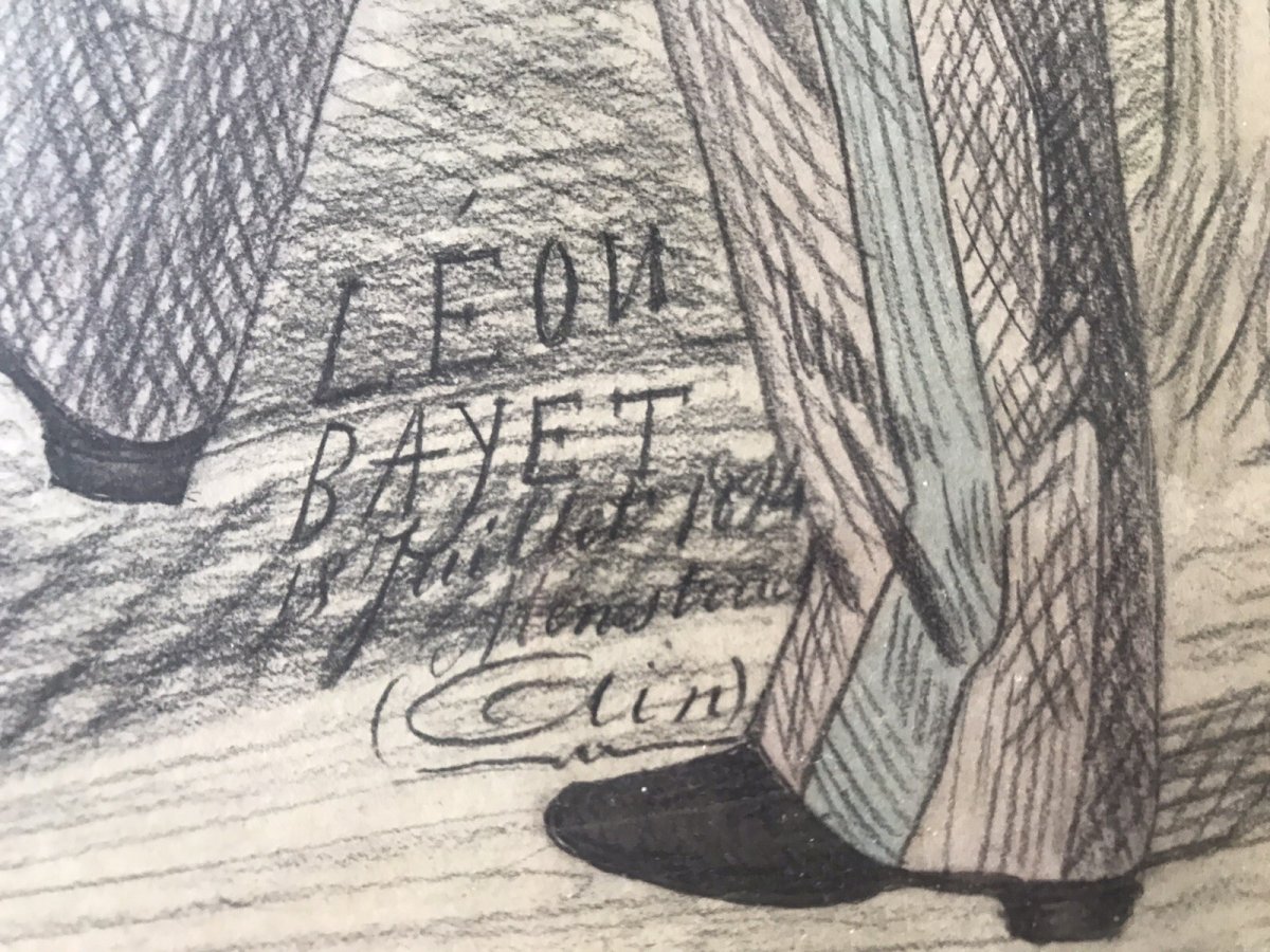Dessin en bon état sauf pour petite tache de rouille (voir photo). Cadre avec manques.. Signé Léon Bayet 1894 (Ain) certainement un régiment de ce département. Les photos font office de description Si vous avez des questions n’hésitez Dimension avec cadre 57.5x47cms Dimension dessin 49.5x39cms Type:Aquarelle Et Crayon Noir Courant artistique:École française Caractéristiques:Signé Thème:Militaires