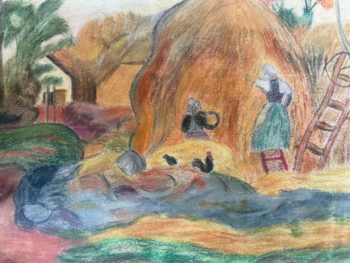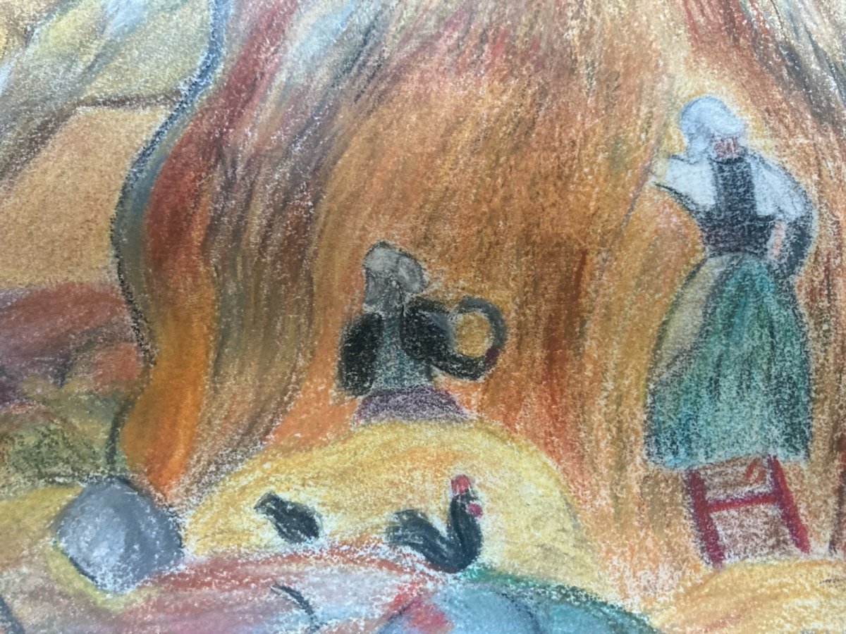 Dessin Campagne Poule Ferme Papier À Identifier Femme Crayon Craie Grasse Art