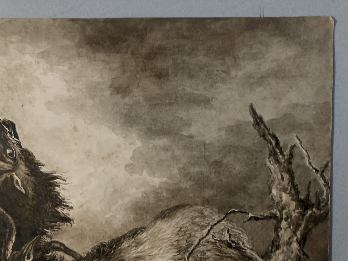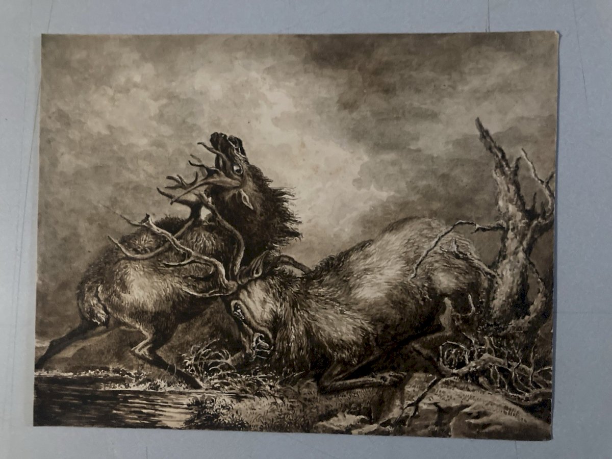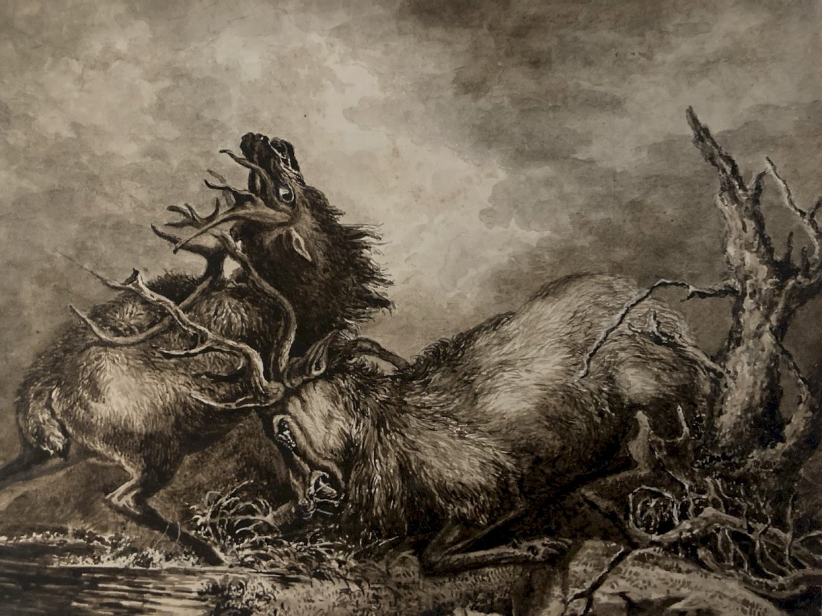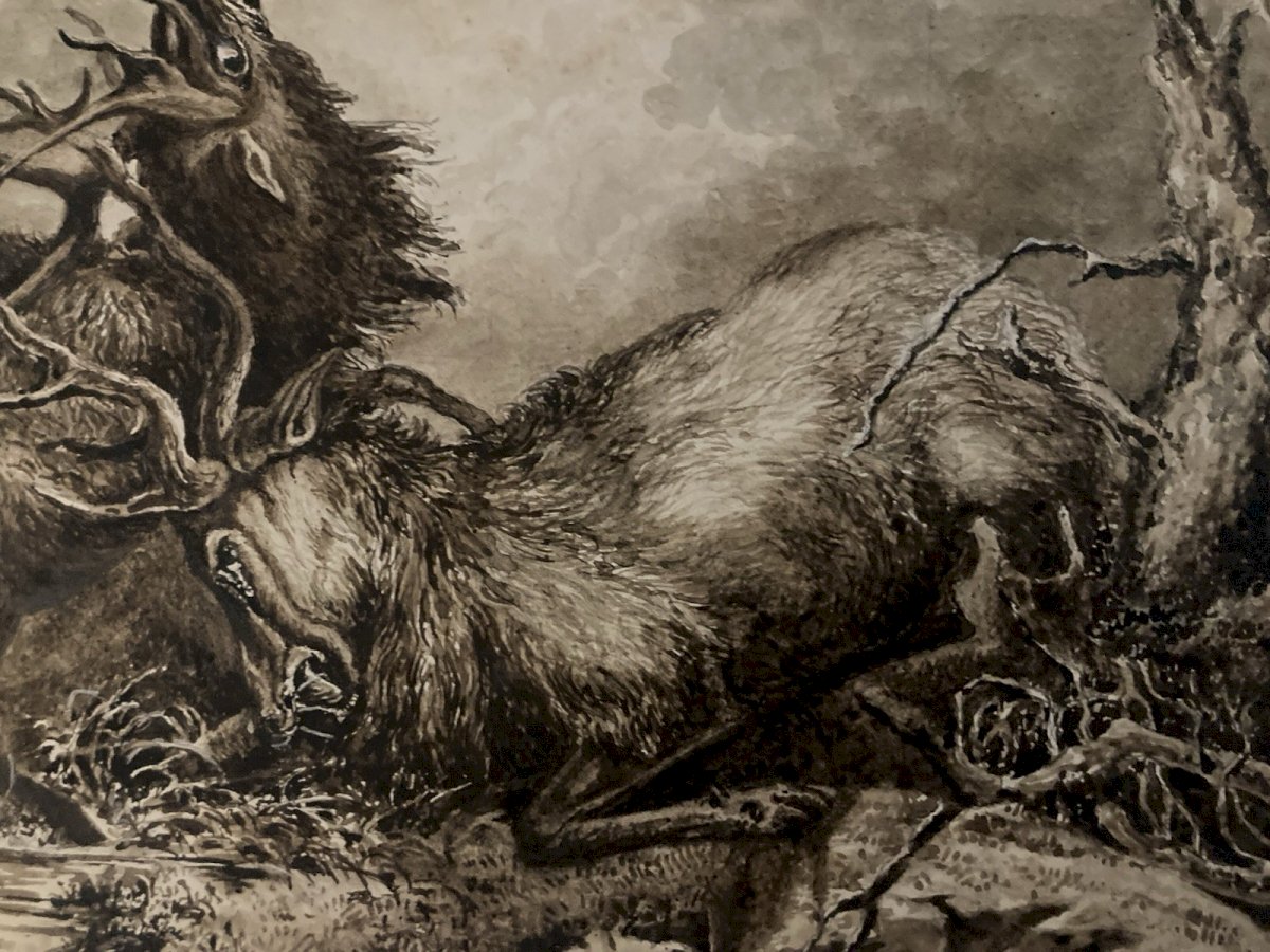 Dessin Lavis Encre Sur Papier XIXe 1850 Drawing Peinture Cerf Chasse Combat Old