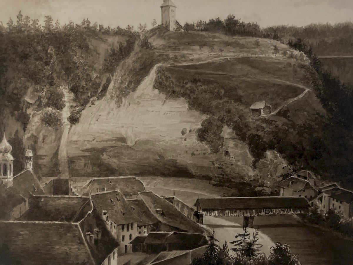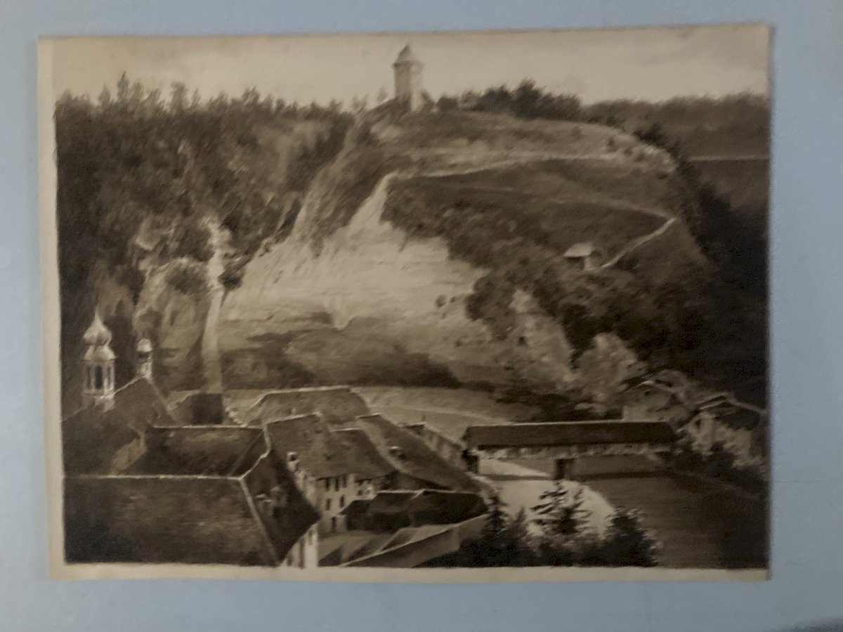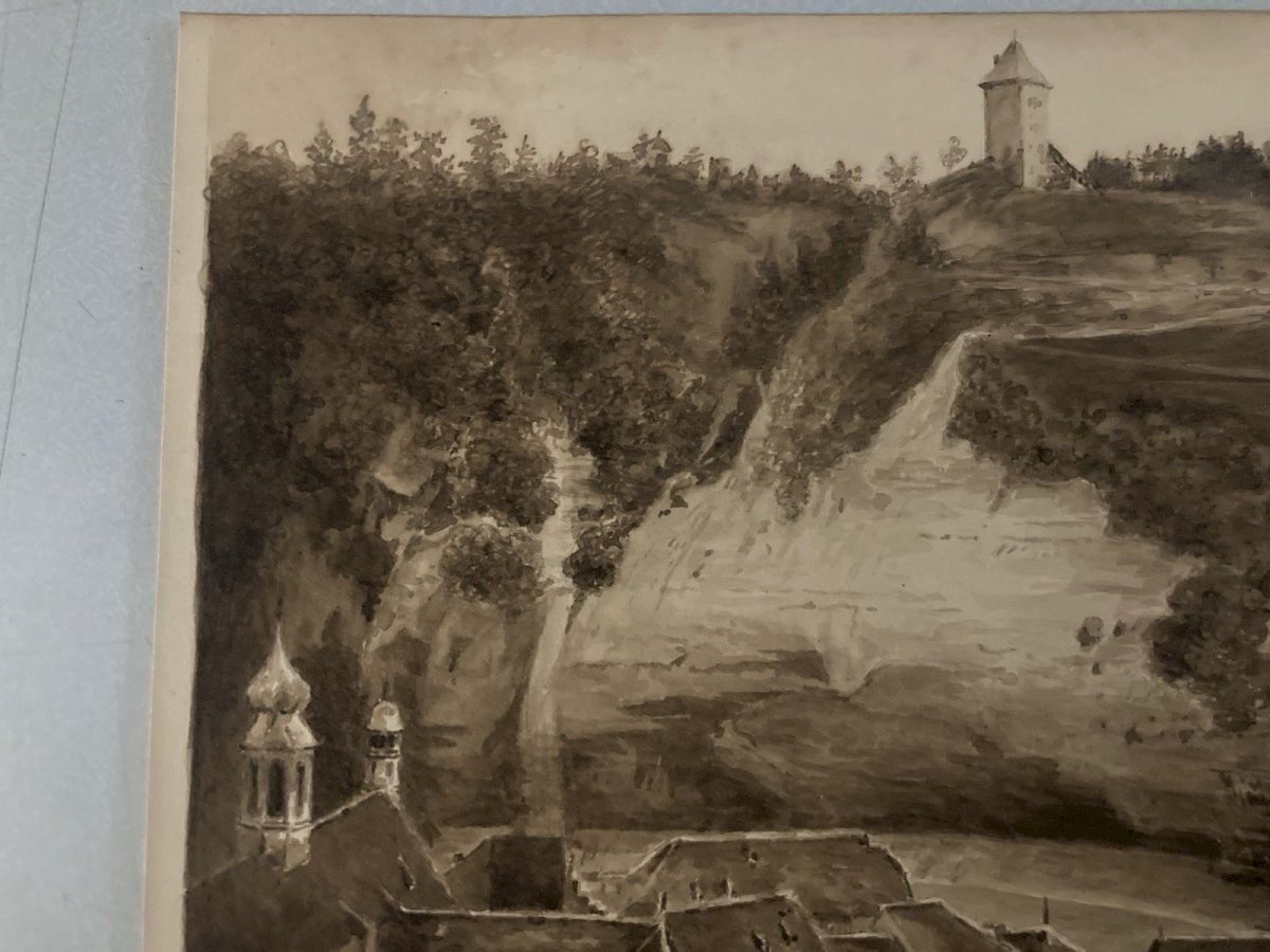 Dessin Lavis Encre Sur Papier XIXe 1850 Drawing Peinture Saint Ursanne ? Art Old