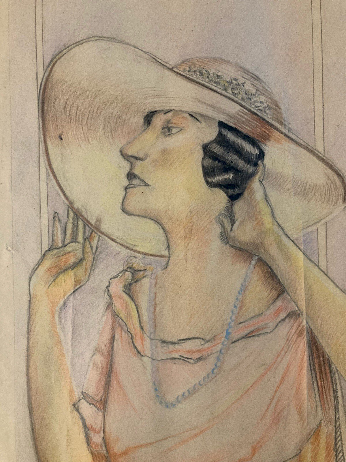 Dessin Portrait Crayon Papier Femme 1930 Nouveau Déco Art Main Epoque