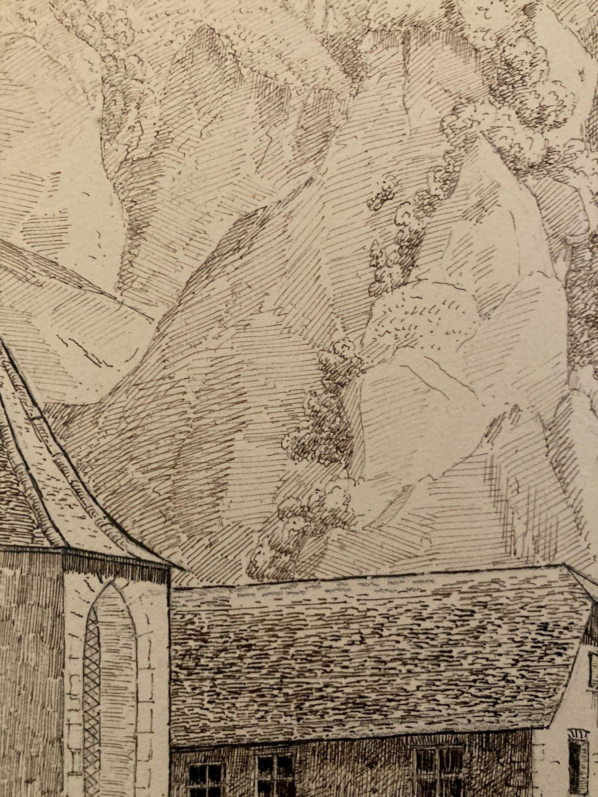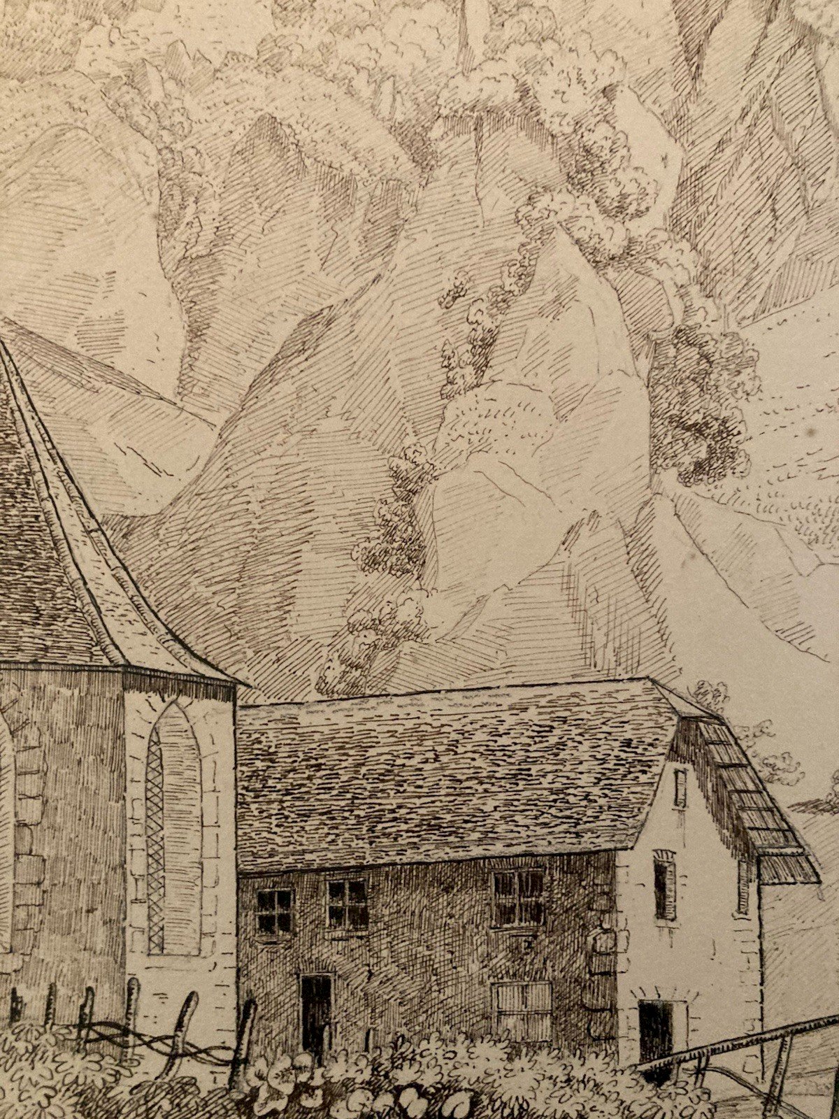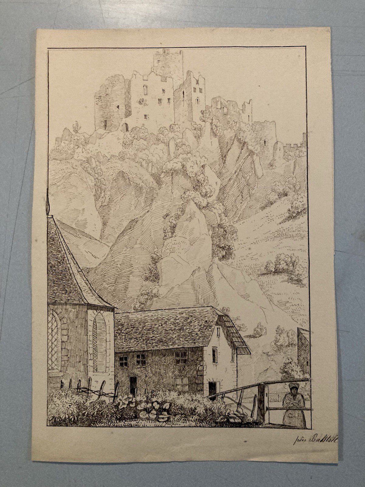 Dessin XIXe 1830 Encre Peinture Suisse ? Chateau Ruines Ancien Alpes