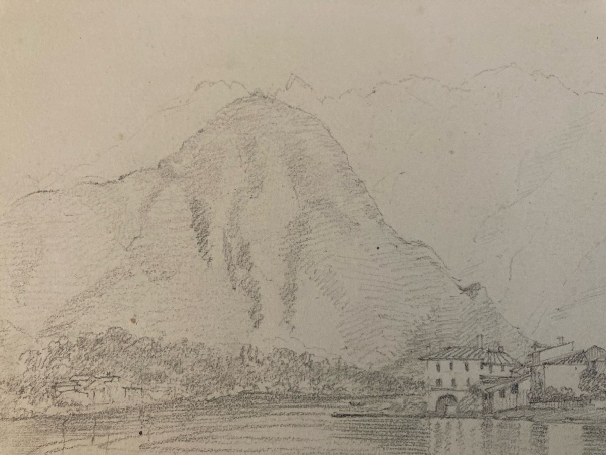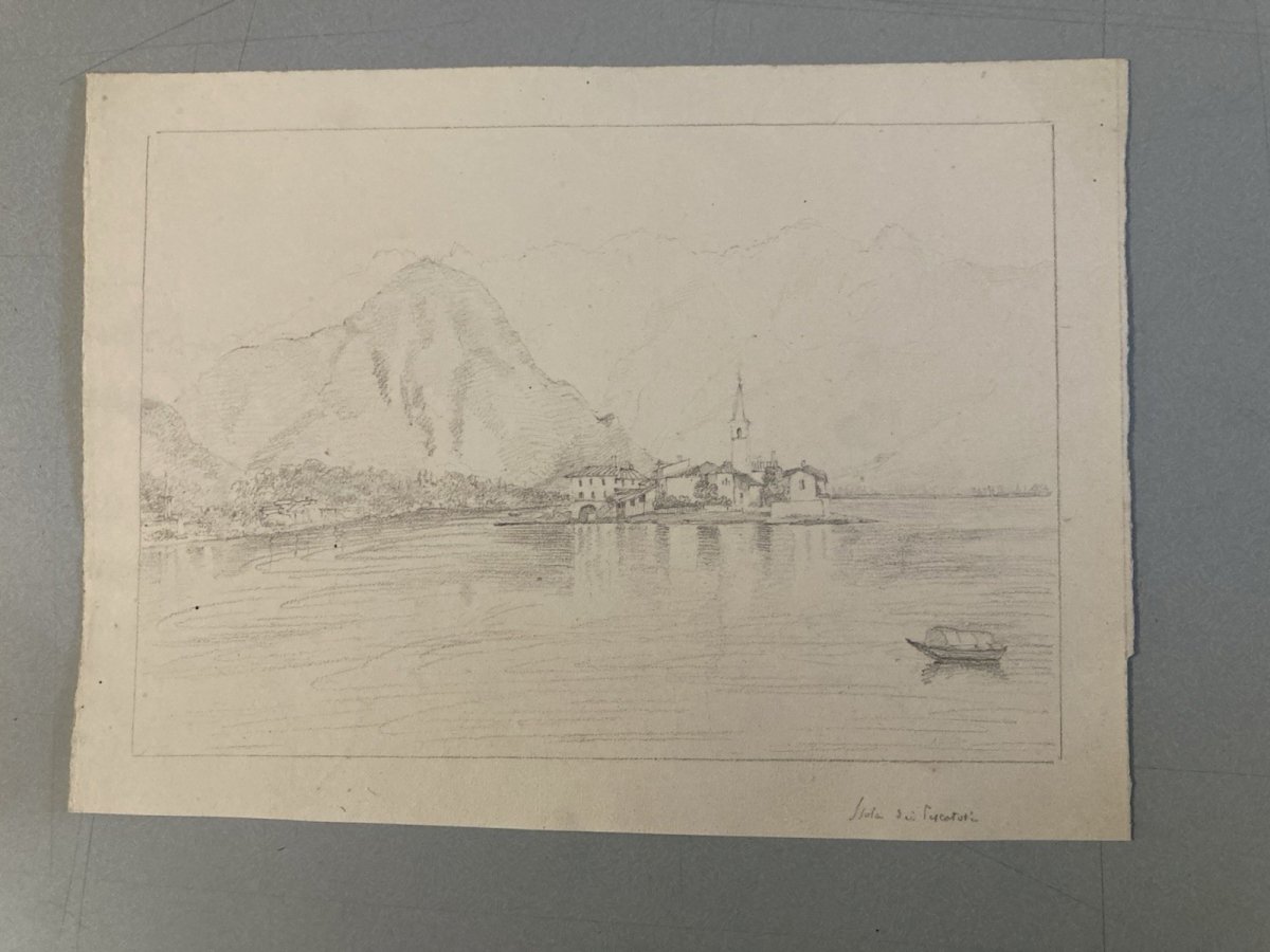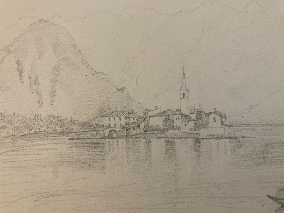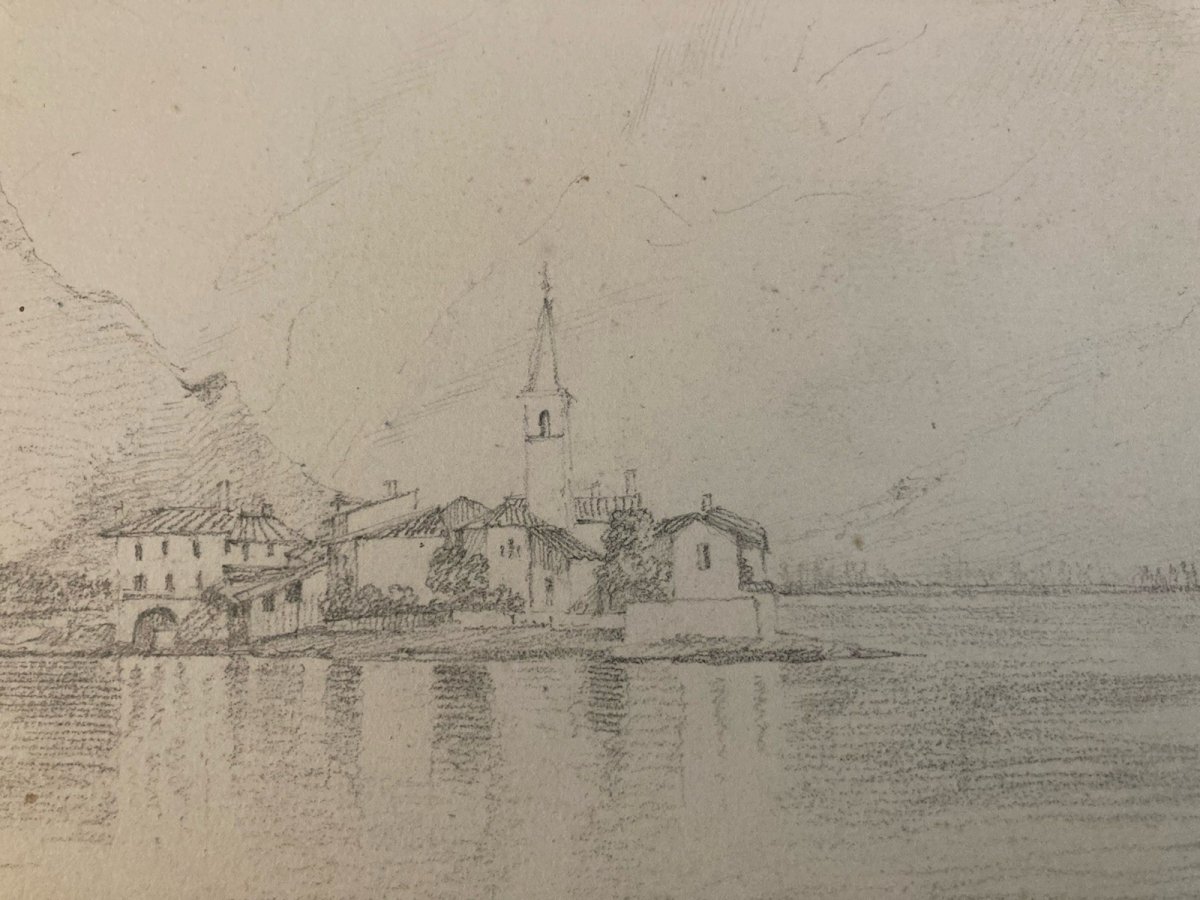 Dessin XIXe 1850 crayon Île De Pescatori Lac De Come Italie Borromées
