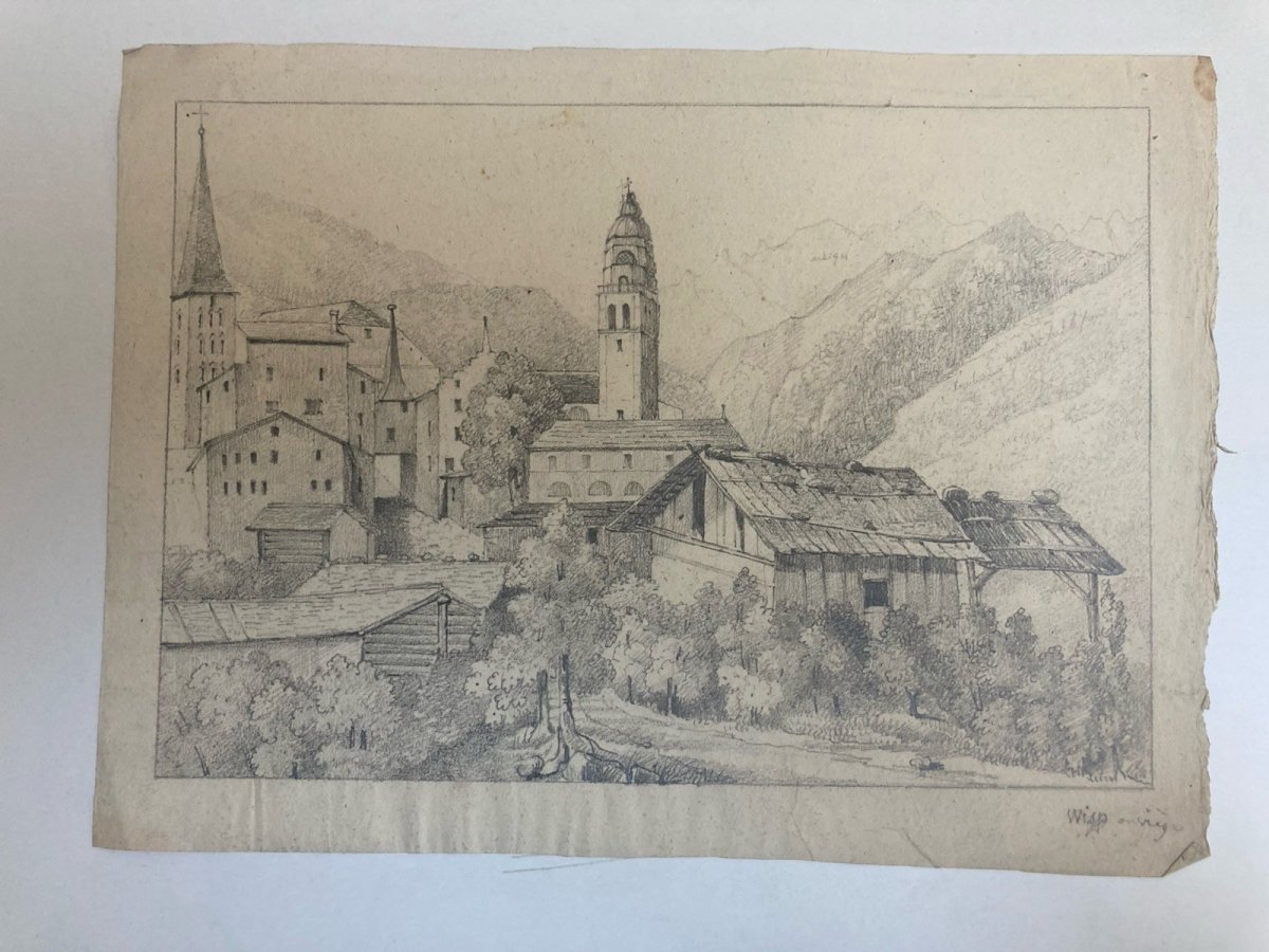 Dessin XIXe 1850 Visp Viege Brig Suisse Village Ancien A Identifier Art