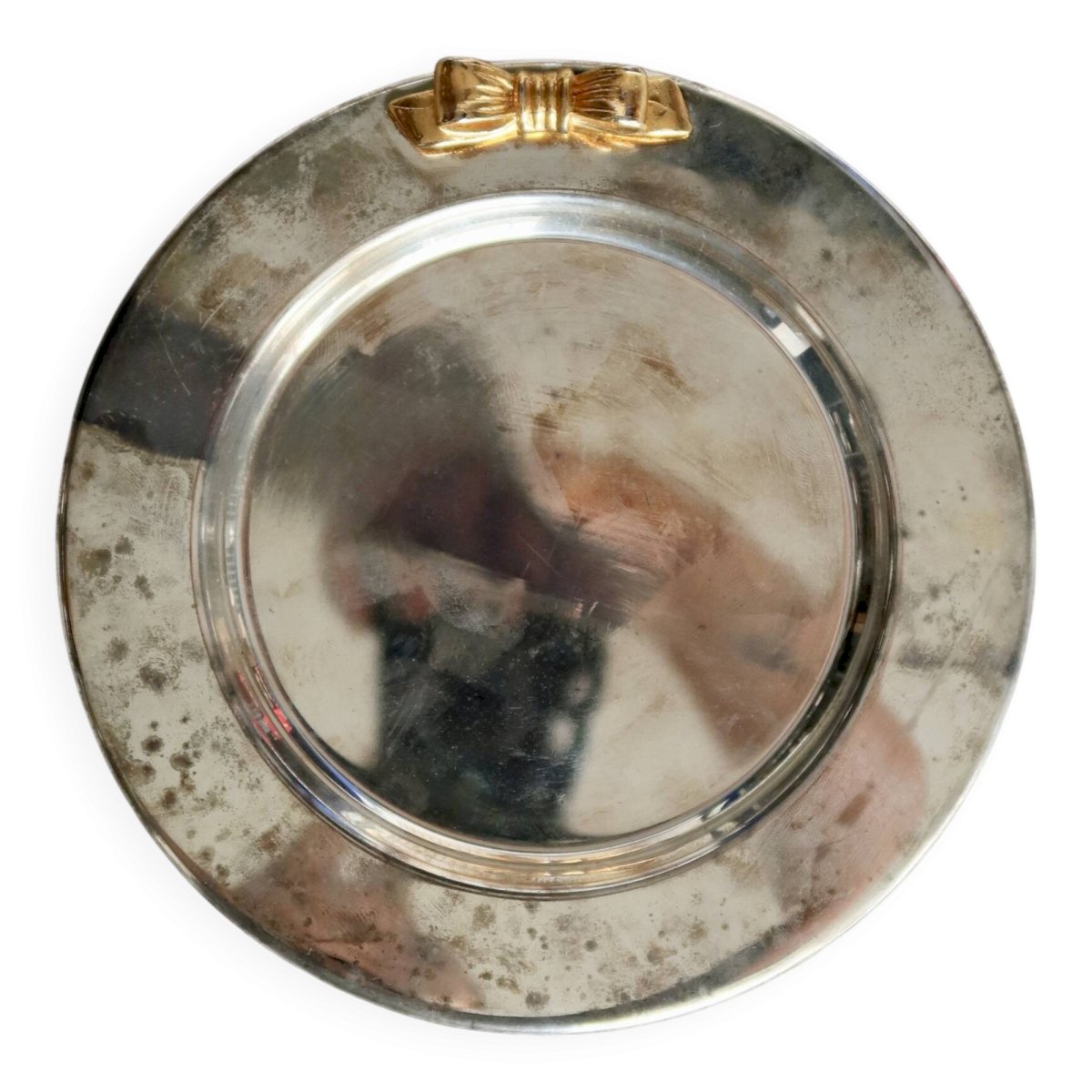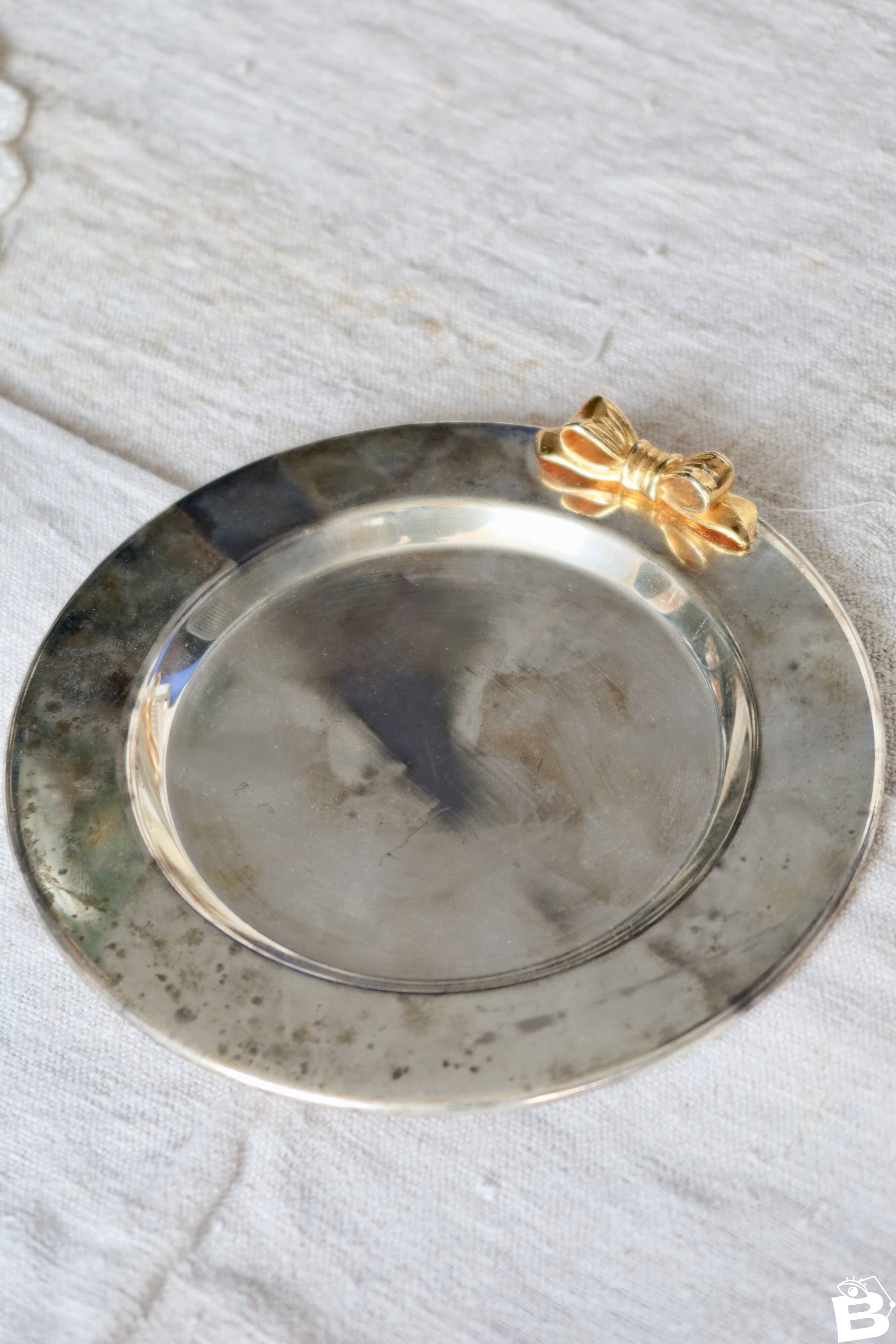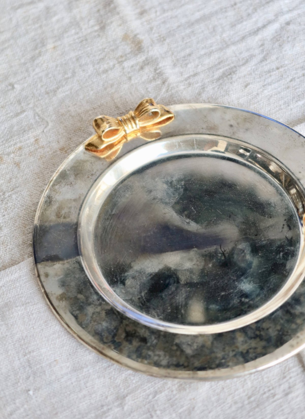 Dessous de bouteille vintage métal argenté patiné – Nœud doré