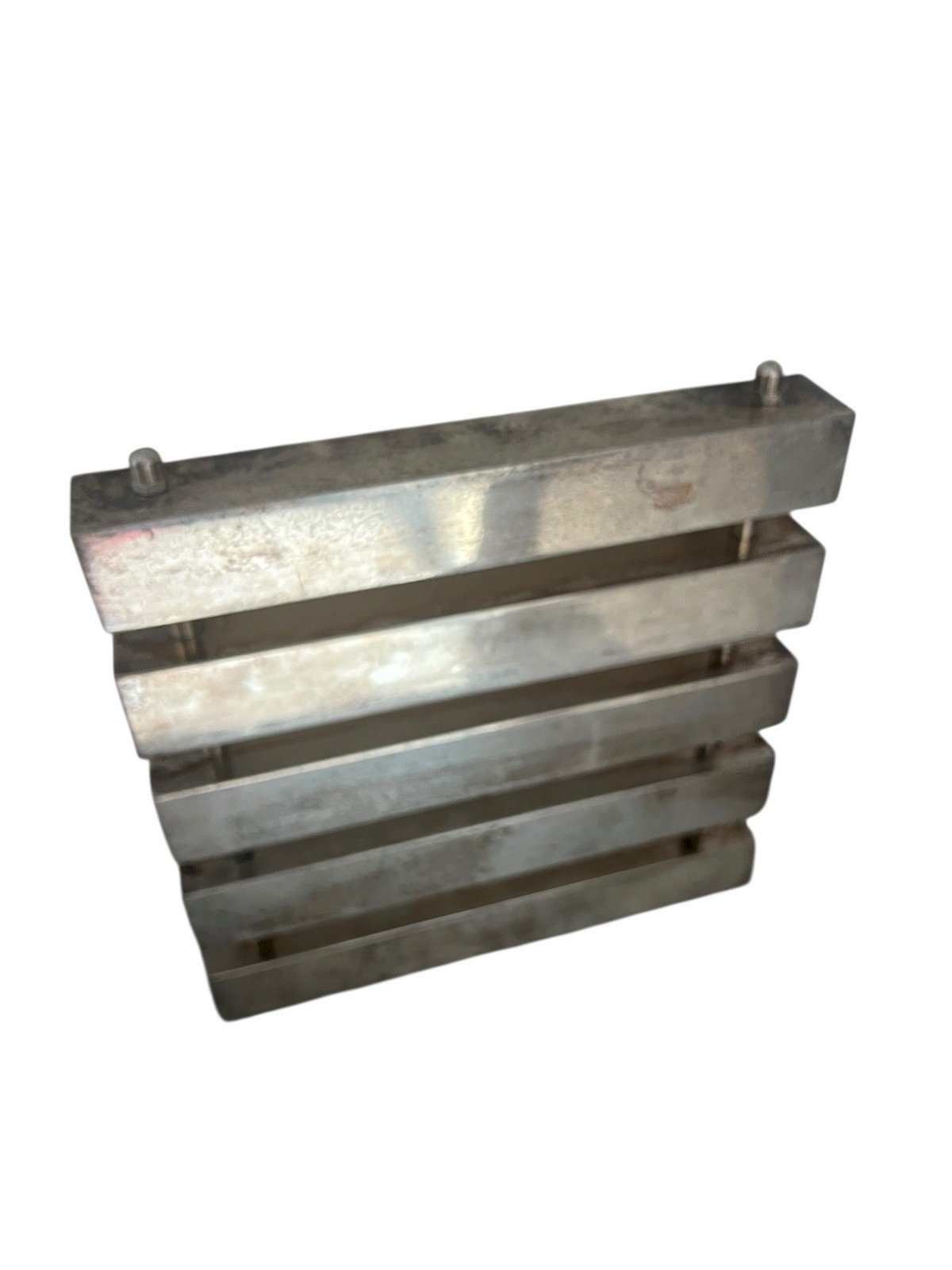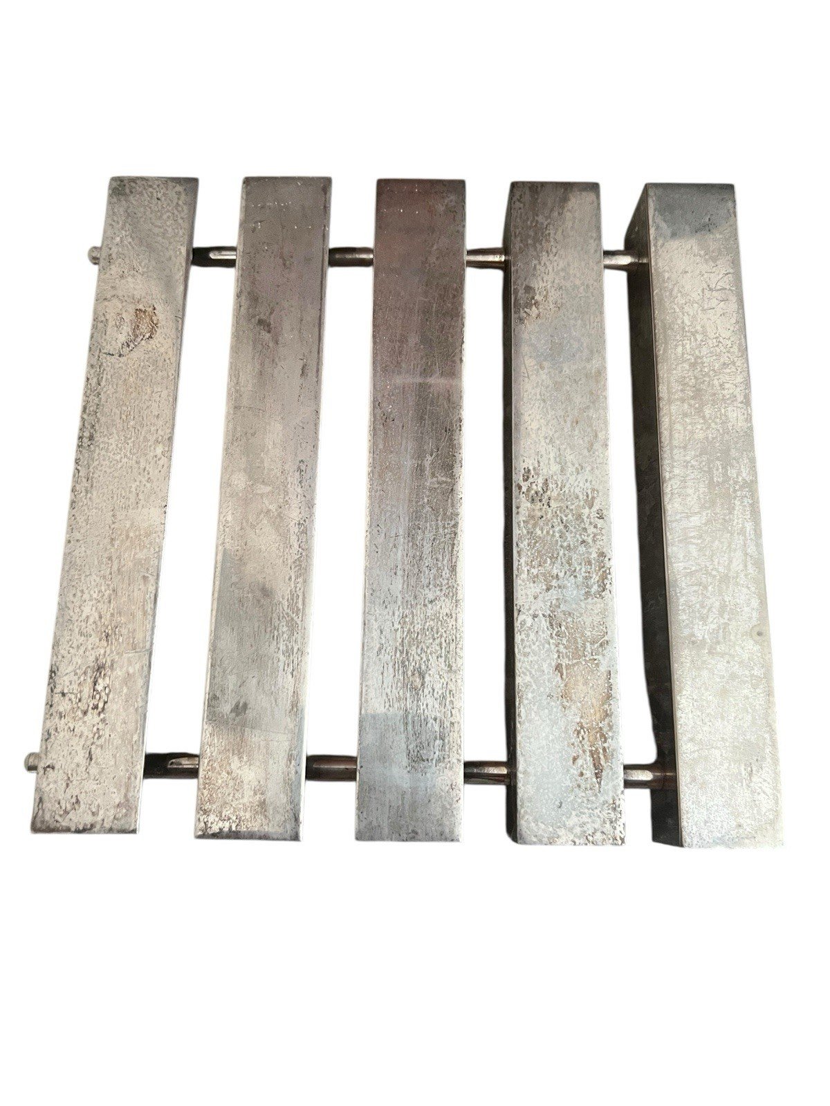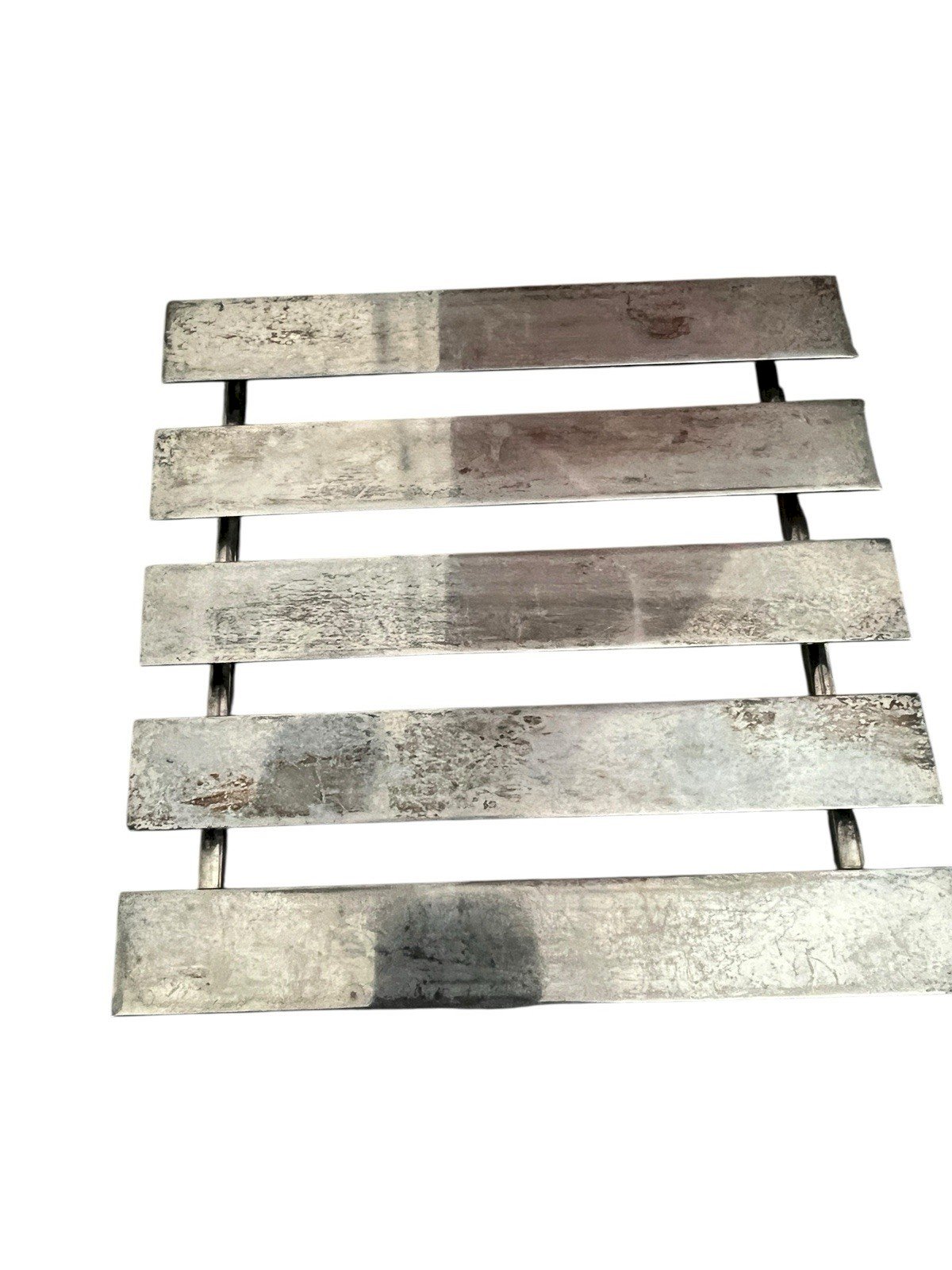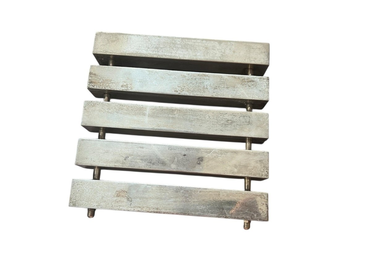Dessous de plat modernistes vintage Mid Century design art de la table. Solide, dessous de plat design en metal argenté de qualité. Patine, ancienne dimensions environ 21,5cm de longueur pour 20,8 cm de largeur 3 cm de hauteur environ. Son poids environ 900 g.. Il est aussi élégant, recto verso. Sous-type:Plat Marque:Design Poids:900grs Type:Arts de la table, Cuisine Période:Design du XXème Origine:Inconnue Matière:Métal argenté Style:1970