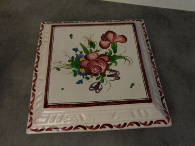 superbe dessous de plat musical en faïence il est en très bon état il est de belle taille la boite à musique fonctionne très bien elle s'actionne avec un bouton dessous il mesure 29.3 cm de large sur 29.3 cm de profondeur et 6 cm de haut