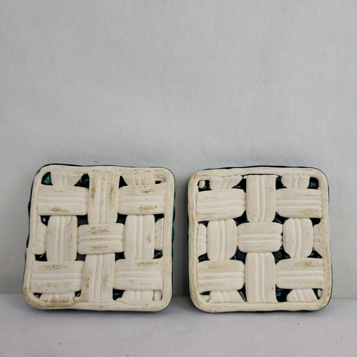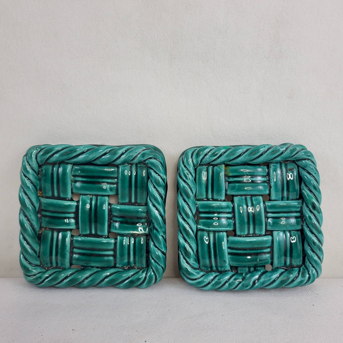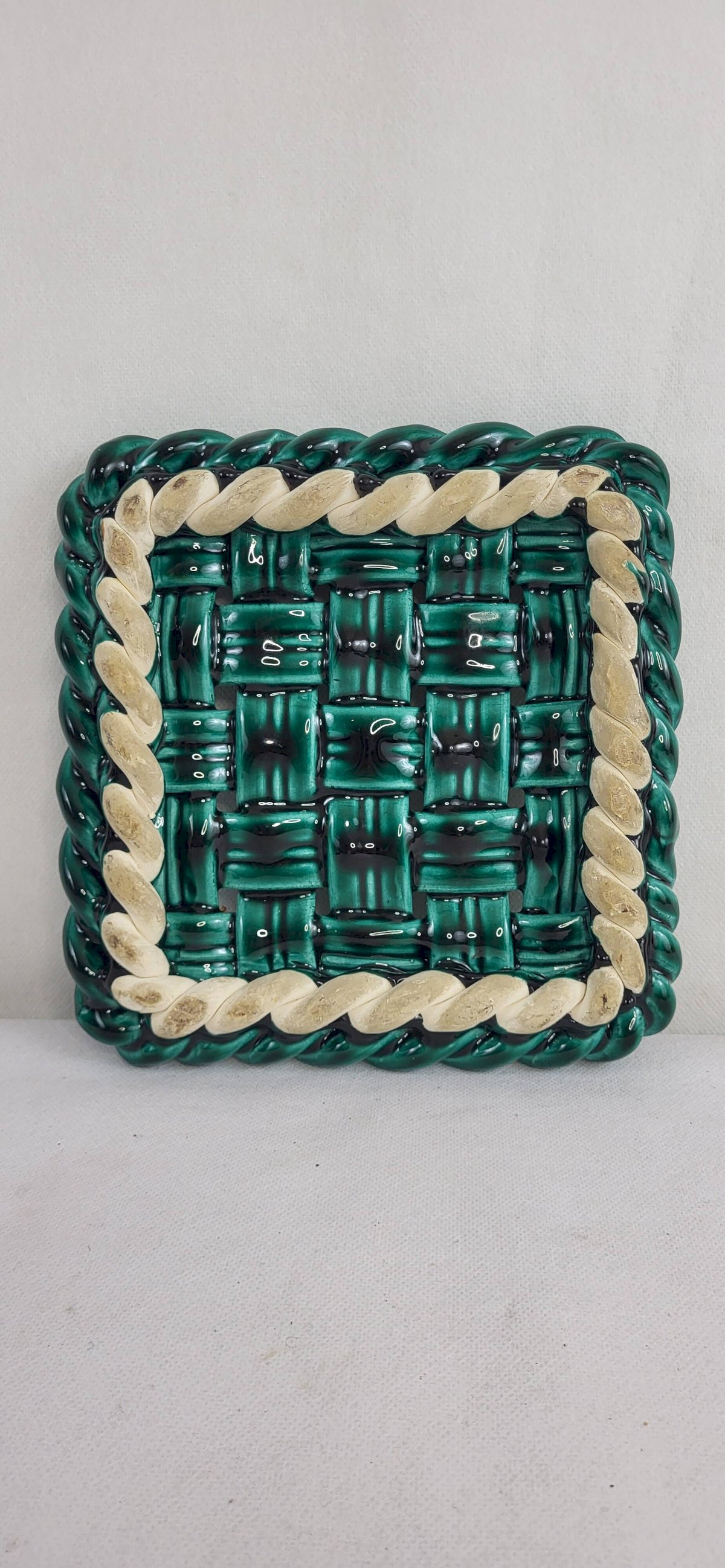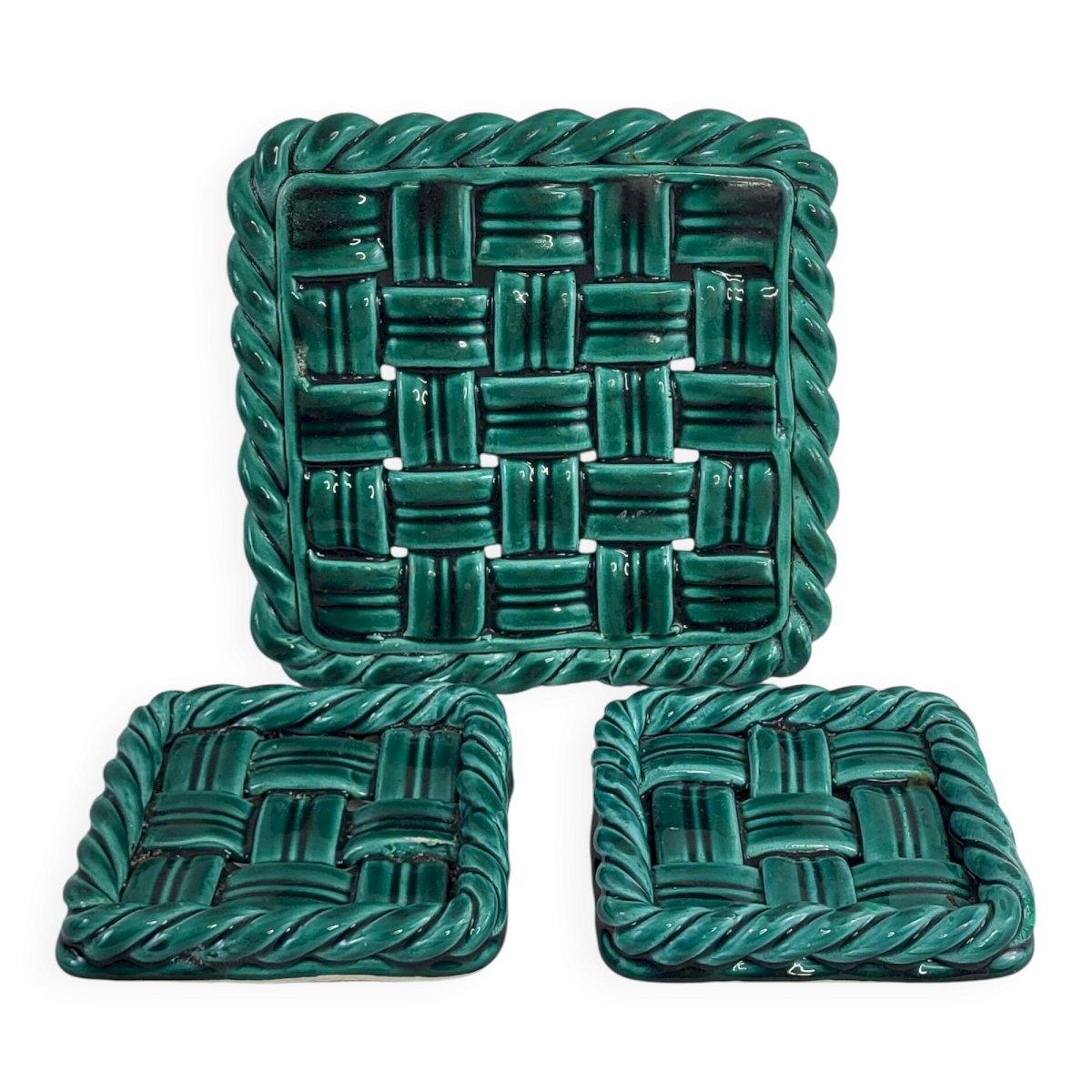 Dessous plat / bouteille vallauris céramique tressée.Dimensions dessous de plat 19, 5*20 cm.Dimensions dessous de bouteilles 12, 5*12, 5 cm.En bon état avec traces d'usage et d'ancienneté habituelles.Emballage soigné et livraison rapide.