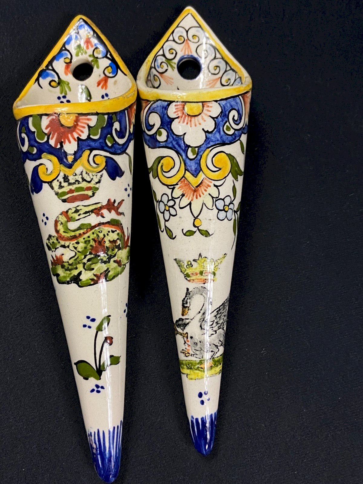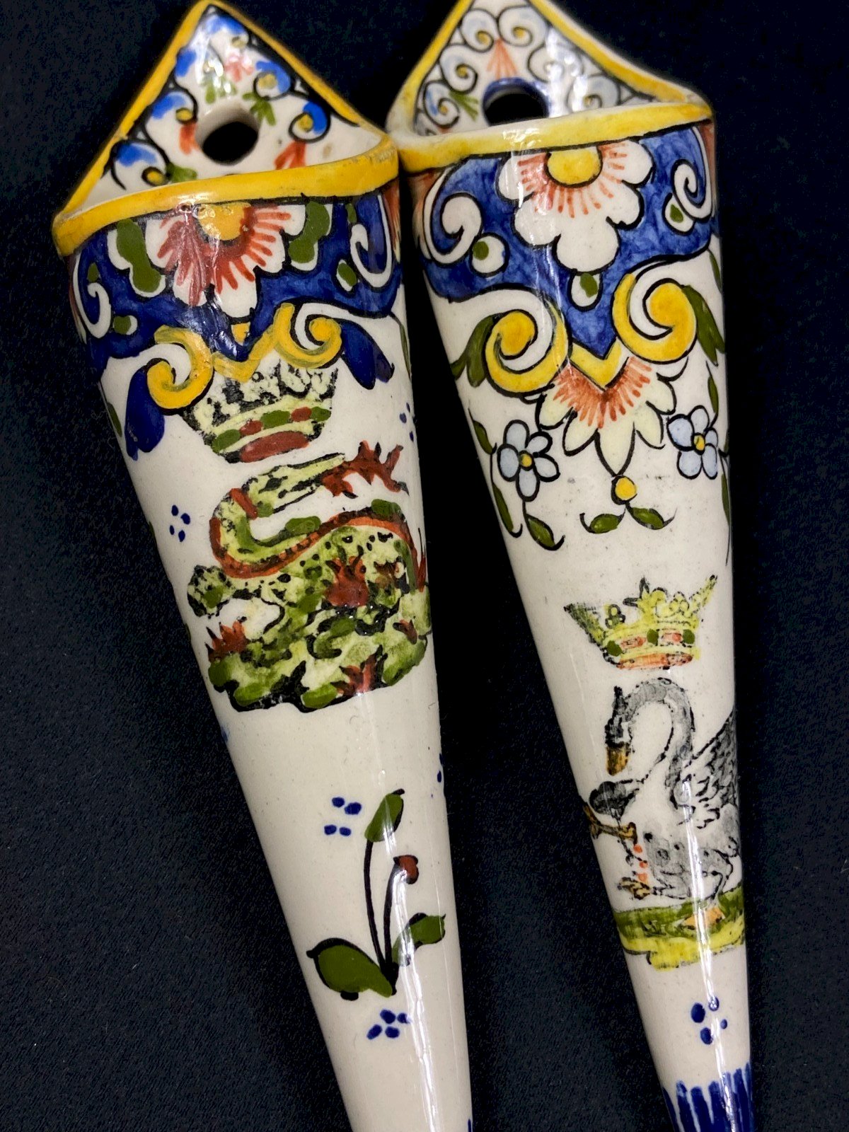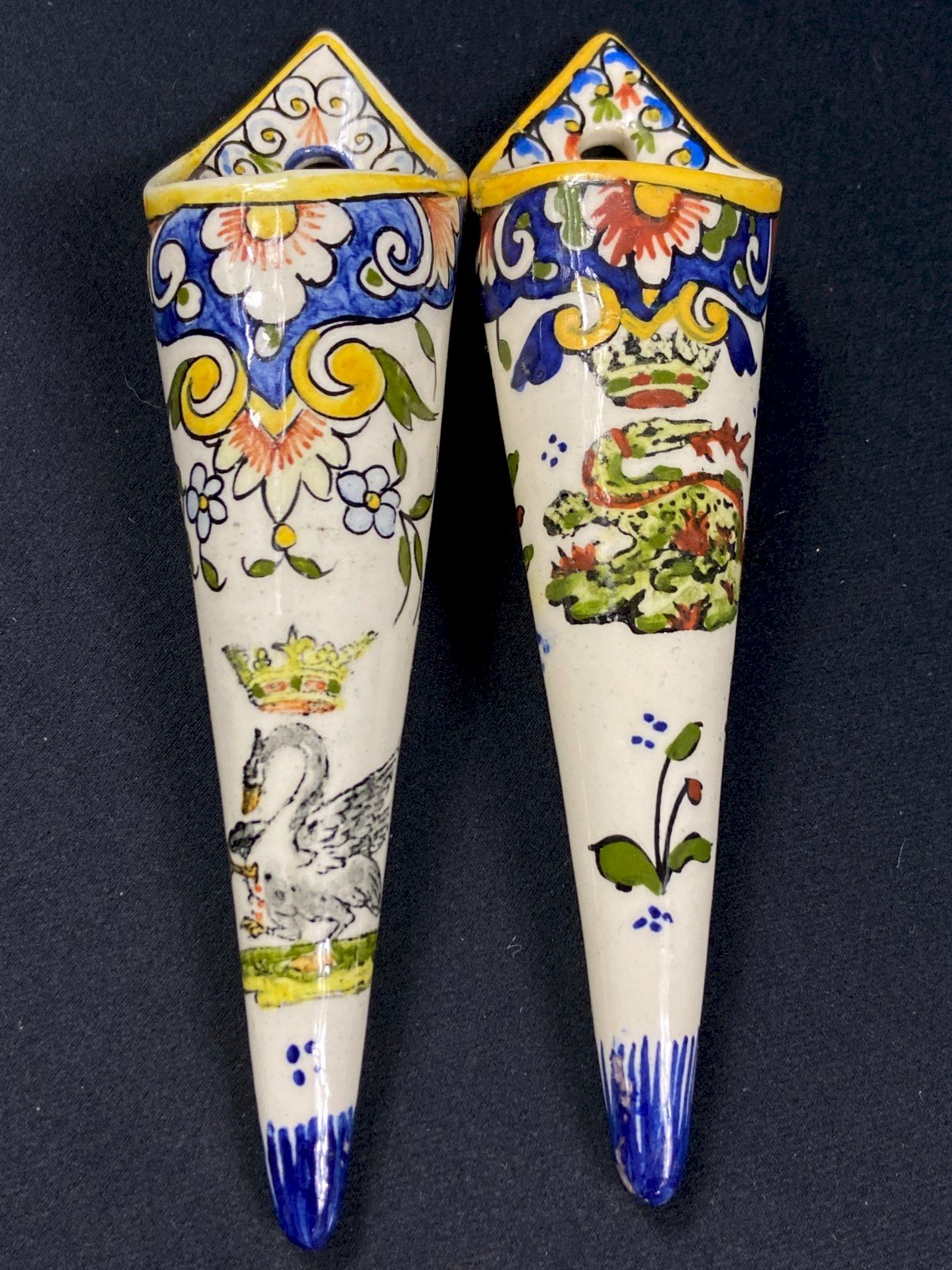Deux bouquetière murales en faïence décor Rouen au cygne et Salamandre couronne