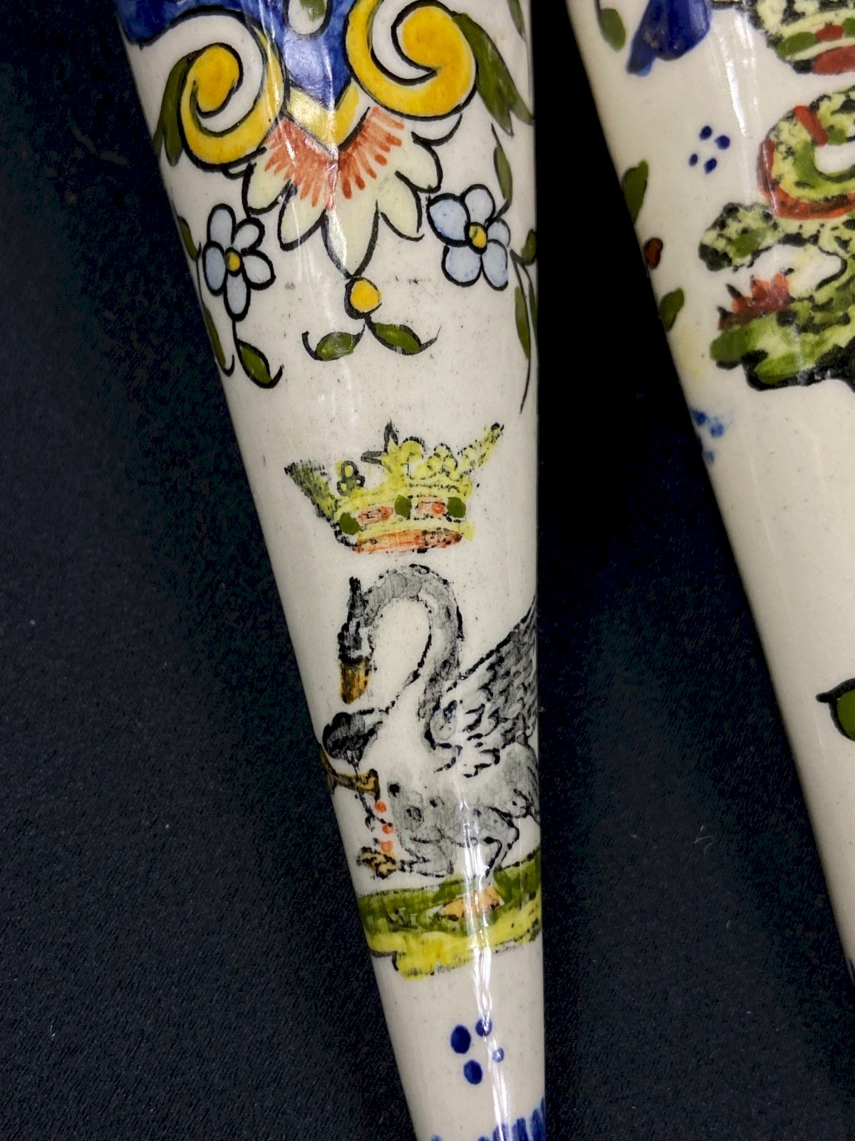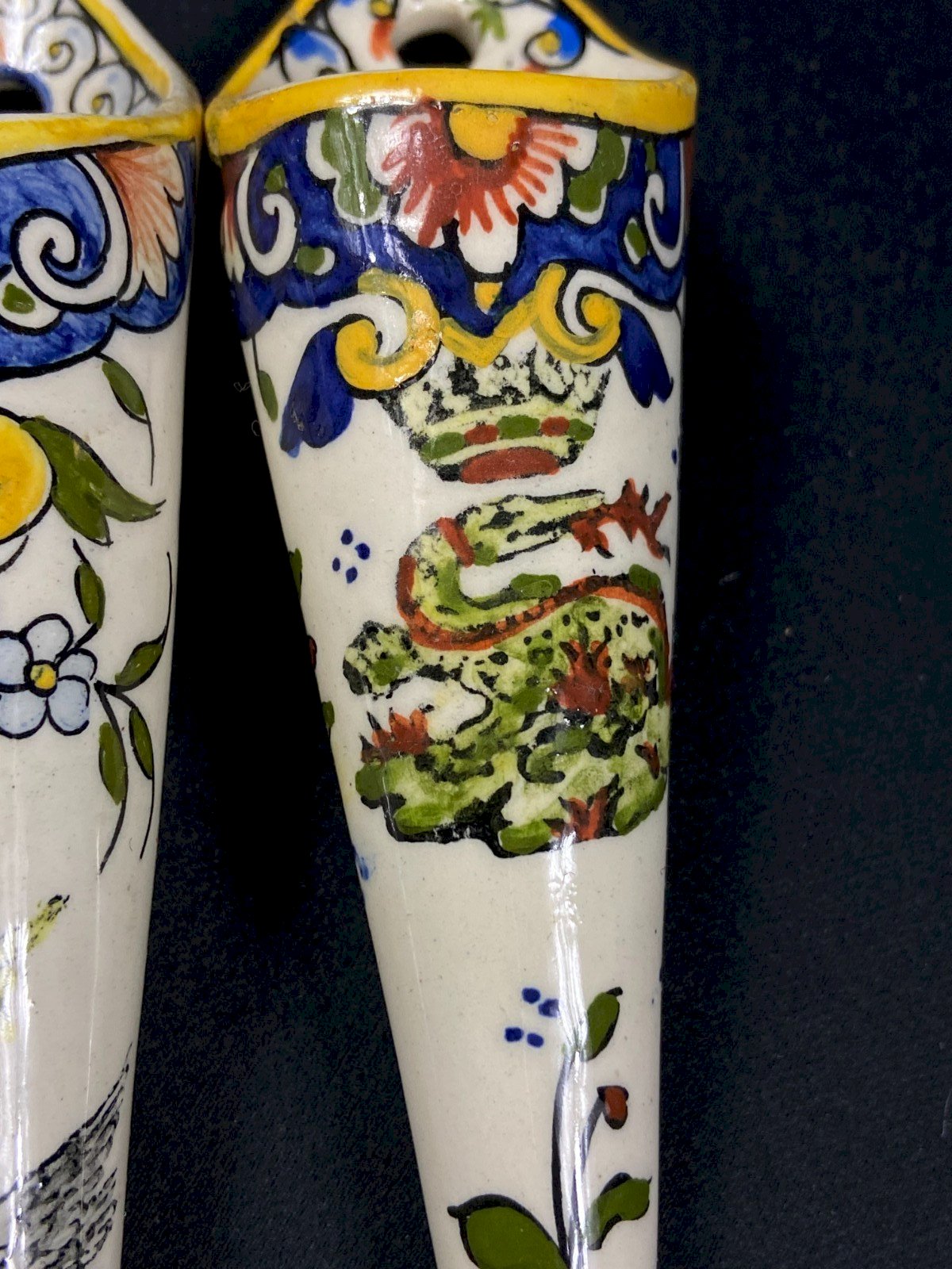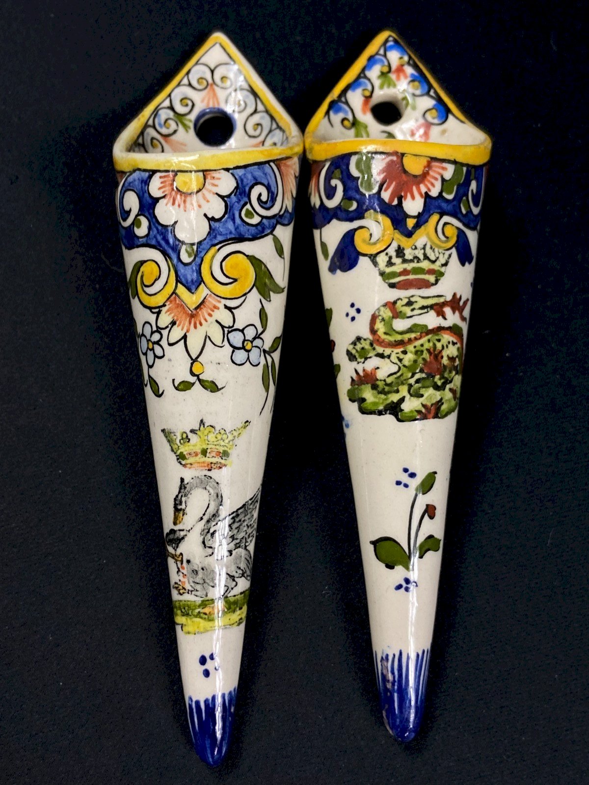 Deux bouquetière murales en faïence décor Rouen au cygne et Salamandre couronne
