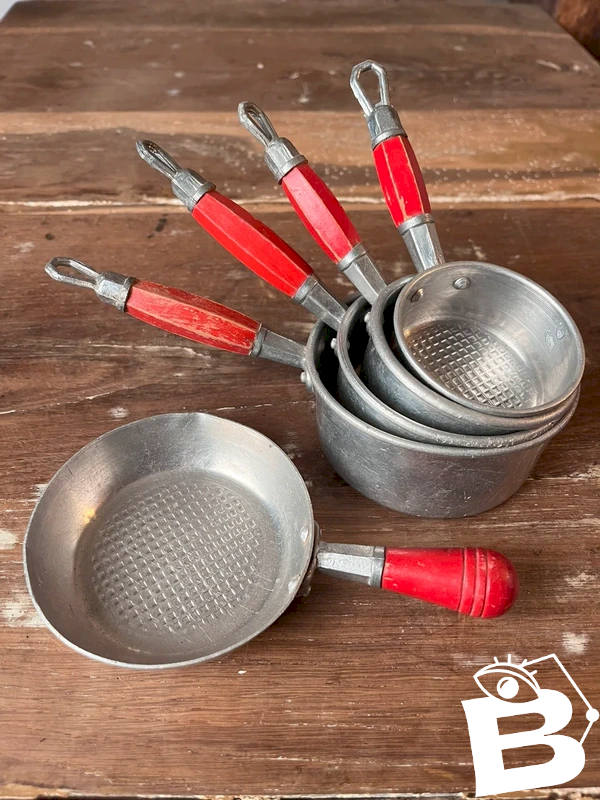 Lot de dînette des années 50 en métal et bois comprenant 4 petites casseroles et 1 poêle.