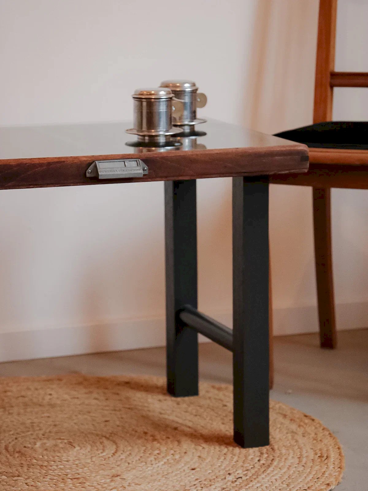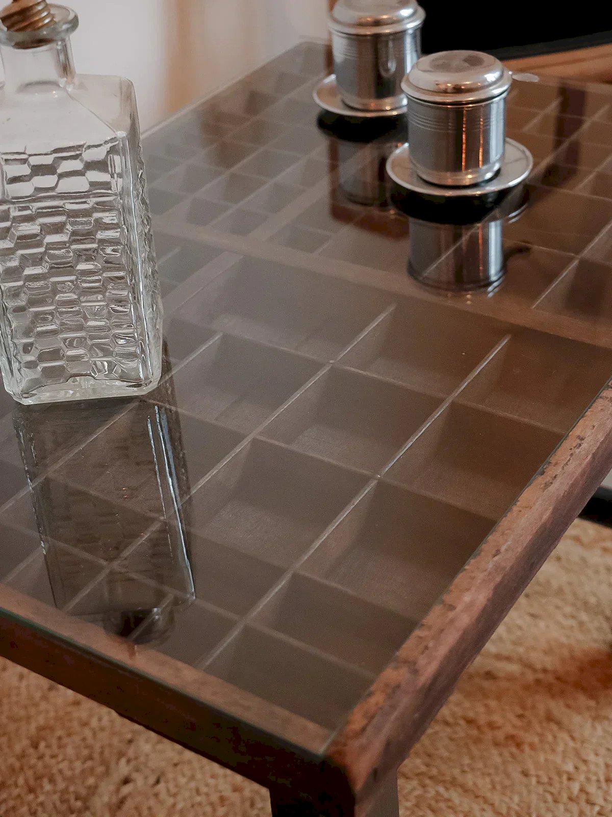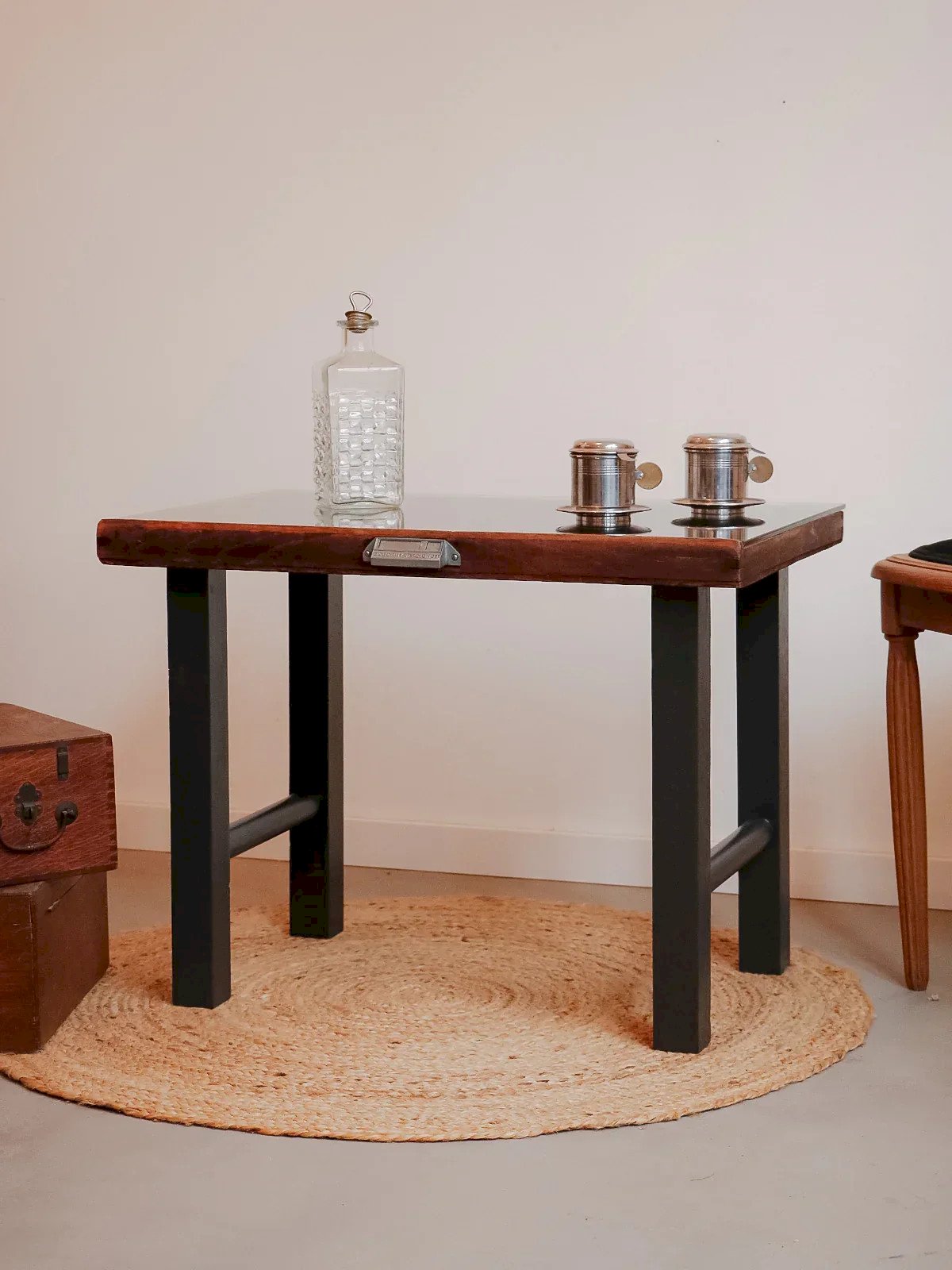 Découvrez cette table basse née d’un casier d'imprimerie signé Maison Deberny et Peignot, fonderie française du début du XXe siècle, qui affirme un style industriel élégant. Nettoyé et reteinté avec une patine à l'ancienne, le casier révèle plus de cent cases pour exposer petites collections tandis qu’un plateau de verre permet d’y poser verres et tasses en toute sécurité. Le piétement peint en Pitch black souligne ses lignes graphiques et s’intègre naturellement à un salon contemporain ou à un loft au charme d’atelier. Longueur : 65 cm Largeur : 44 cm Hauteur : 50 cm État:Occasion: Objet ayant été utilisé. Objet présentant quelques marques d'usure superficielle, ...Occasion: Objet ayant été utilisé. Objet présentant quelques marques d'usure superficielle, entièrement opérationnel et fonctionnant correctement. Il peut s'agir d'un modèle de démonstration ou d'un objet retourné en magasin après une courte période d'utilisation. les éventuelles imperfections. Marque:Debongout Type:Produit chiné Matériau:Bois, Verre Style:Contemporain Personnalisé:Tables basses