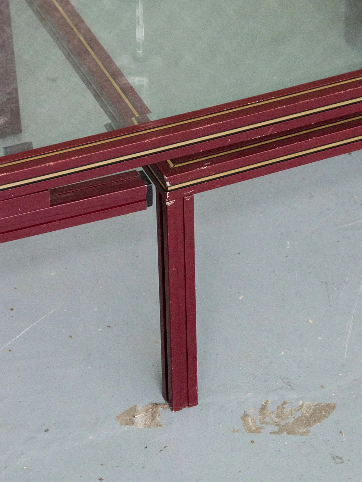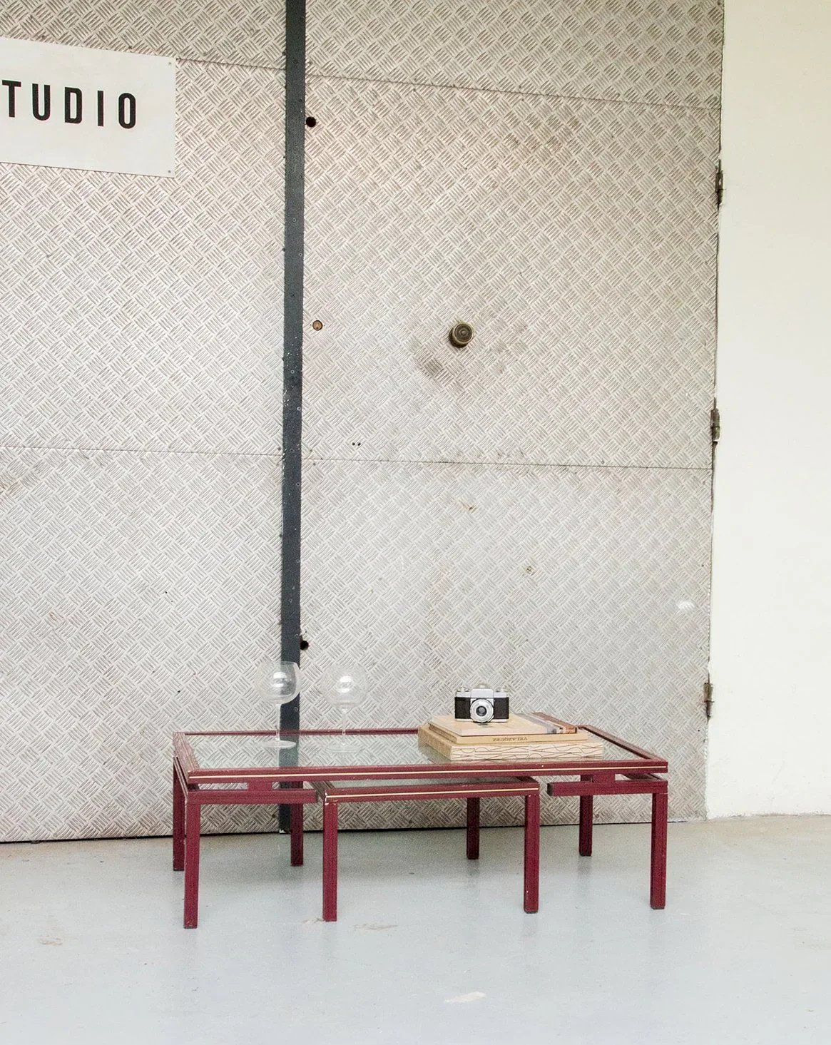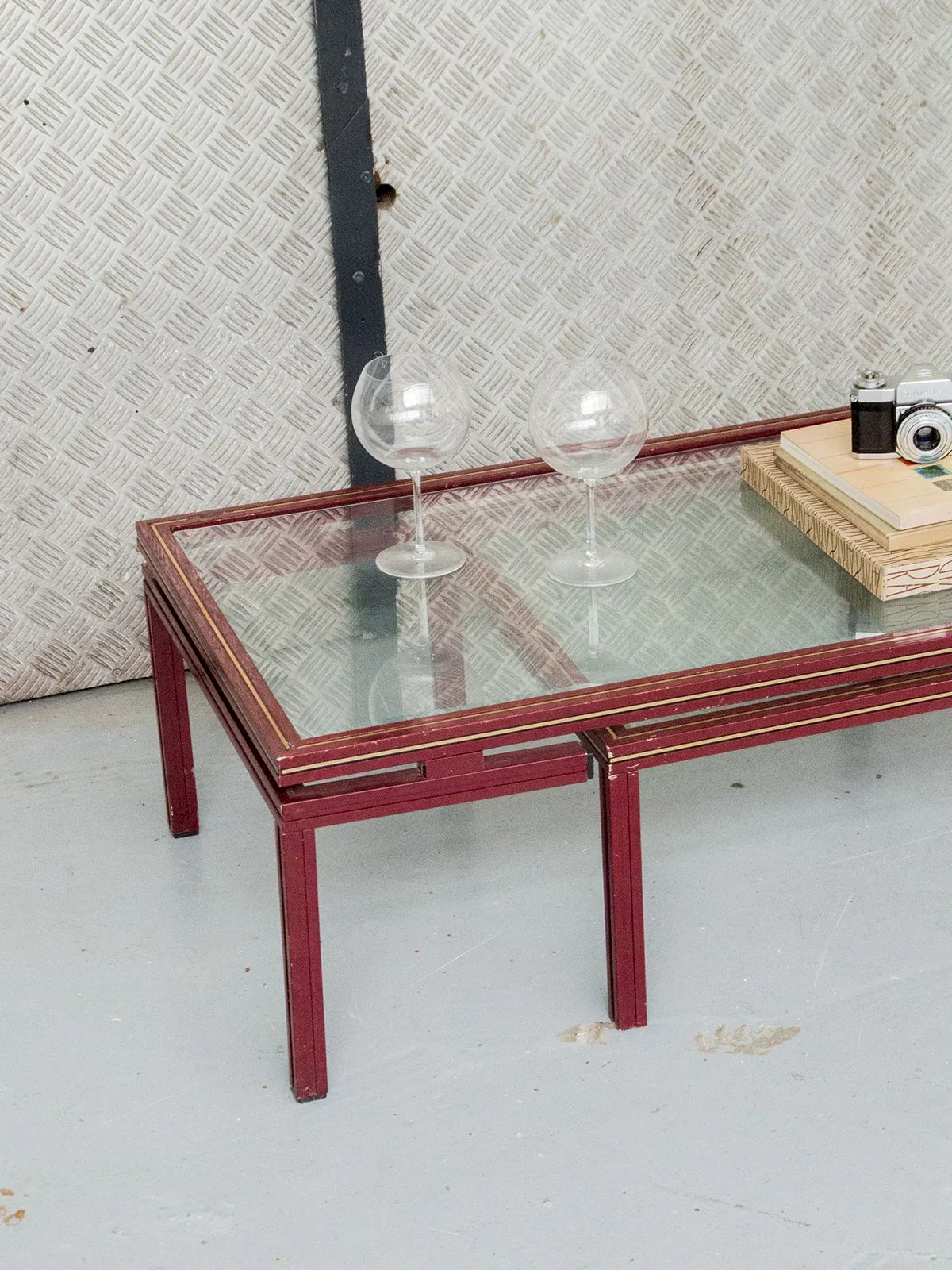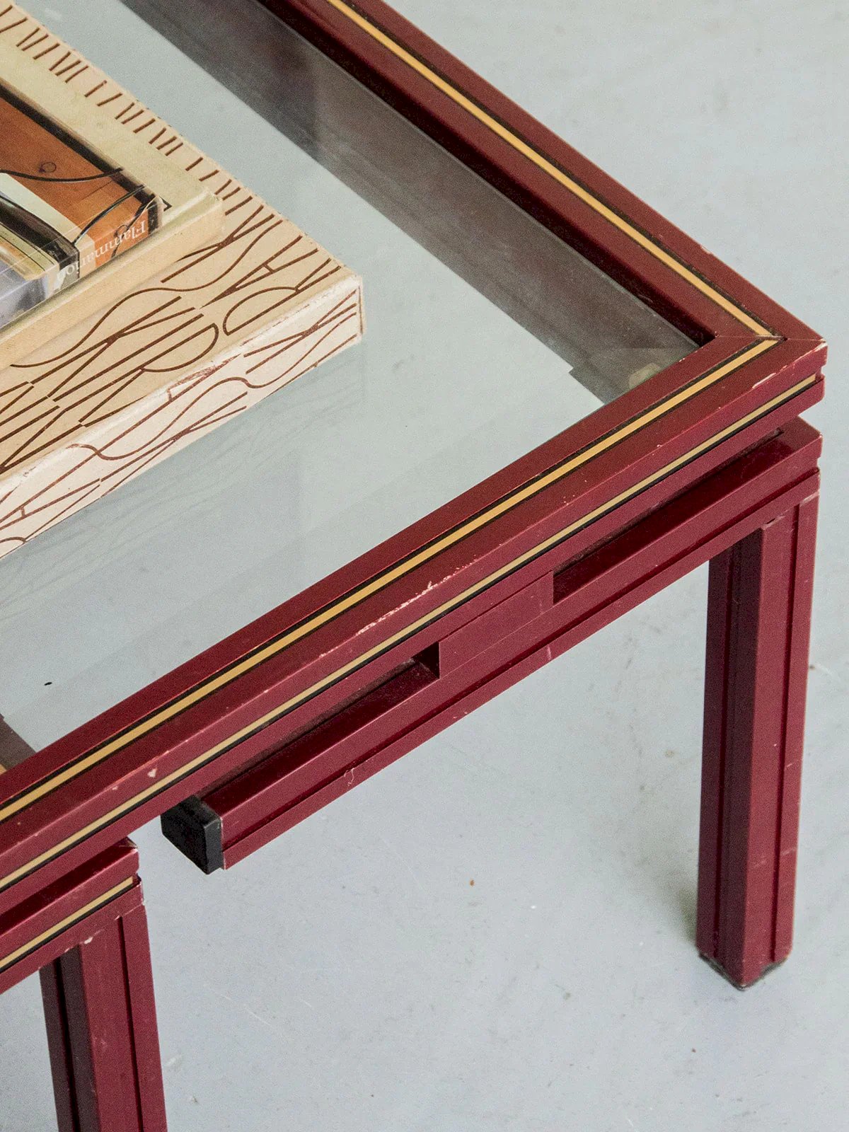Découvrez cet ensemble de tables basses signé Pierre Vendel, composé d’une grande table rectangulaire et d’une petite table carrée. Les plateaux en verre reposent sur une élégante structure en métal rouge soulignée de détails dorés. Pensée comme un duo, la petite table s’intègre au centre de la grande, façon tables gigognes. Quelques traces du temps sont visibles mais n’enlèvent rien à leur allure originale. Un ensemble audacieux et fonctionnel pour sublimer un salon avec caractère. Dimensions petite table : Longueur : 47,5 cm Profondeur : 54,5 cm Hauteur : 29 cm Dimensions grande table : Longueur : 105,5 cm Hauteur : 33 cm Profondeur : 54,5 cm État:Occasion: Objet ayant été utilisé. Objet présentant quelques marques d'usure superficielle, ...Occasion: Objet ayant été utilisé. Objet présentant quelques marques d'usure superficielle, entièrement opérationnel et fonctionnant correctement. Il peut s'agir d'un modèle de démonstration ou d'un objet retourné en magasin après une courte période d'utilisation. les éventuelles imperfections. Marque:Debongout Type:Produit chiné Matériau:Métal, Verre Style:Contemporain Personnalisé:Tables basses