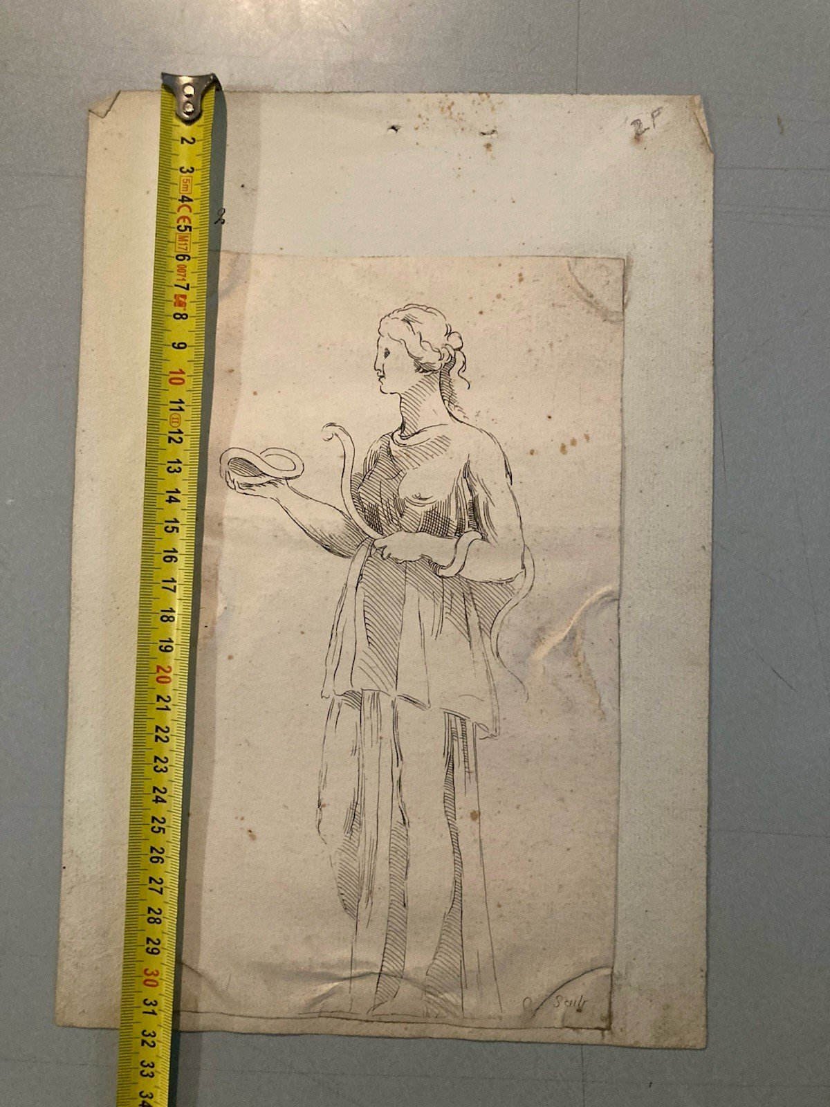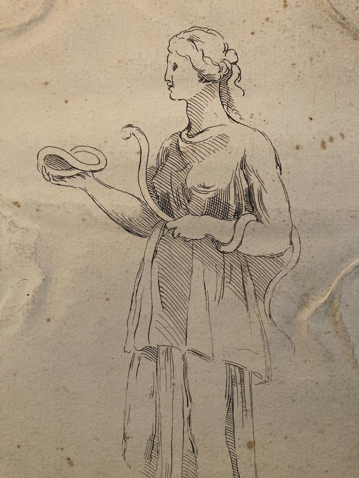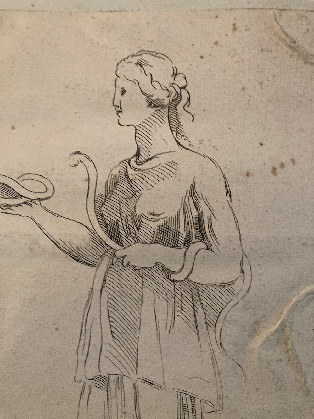 Drawing Dessin Encre XVIIIe d’ Hygie (Hygieia) Grec Grecque Santé Serpent Old