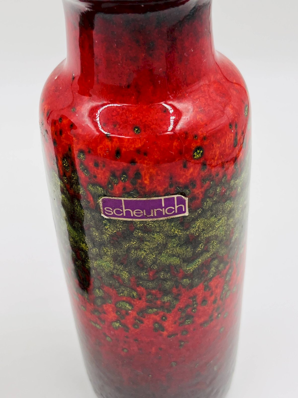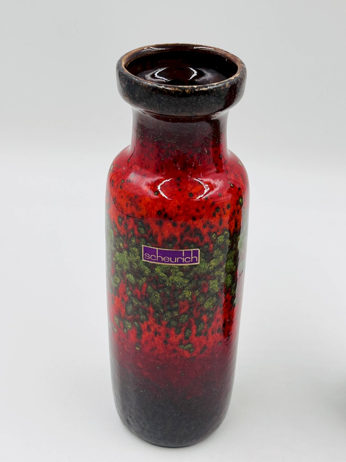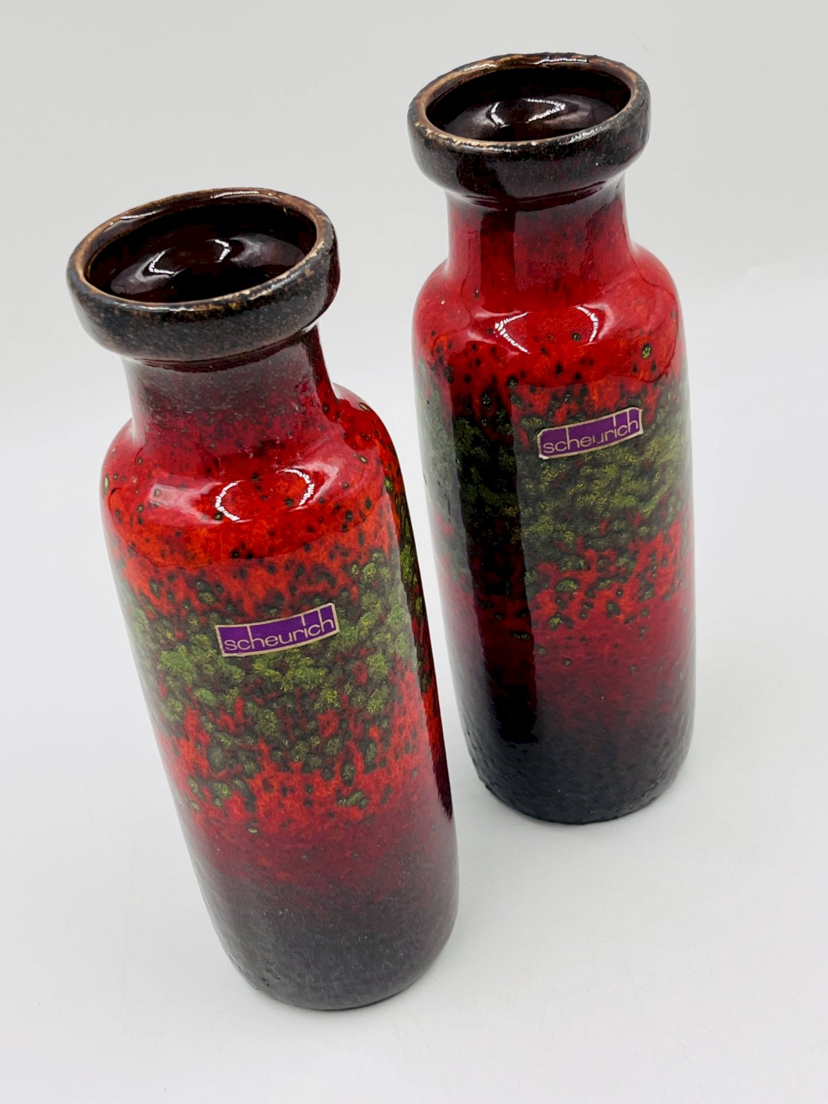 Ces vases en céramique arborent un émail rouge et vert saisissant, créant un effet visuel captivant qui sublimera n'importe quelle pièce.Fabriqués par Scheurich en Allemagne de l'Ouest dans les années 70, ces vases sont réputés pour la qualité de leurs céramiques.Leur palette de couleurs vives, rouge et vert, apporte une touche dynamique à votre décoration intérieure.Idéals pour présenter des fleurs fraîches ou comme pièces décoratives indépendantes.Apportez une touche d'élégance vintage à votre intérieur avec ces magnifiques vases Scheurich.