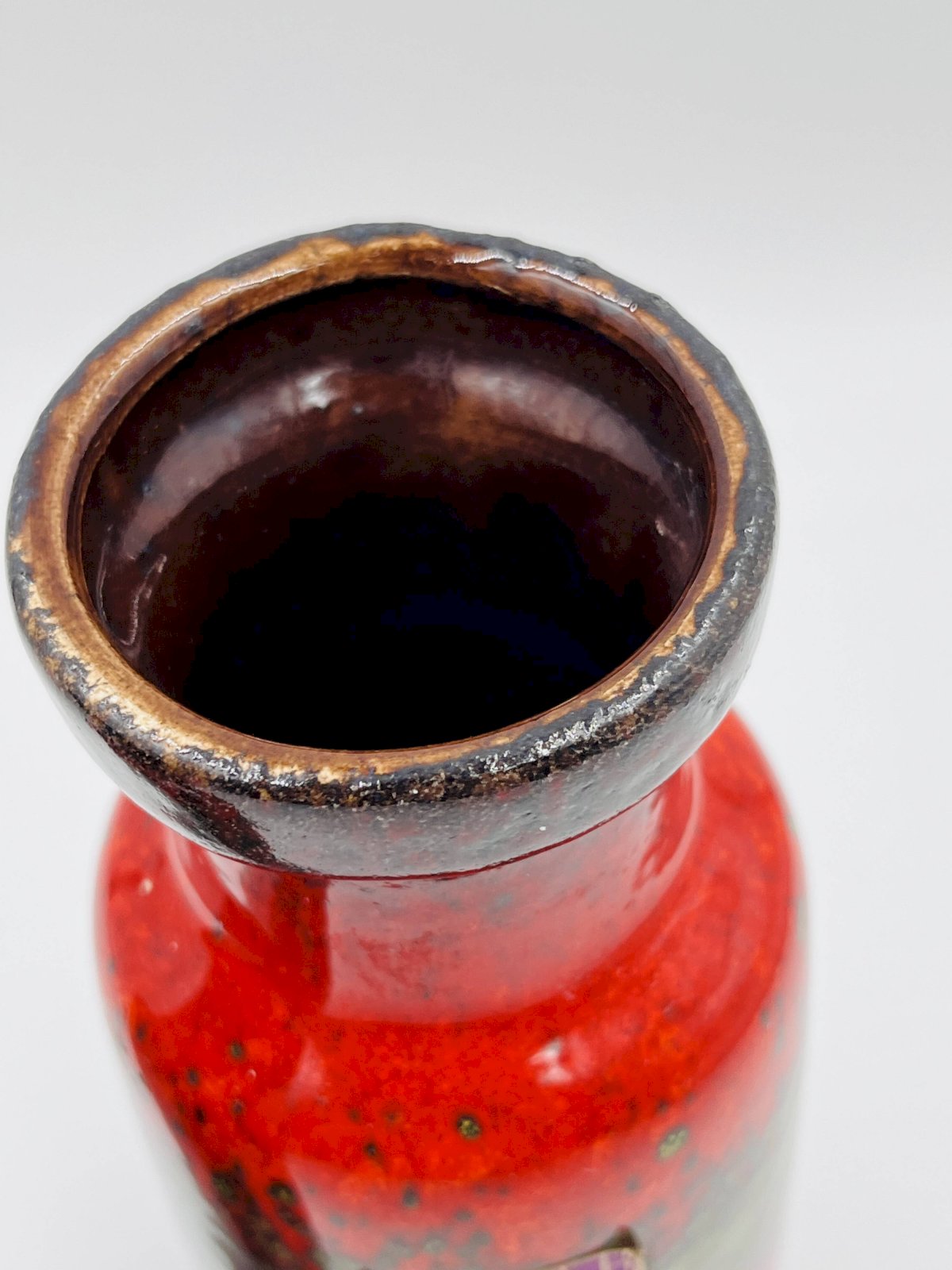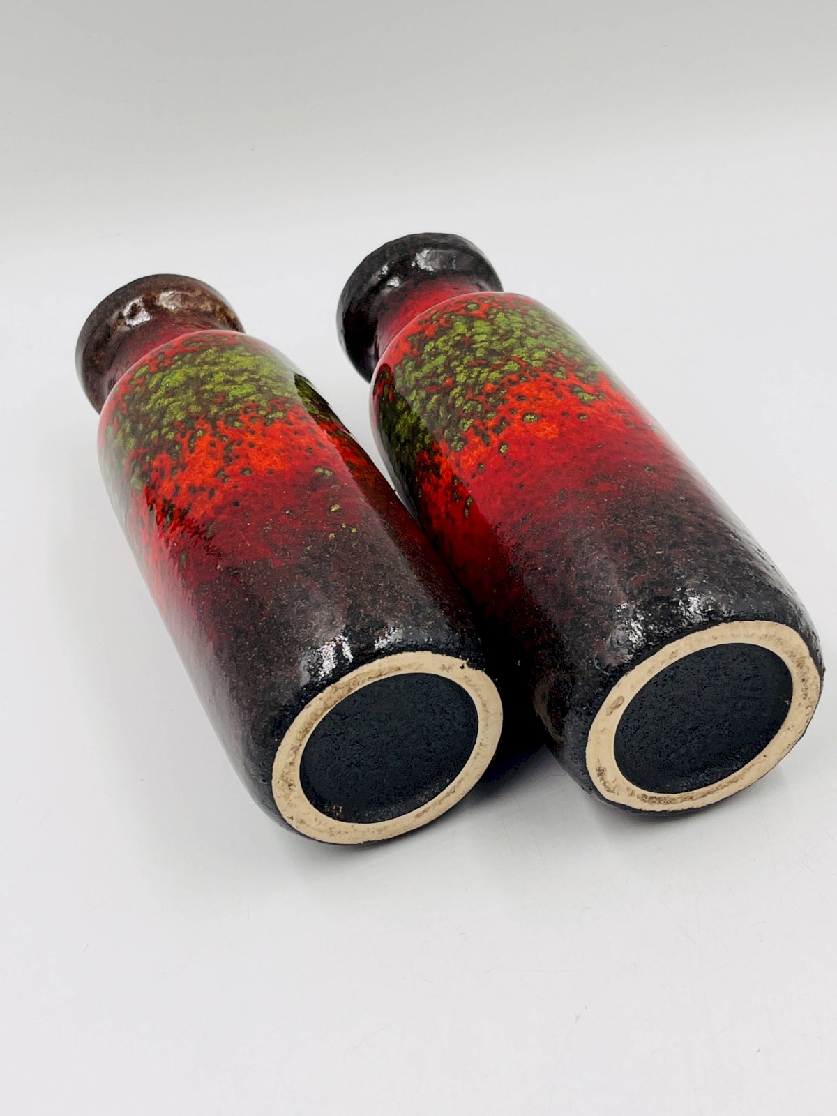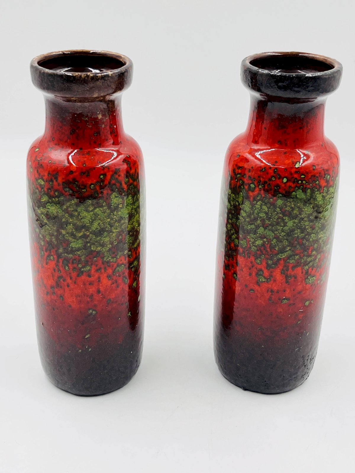Ces vases en céramique arborent un émail rouge et vert saisissant, créant un effet visuel captivant qui sublimera n'importe quelle pièce.Fabriqués par Scheurich en Allemagne de l'Ouest dans les années 70, ces vases sont réputés pour la qualité de leurs céramiques.Leur palette de couleurs vives, rouge et vert, apporte une touche dynamique à votre décoration intérieure.Idéals pour présenter des fleurs fraîches ou comme pièces décoratives indépendantes.Apportez une touche d'élégance vintage à votre intérieur avec ces magnifiques vases Scheurich.