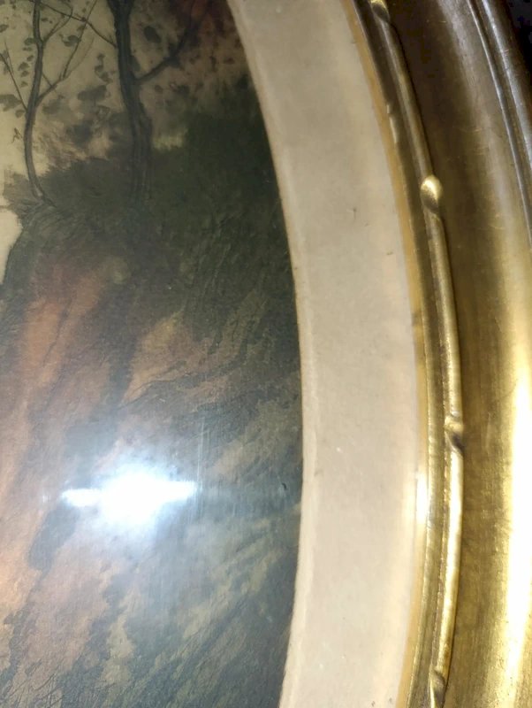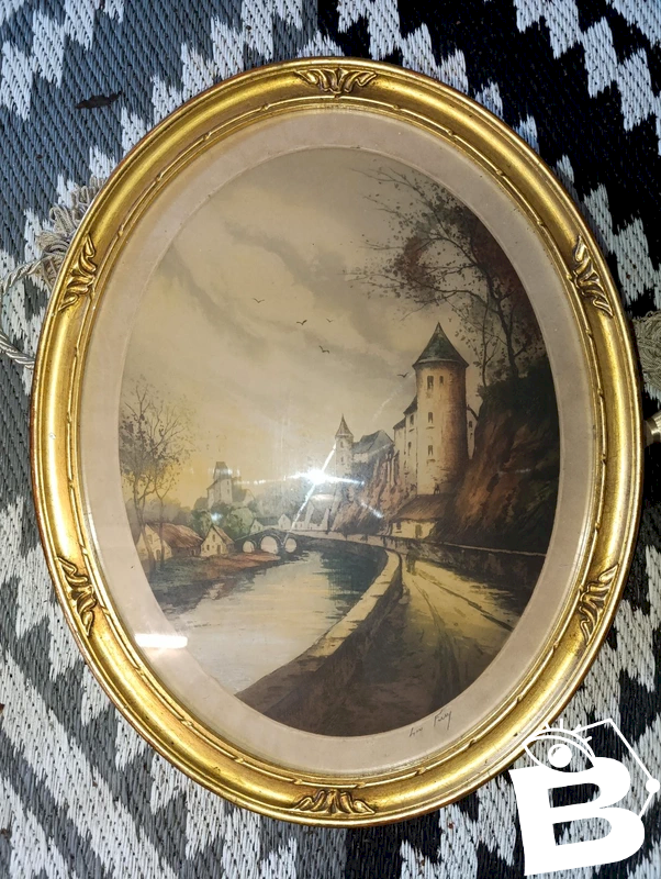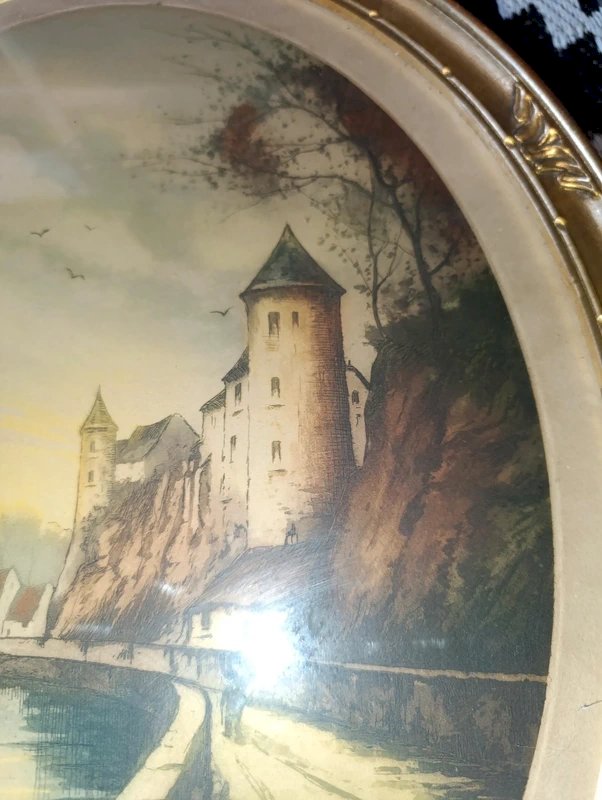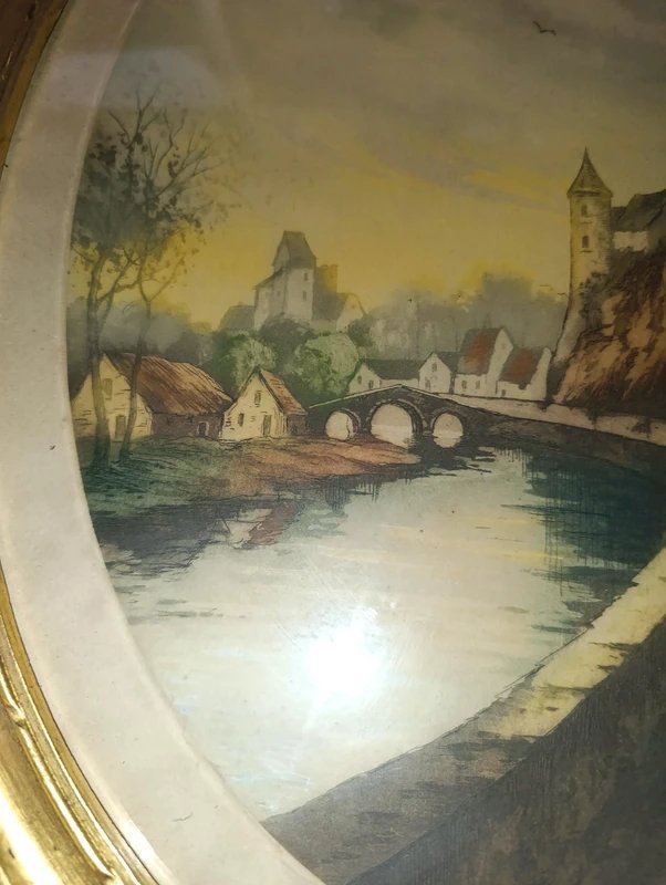 eau forte ou gravure à decor de ville (paysage) signature à identifier en bon etat beau cadre style ancien couleur un peu attenue par le temps dimension 50X40cm