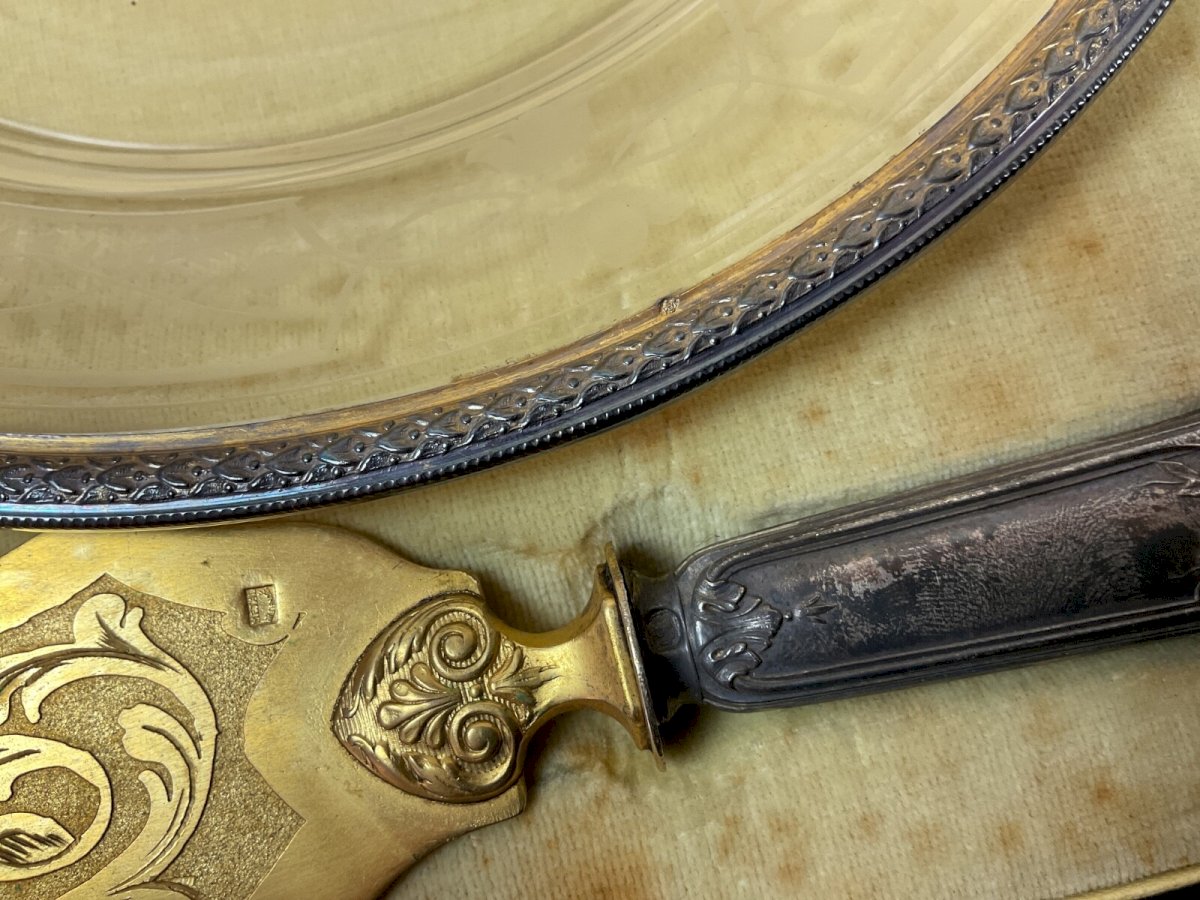 écrin de service à dessert  argent Minerve fourrer et cristal Diamètre de l assiette : 22 cm Authenticité:Original Type:Art de la table, Cuisine Origine:France Sous-type:couverts de service Matière:Argent massif
