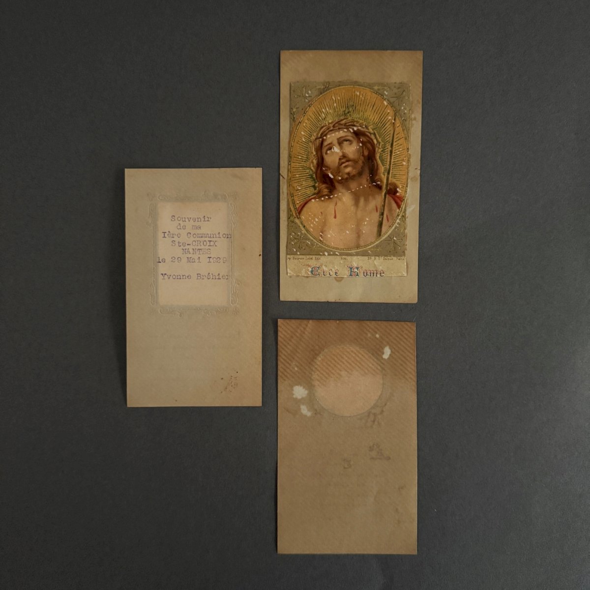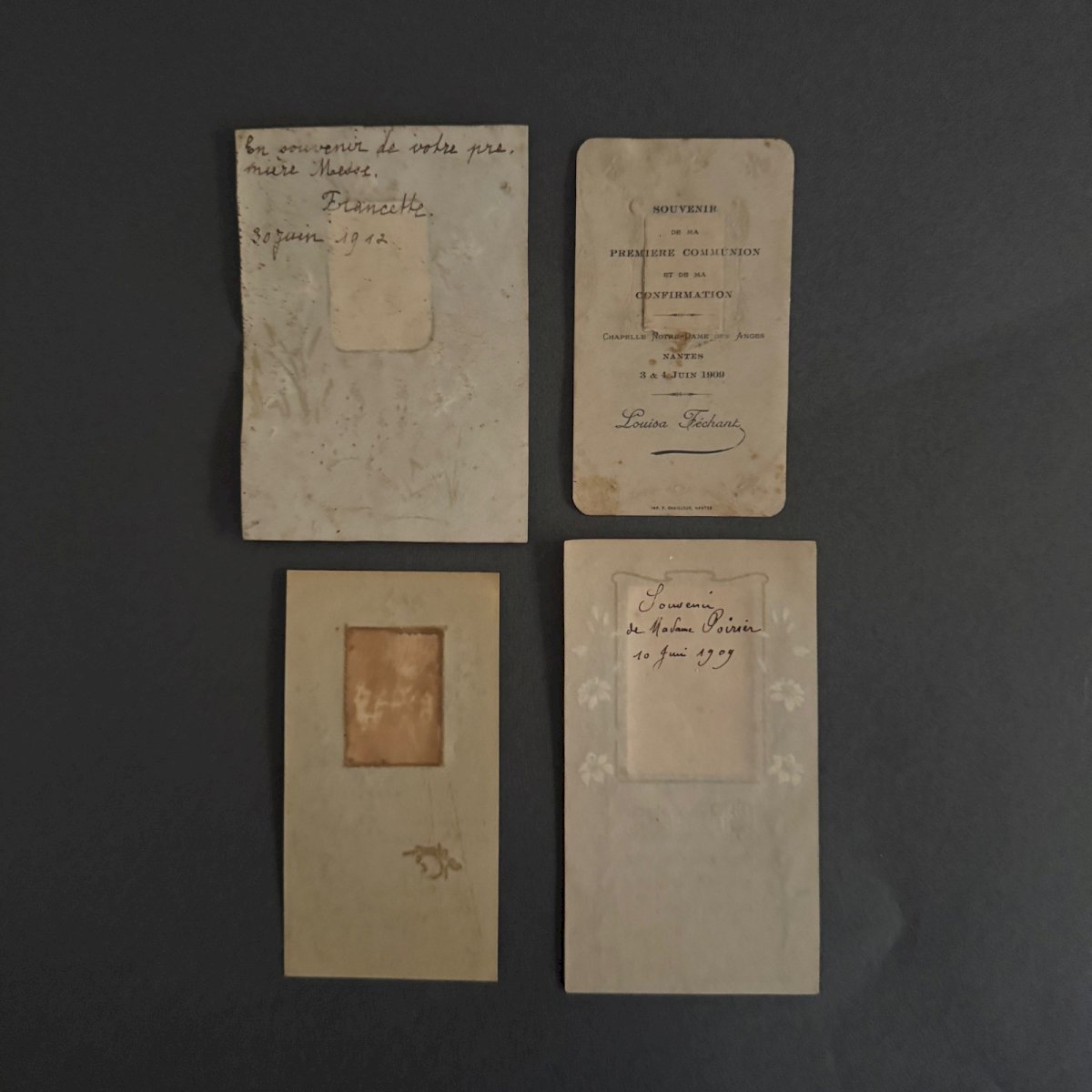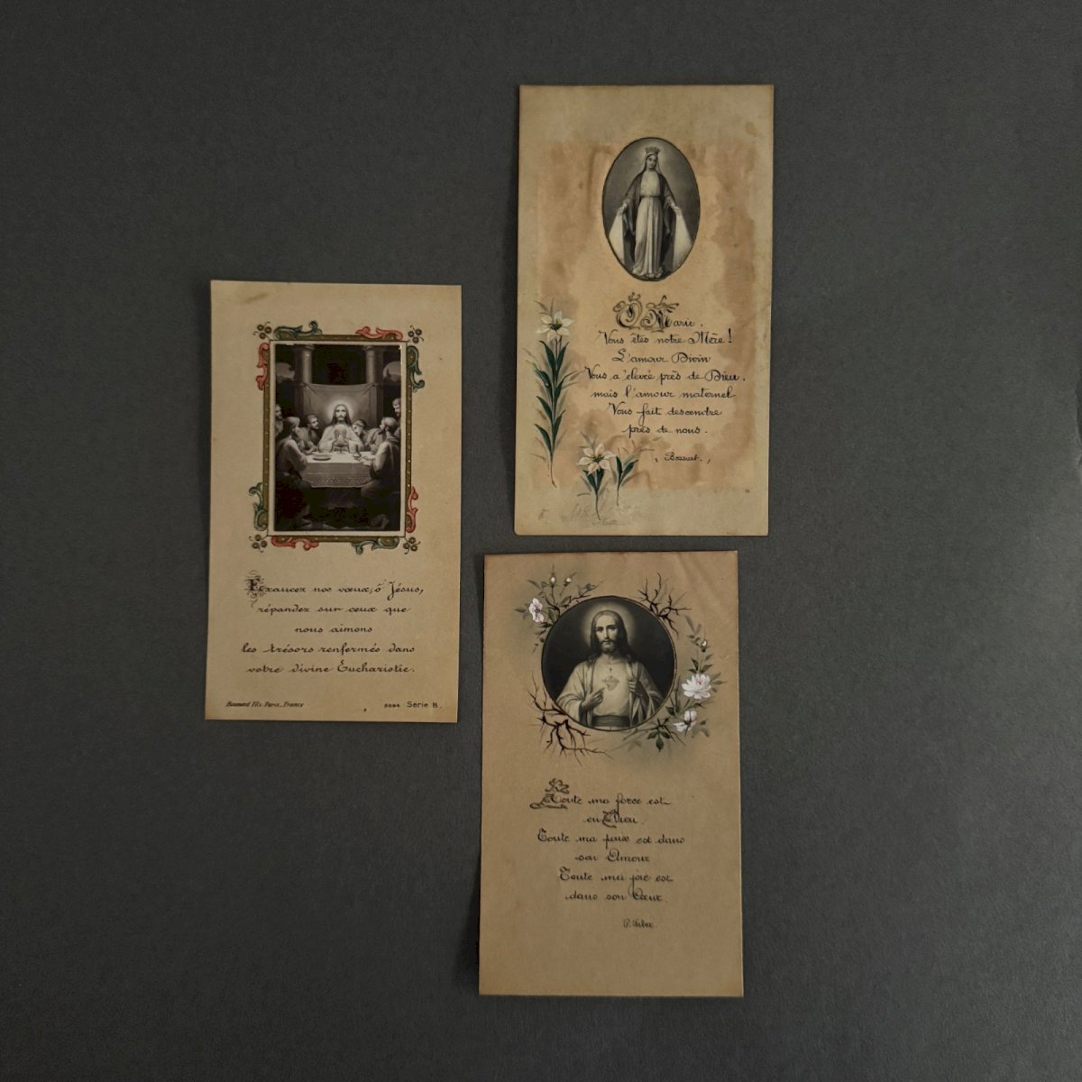 Lot de 7 images pieuses XIXe A5782 Nous vendons l'ensemble de ces images pieuses rehaussées en couleur. Nous signalons un léger jaunissement par endroits, de minimes taches, cependant l’ensemble reste dans un état tout à fait présentable. Nos photos vous permettent d'apprécier la qualité de l'objet. Pour l'état, merci de bien détailler les photos. N'hésitez pas à zoomer . Les photos font partie intégrante de la description. Dimensions : - la plus grande Hauteur : 12,3 cm Largeur : 7 cm - la plus petite Hauteur : 10,3 cm Largeur : 6,3 cm   Je reste à votre disposition pour toute question. État:OccasionObjet ayant été utilisé. les éventuelles imperfections. Type:Christianisme Sous-type:Images pieuses Pays d'origine:France Matière:Papier, Carton