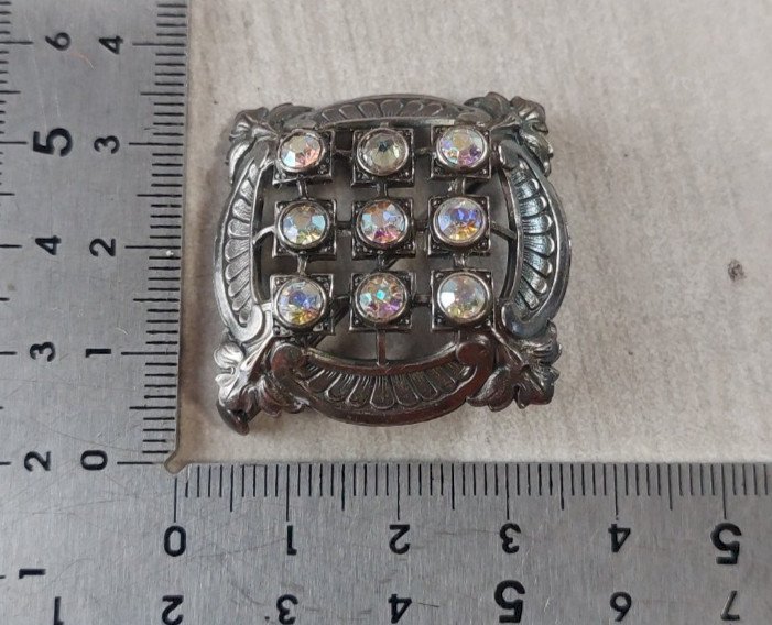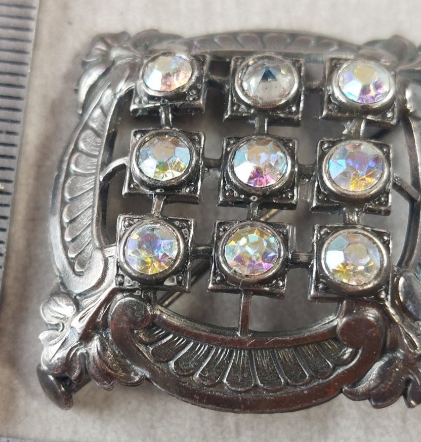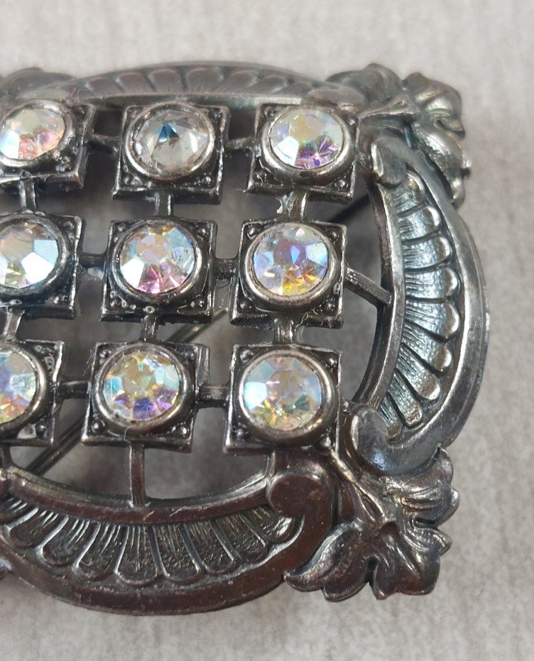 Ancienne broche en métal argenté et strass, vintage