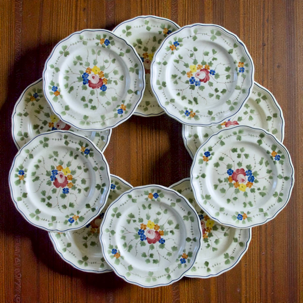 Set of 10 large and beautiful vintage flat plates stamped Longchamp, Nemours collection. Sublime multicolored floral decor delicately hand-painted, small flowers in yellow, blue, raspberry, and ochre, scalloped edge. They are thick and durable, high-quality plates. Large in size, they are in very good condition.
