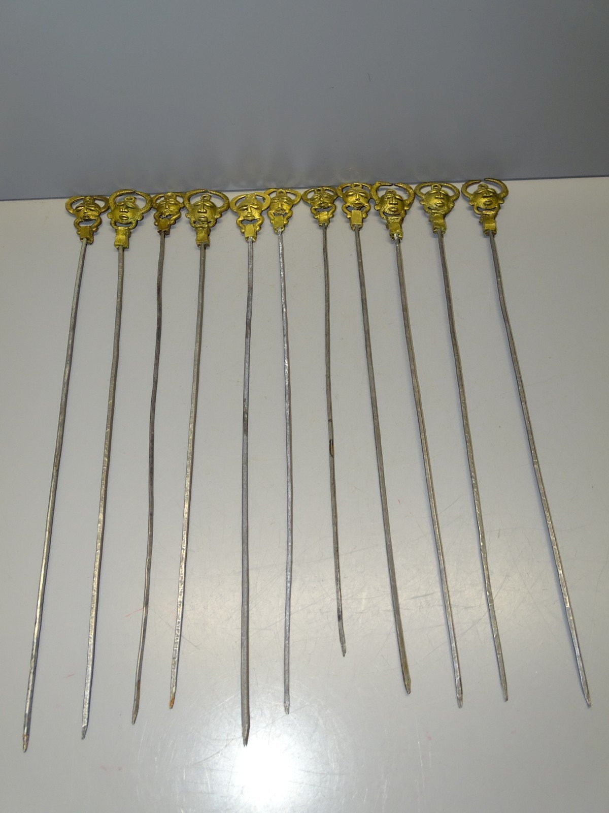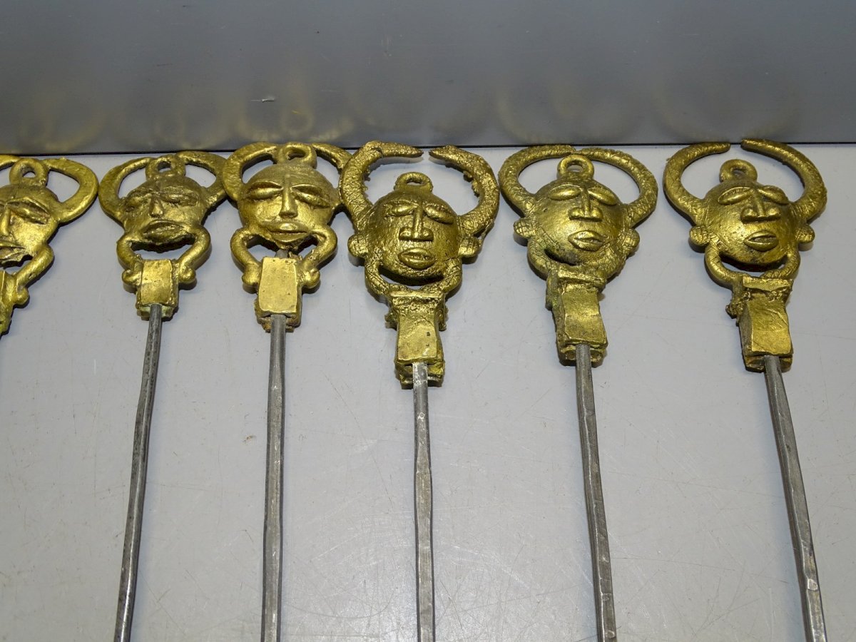 11 African skewers with bronze masks as hand grips - they are handmade and each one is different (see photos) - attic finds - in usable condition - Ref. 42141025/98 - Length from 42.6 cm to 38.2 cm - Weight 0.470 kg - To contact me, my email address is: SHIPPING POSSIBLE VIA MONDIAL RELAY or COLISSIMO upon request, VERY GOOD PACKAGING GUARANTEED. PLEASE TAKE A GOOD LOOK AT ALL THE PHOTOS as THEY ARE AN INTEGRAL PART OF THE DESCRIPTION and ALLOW YOU TO SEE THE ITEM AT ITS BEST.