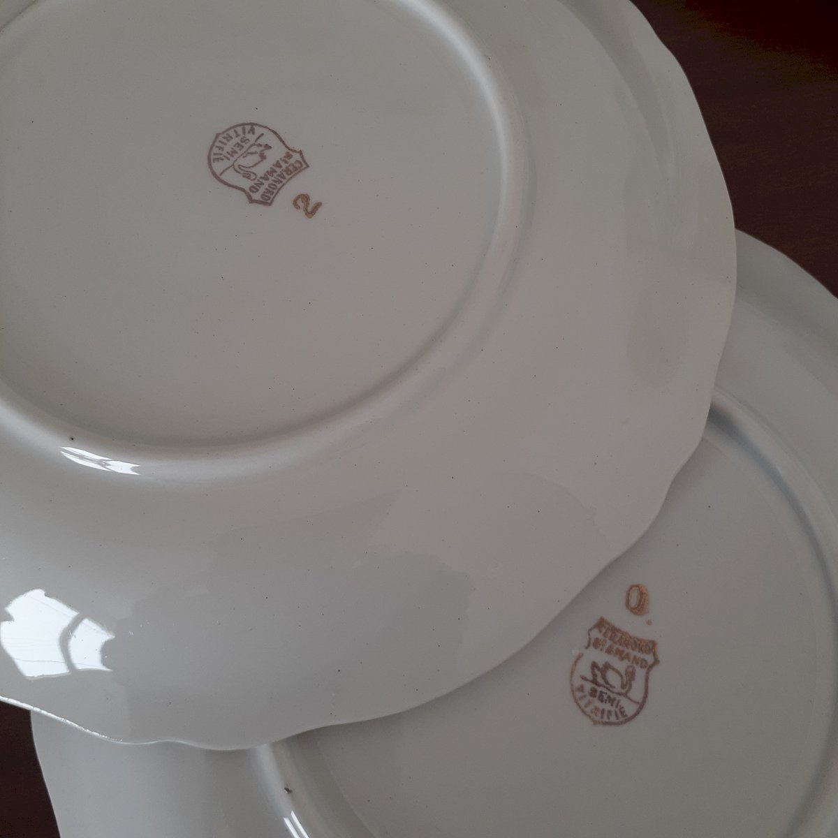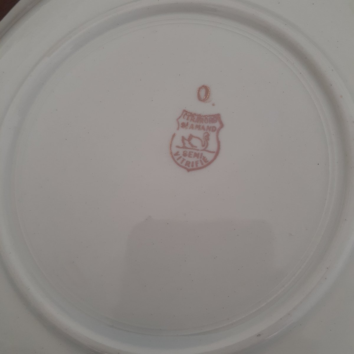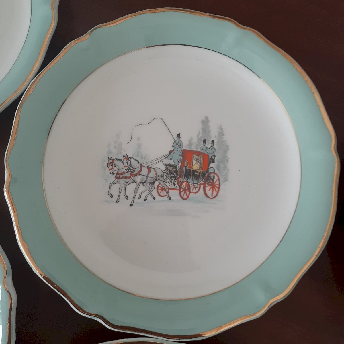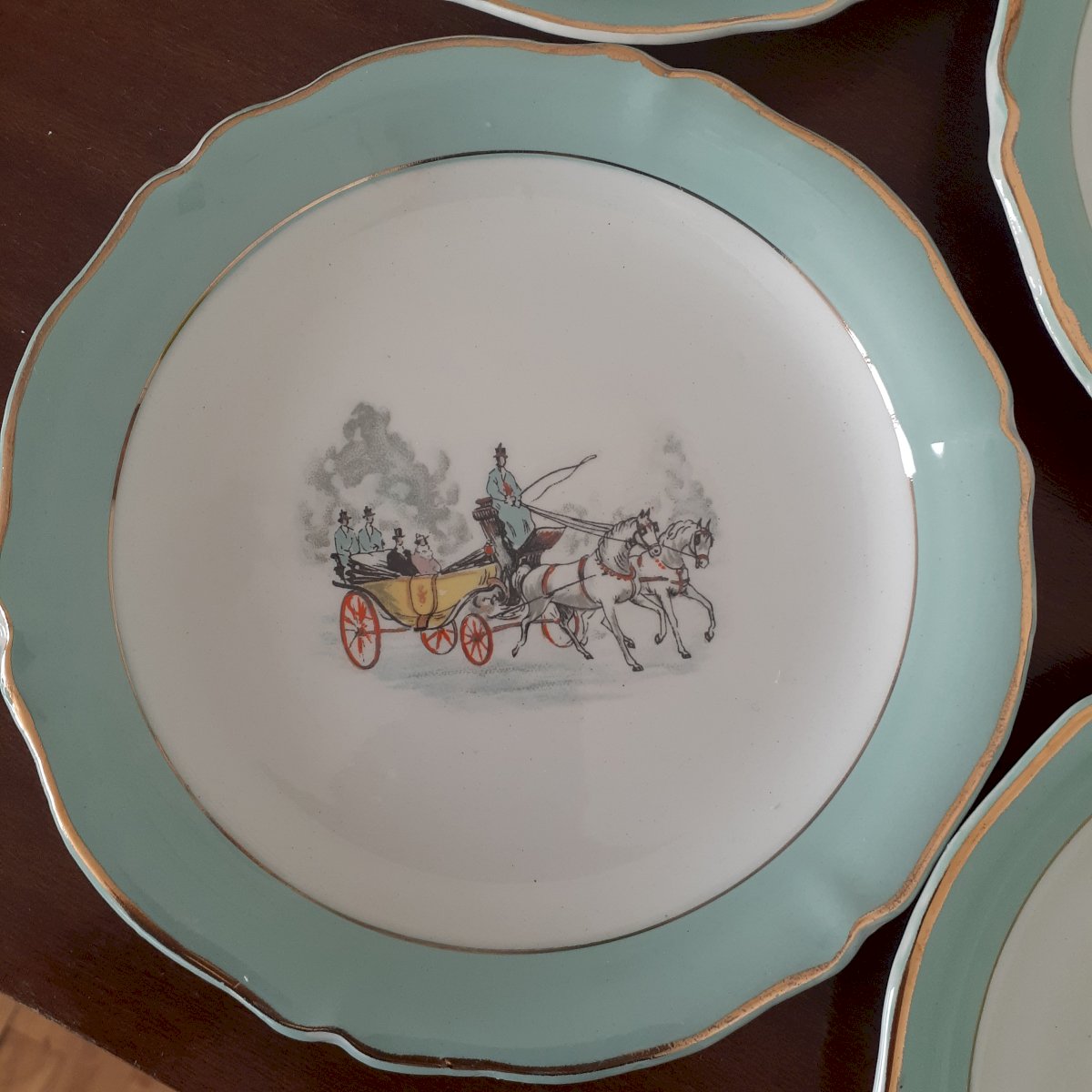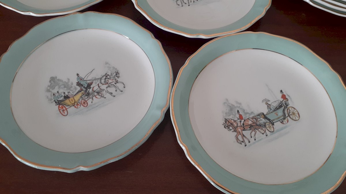Pretty set of 12 antique dessert plates in Limoges porcelain, green and gold trim, featuring patterns of 4 different coach designs. Stamped Ceranor St Armand semi-vitrified. Signs of wear on the edge, the green is faded but the gold trim is clearly visible. Some plates show more wear than others. This service is of great delicacy.