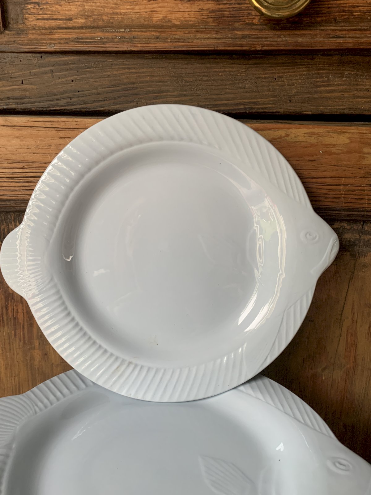 In perfect condition, a set of twelve vintage fish-shaped plates, blue ceramic, 1930s, stamped Sarreguemines France.