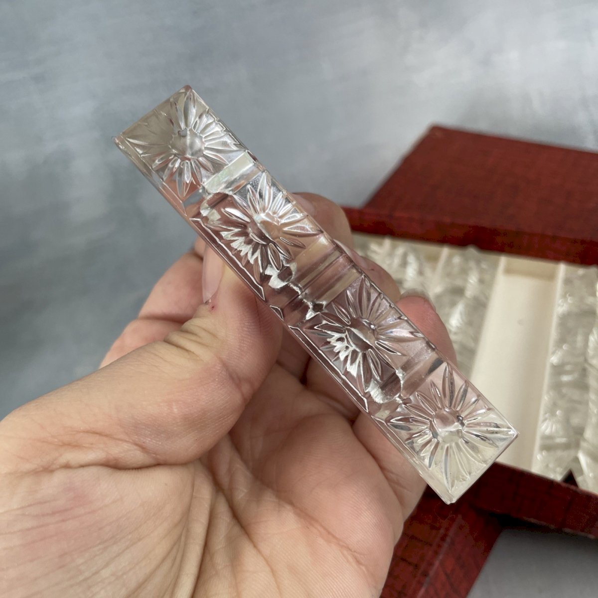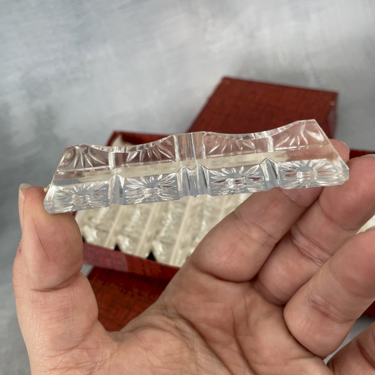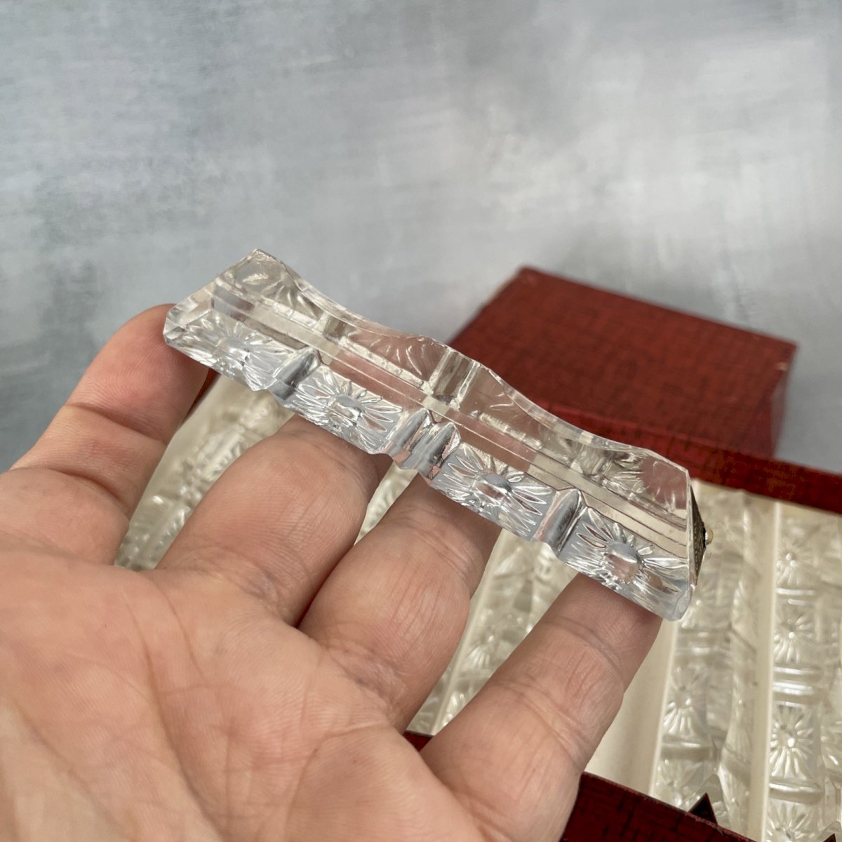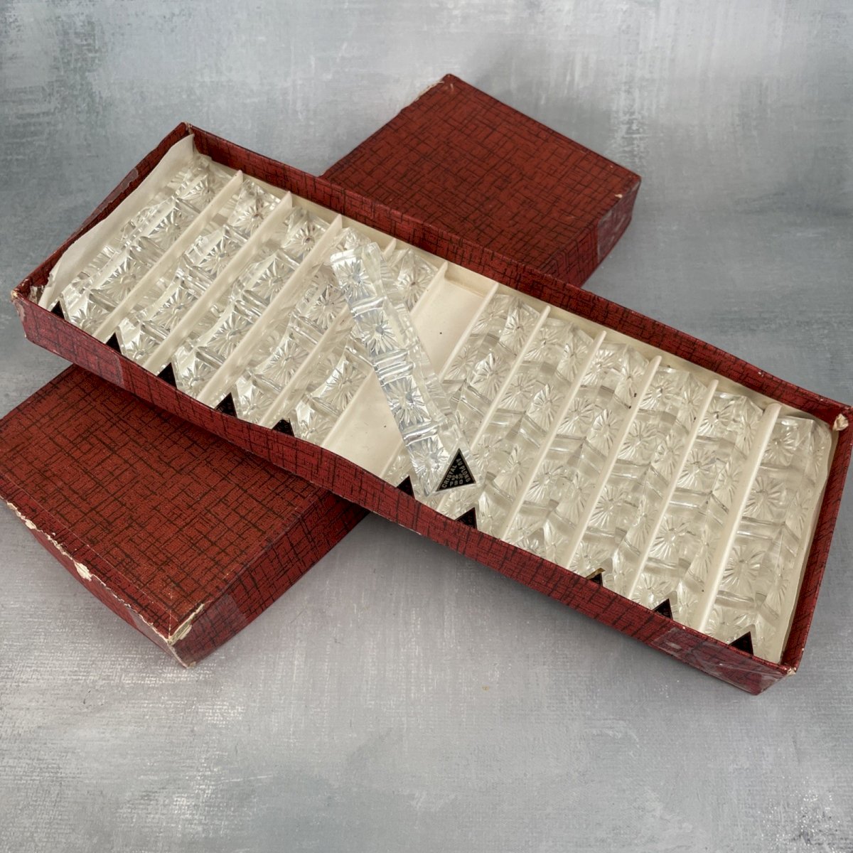 12 metal silver-plated knife rests 6gr from CHAMBLY France 12 triangular 24% lead crystal knife holders with flower background Dimensions ~ 9 x 1.7 cm Total weight ~ 0.6 kg Excellent condition (missing 3 original labels), box damaged, see photos. Consider grouping your purchases to reduce shipping costs!