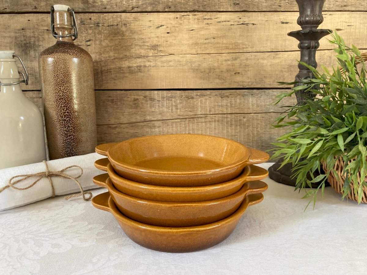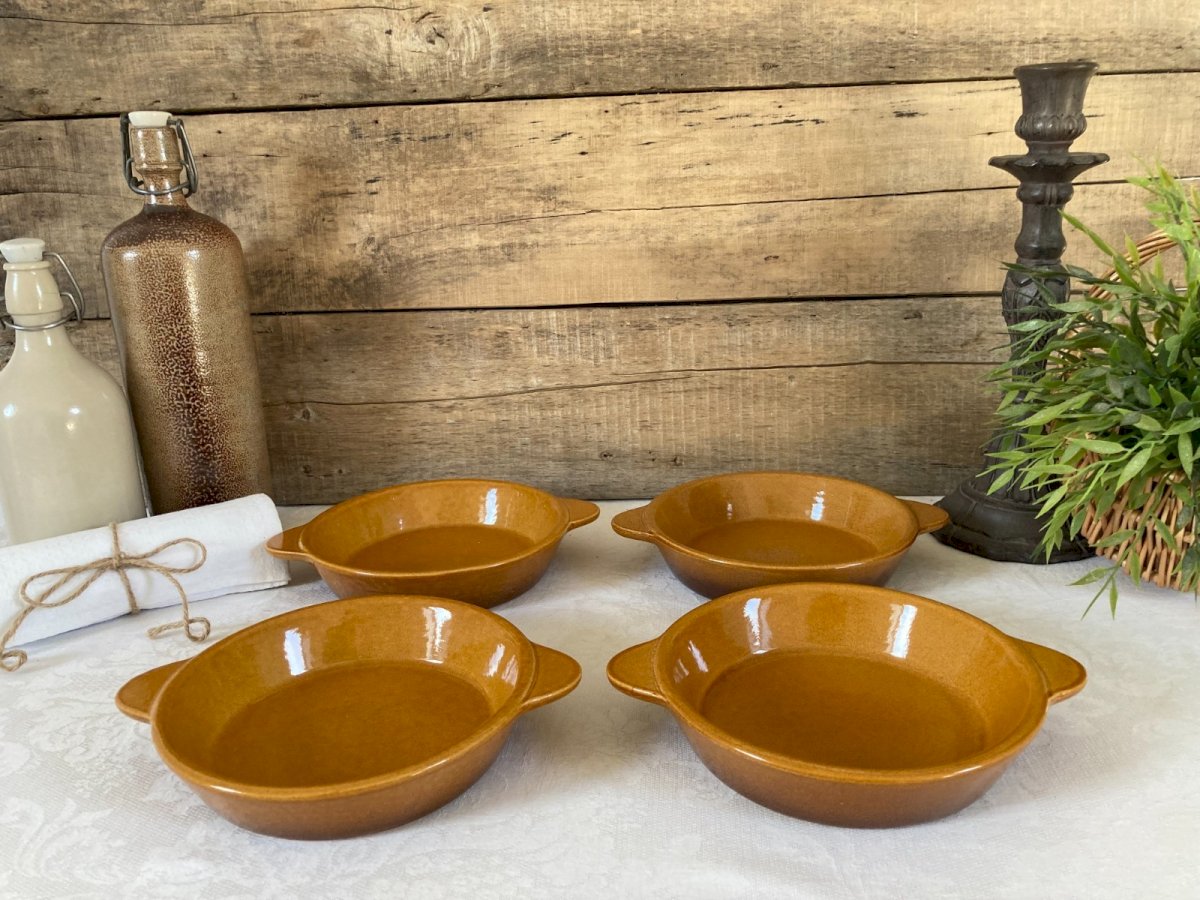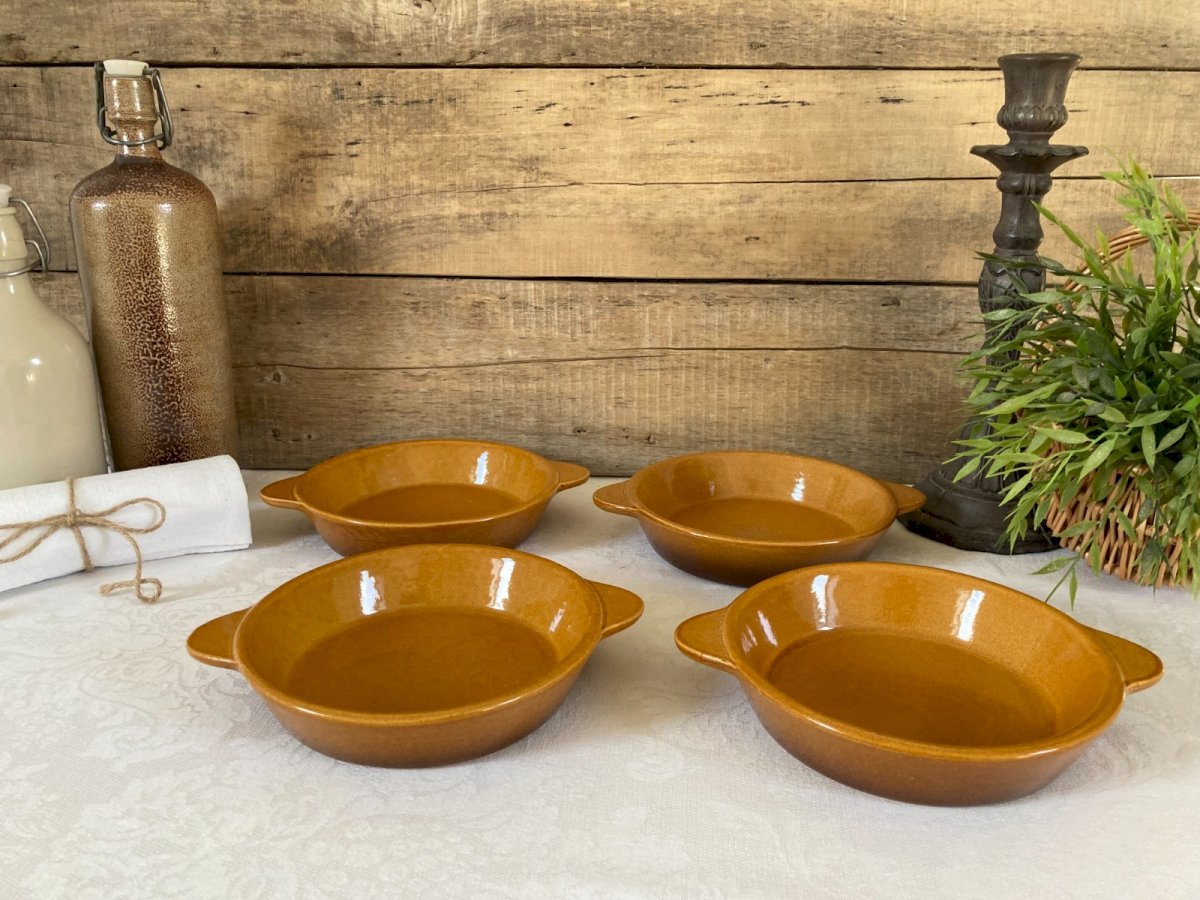 ⚜️ Four Vintage Round Gratin Dishes Emile Henry France in Stoneware ⚜️ Diameter 17 cm, Height 4 cm Condition: Used: Item has been used. Item shows some superficial signs of wear, ...Used: Item has been used. Item shows some superficial signs of wear, fully operational and functioning correctly. It may be a demonstration model or an item returned to the store after a short period of use. any possible imperfections. Brand: Emile Henry Country of origin: Metropolitan France Shape: Round
