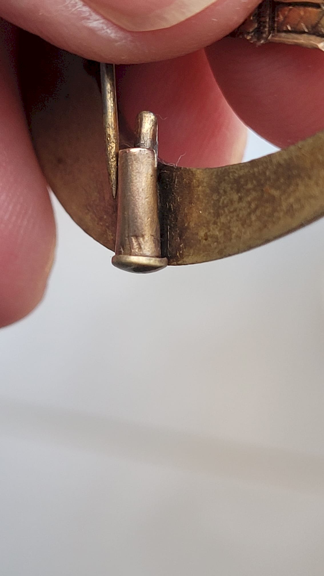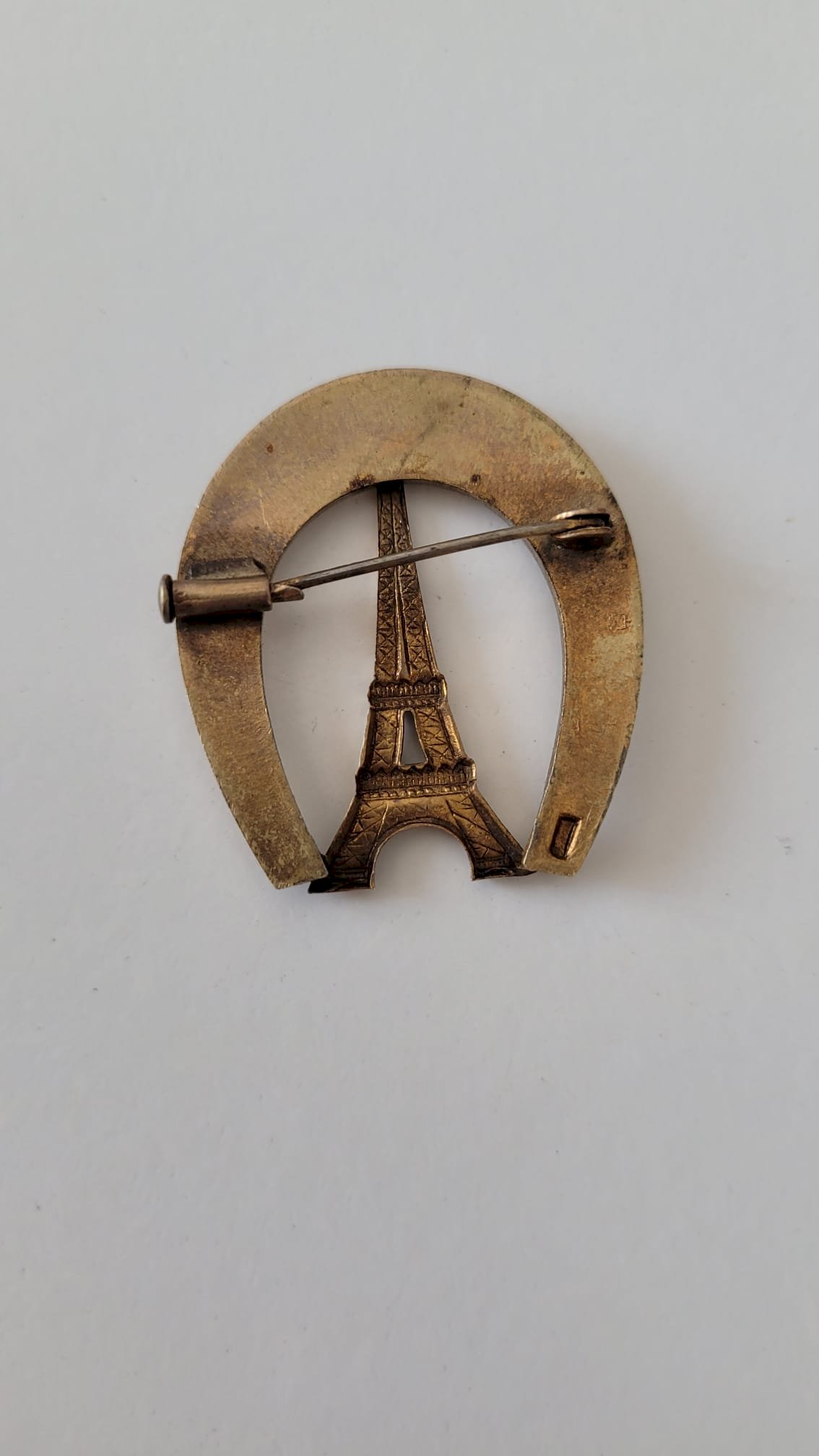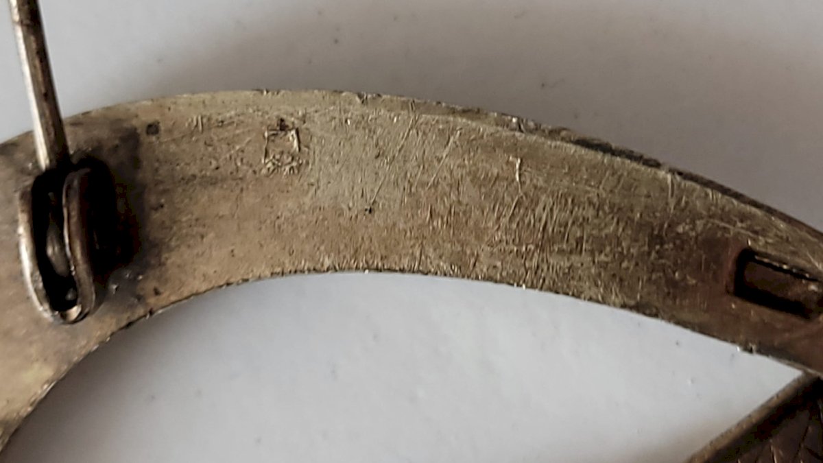 The closure system (simple pin with an old hinge and a "C" hook without complex safety) suggests a manufacture dating from the first half of the 20th century, possibly between the 1920s and 1950s. It is a typical object of souvenir craftsmanship from that period.