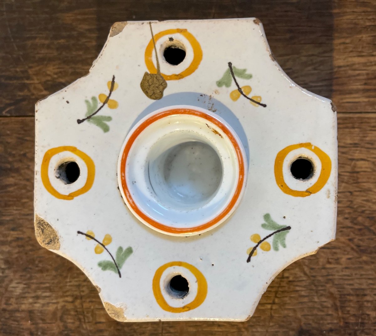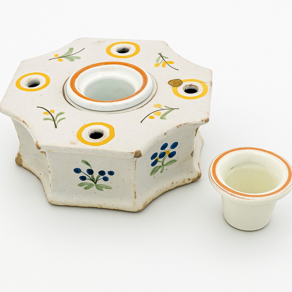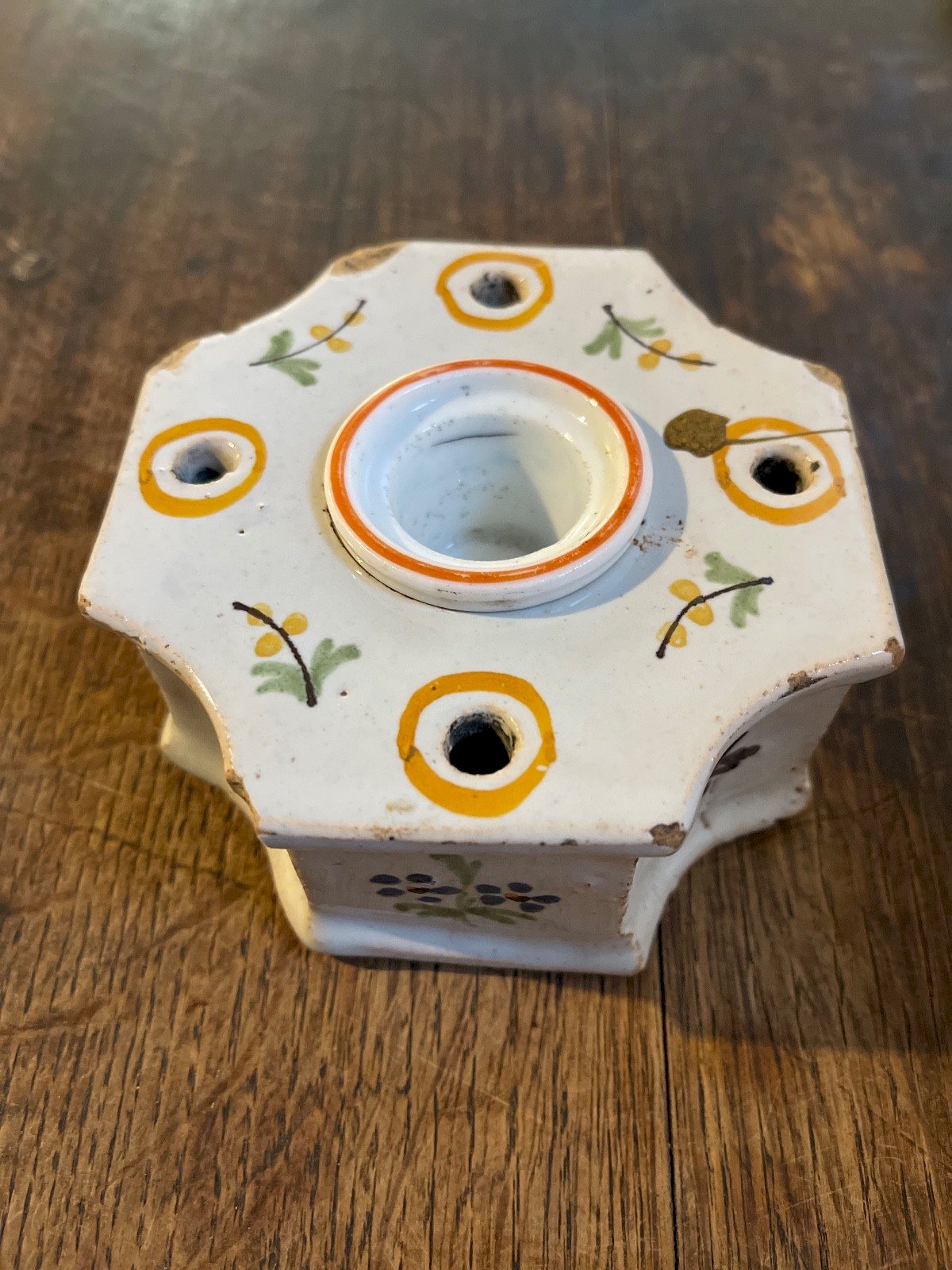 Charming an inkstand made of earthenware from the Centre of France, attributed to the manufacture of Auxerre or Ancy-le-Franc, circa 1760–1780. Hand-painted decoration of small stylized flowers and yellow rings on a cream background, typical of 18th century productions. This six-sided inkstand retains its original reservoir, a rarely preserved element. An authentic and charming piece, both a testament to the art of living in the Age of Enlightenment and a beautiful decorative curiosity. Dimensions: Length: 11 cm Width: 10.7 cm Height: 4.5 cm Diameter of the central hole: 3.7 cm Condition: in good overall condition with some chips and surface wear, visible in the photos. In its original state, without restoration. Carefully packaged and securely shipped, with professional wrapping. Country of origin: France.